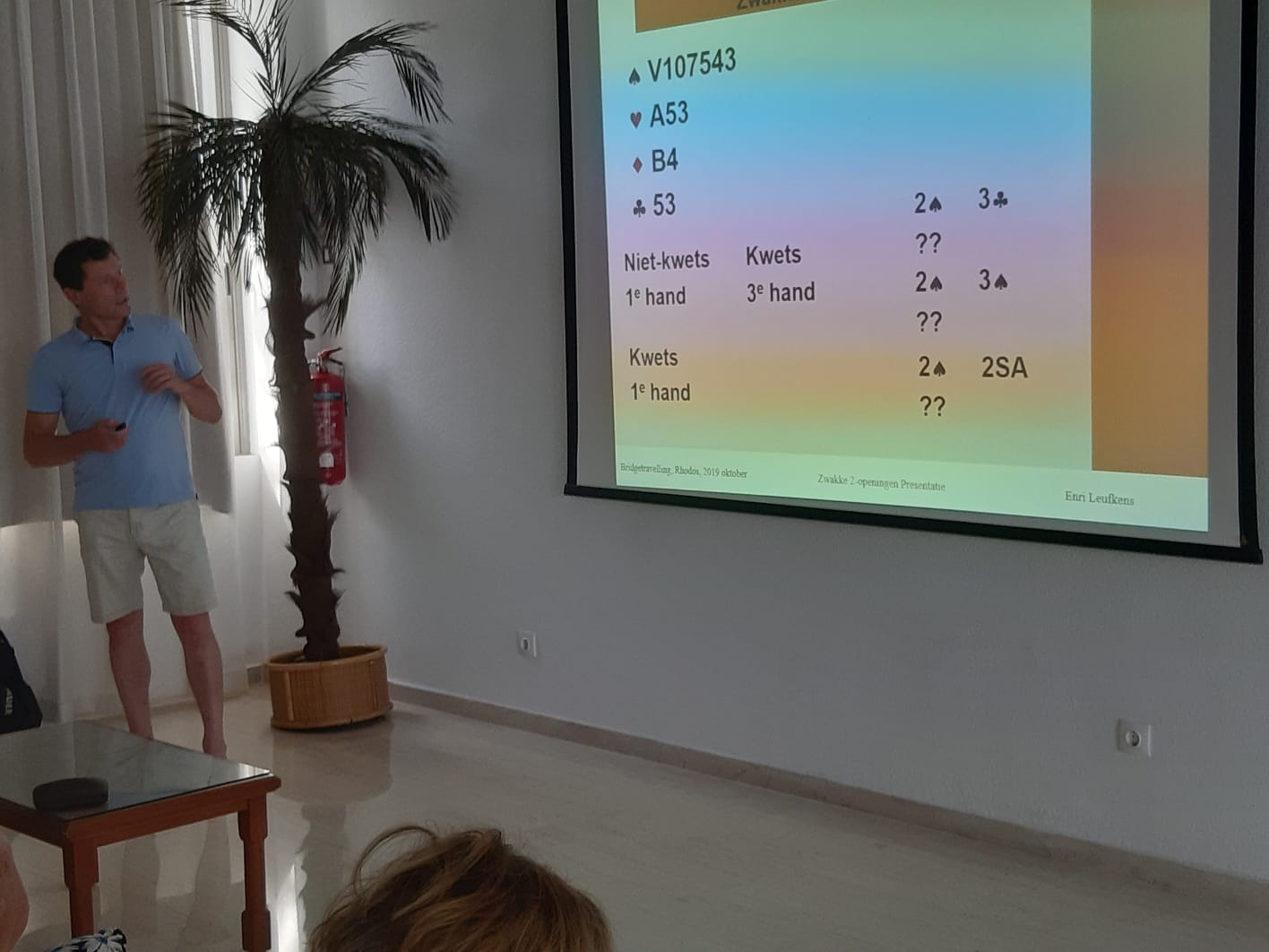 De groep zit tegen 10.30 uur weer enthousiast klaar. De les begon met het behandelen van de gestoken spellen op dinsdagavond; het preëmptieve bieden. De tip die Enri meegaf na het doornemen van dit thema; als je zo hoog biedt, doe het dan niet met een piepstemmetje, maar bied als een vent!! Hierna ging hij verder met de zwakke-2 openingen. Veel vragen werden gesteld tijdens en na de les. Niet alles kon worden beantwoord, hiervoor verwees Enri naar het ‘zwembadje’ om 17.30 uur. Het verslag is te lezen onder de volgende link: Zwakke 2-openingen