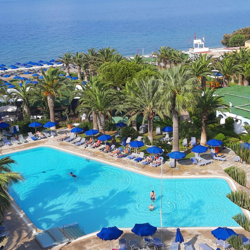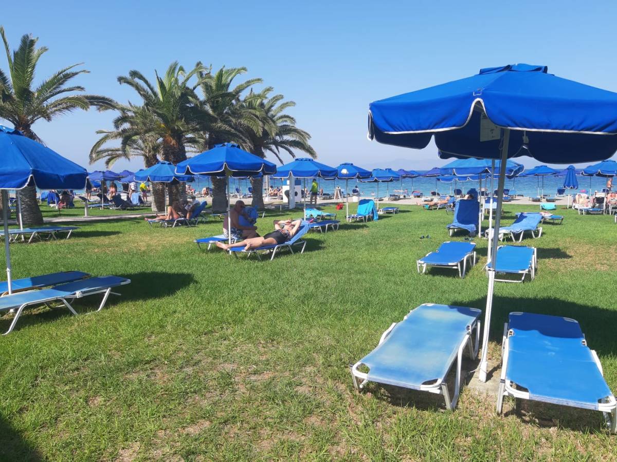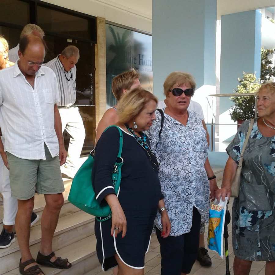 Jan en ik (Jacqueline) hebben al aardig wat keertjes de reis naar Rhodos begeleid. Het is altijd thuiskomen en het welkom door het personeel (1e afbeelding) is weer hartverwarmend. Vandaag gaan we rond het hotel de boel opnieuw verkennen. De bloemen staan weer te kleuren en te geuren. We bezoeken het strand, het zwembad, liggen wat te luieren, lopen de afspraken en preferenties na en na het diner zetten we een 4-talletje op. Leuk voor de al aanwezige gasten.