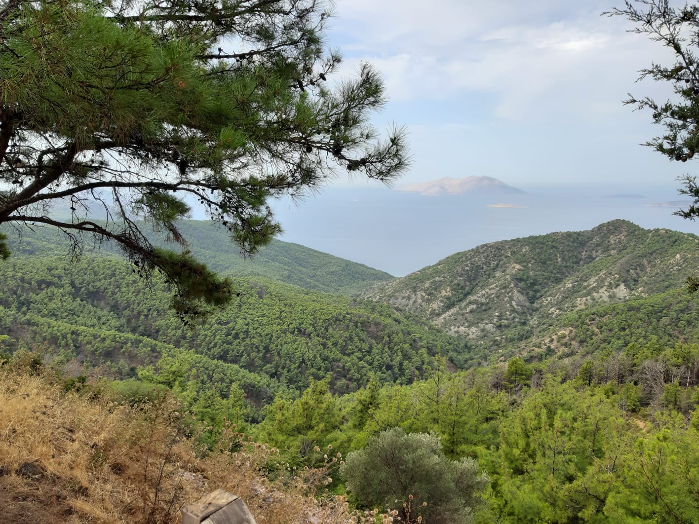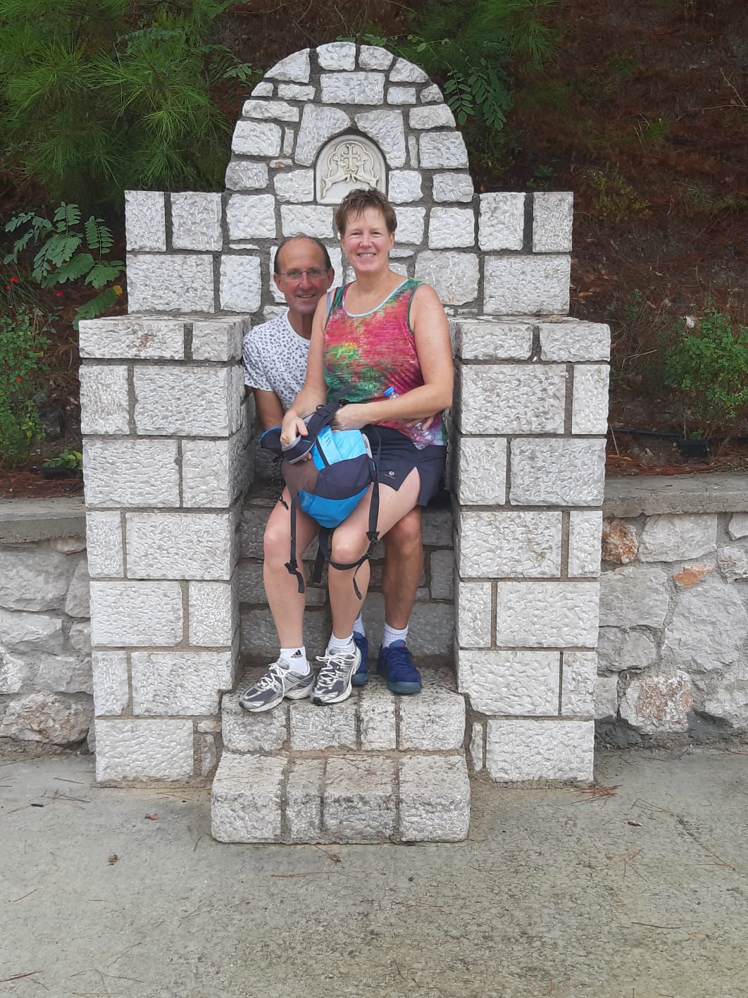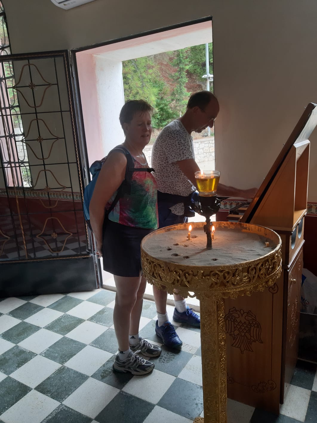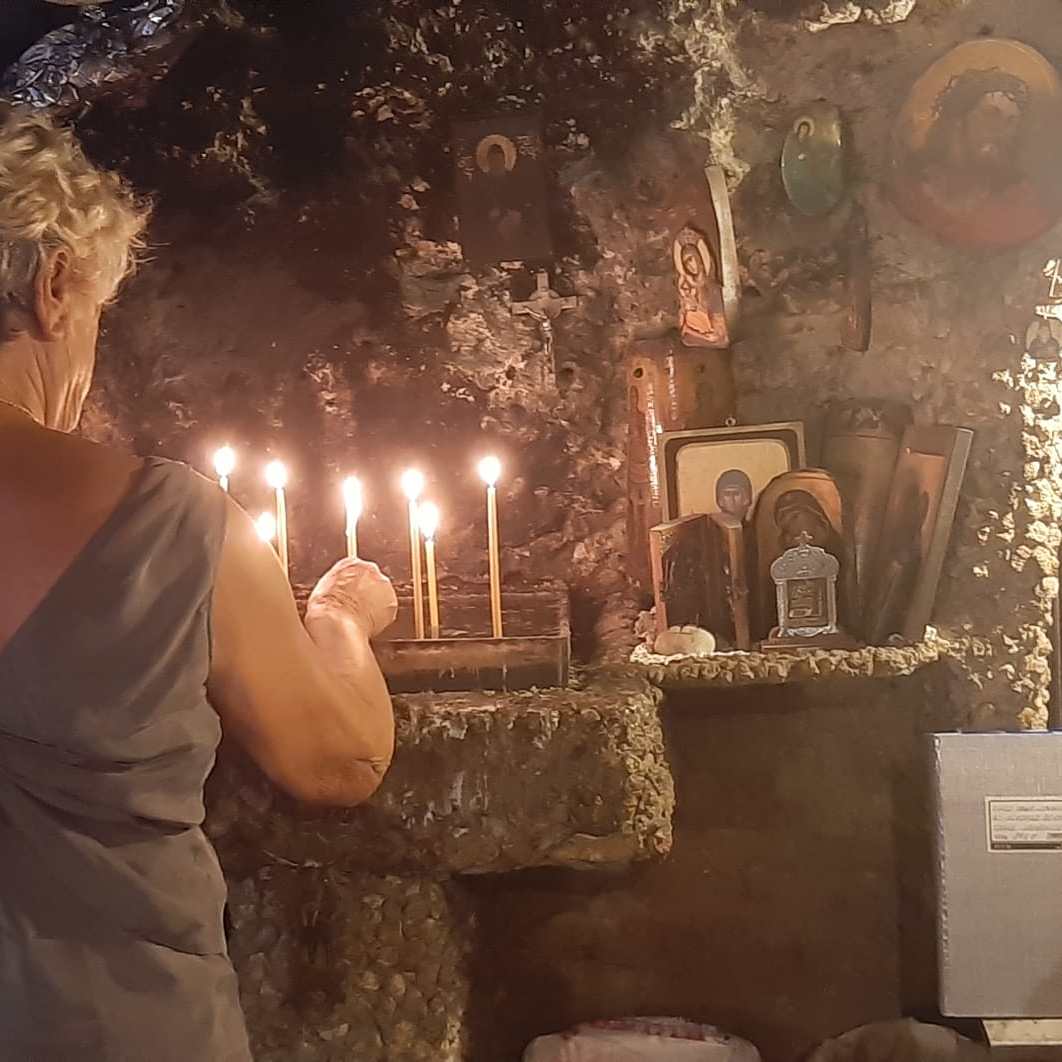 Met Leo en Bianca ben ik, Jacqueline, na de lunch vertrokken om de berg naar het grote kruis op te klimmen, de Filérimos heuvel. Een half uur lopen tot het begin van de berg en dan een stukje klimmen naar een hoogte van 650 meter. In de kerk steken we een kaarsje op en bij de kiosk drinken we een zevenkruidendrankje. Vandaag is het wat regenachtig maar morgen is er weer volop zon.