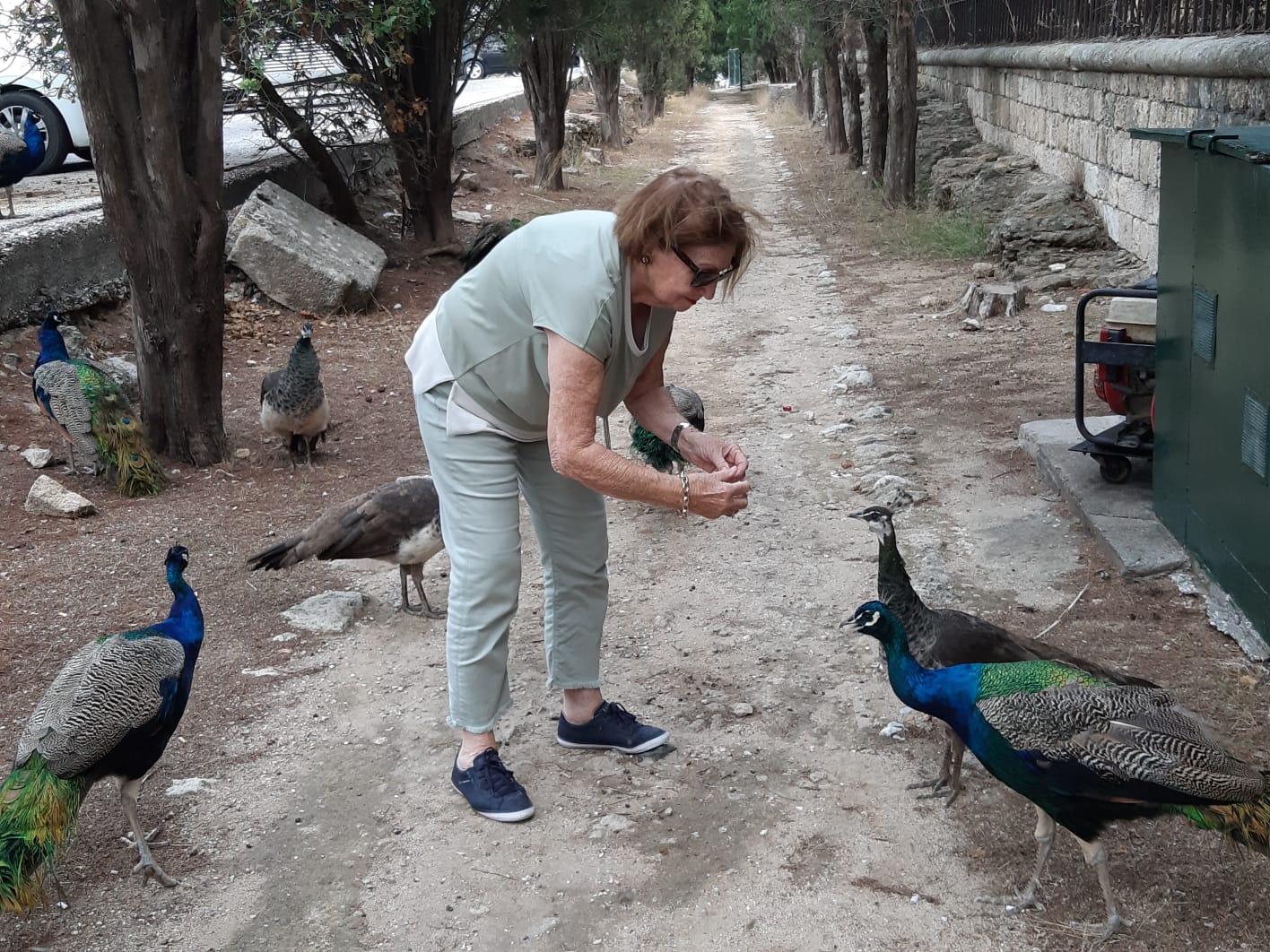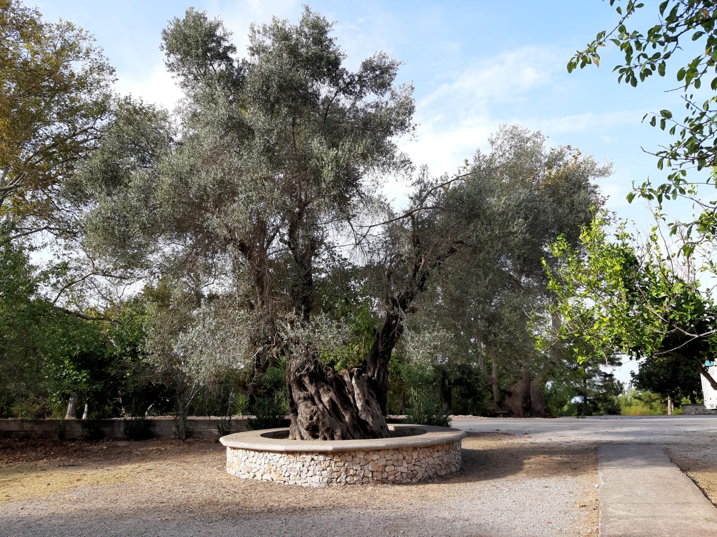 Inez onze gids en bekend van vorige reizen neemt ons mee naar prachtige plekjes. We rijden eerst naar Filerimos. Het klooster van Panagia Filerimos ligt op een heuvel en is gewijd aan de heilige Maria, de bron van het leven. Voor je het klooster wilt gaan betreden zie je rechts een mooi laantje in de schaduw. Het is de zogenaamde kruisweg. Na een 200 meter kom je via een stenen trap bij het grote betonnen kruis.