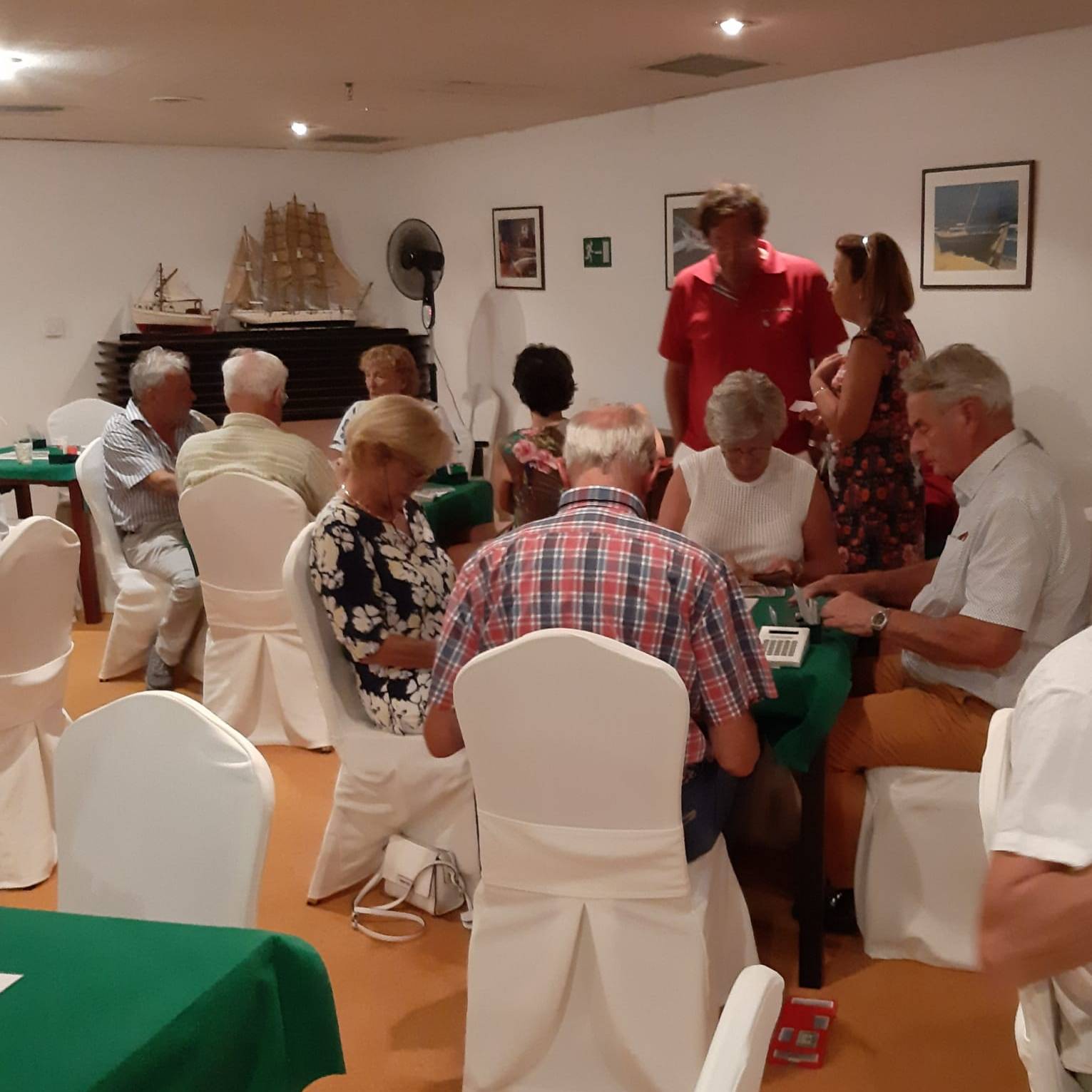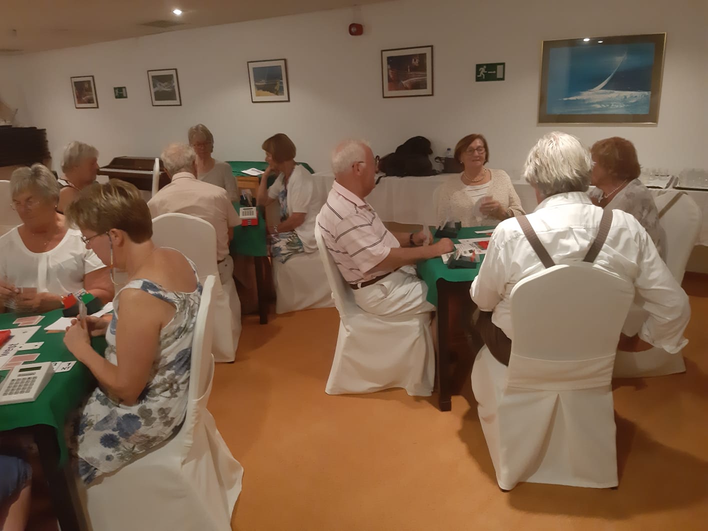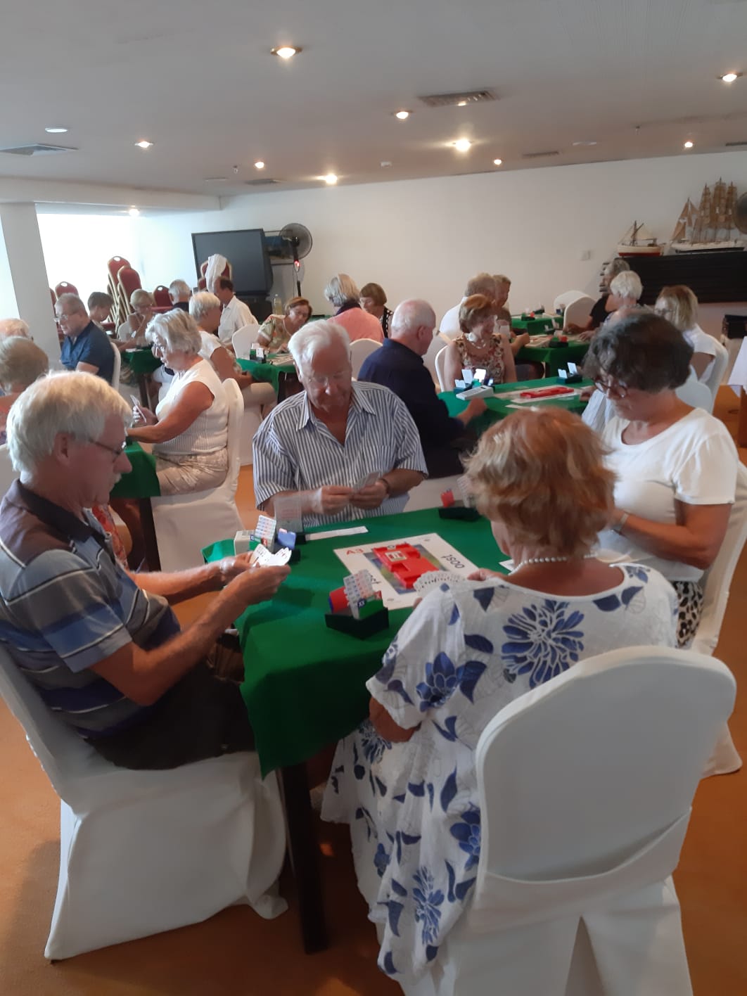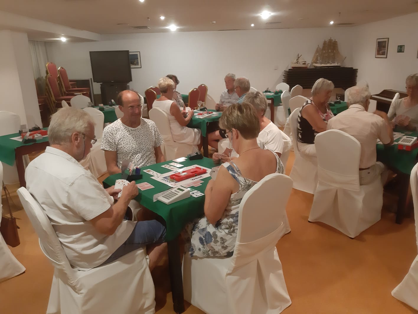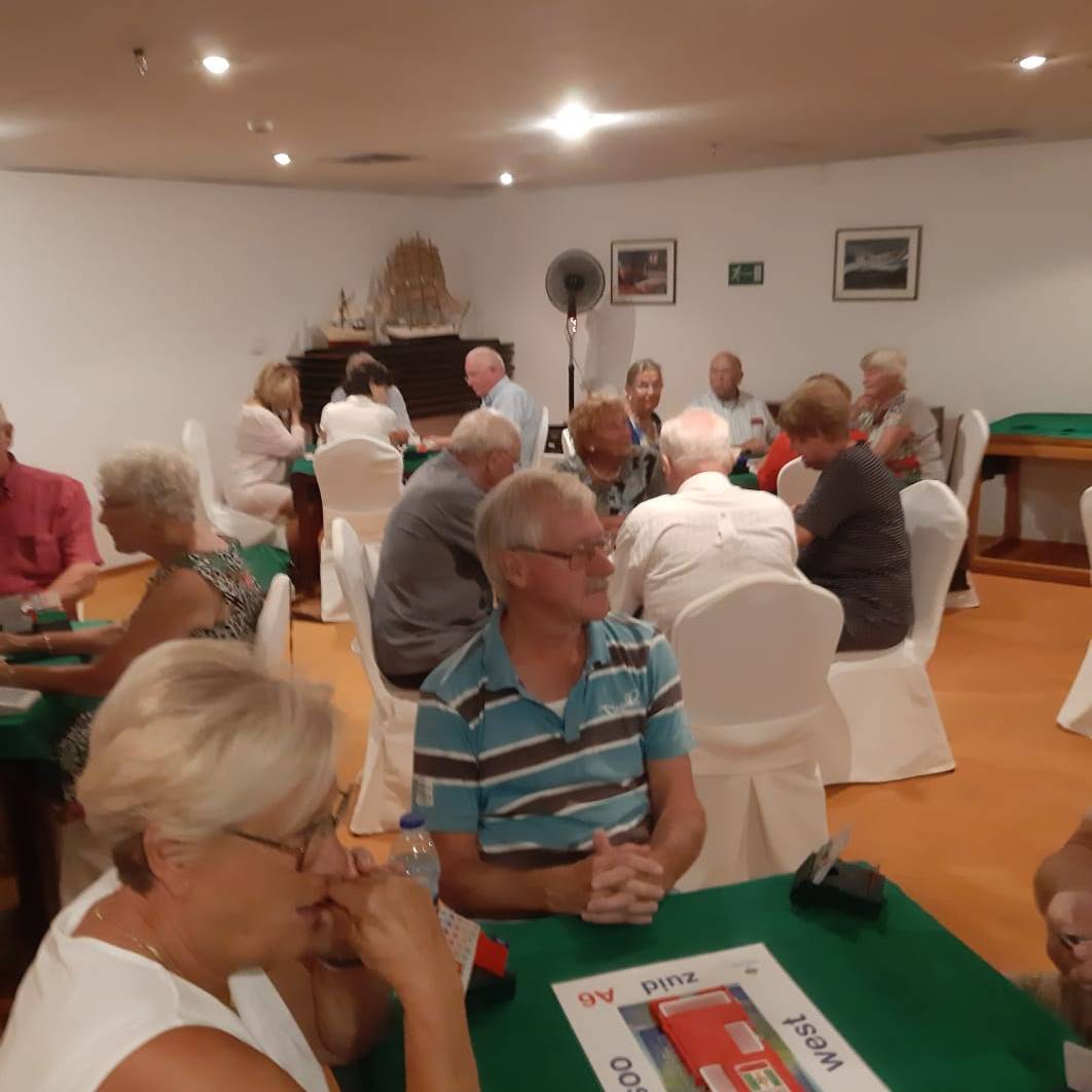 We zoeken de tafels op tegen 20.00 uur en kijken op onze loopbriefjes wie we tegenkomen vanavond. De lampen zijn geüpgraded waardoor de kaartsymbolen helderder op het netvlies komt te staan. Fijn hoor! Het loopt allemaal weer als een geoliede trein, de sfeer is goed en sportief. Zo hoort het toch te zijn op vakantiebridge.