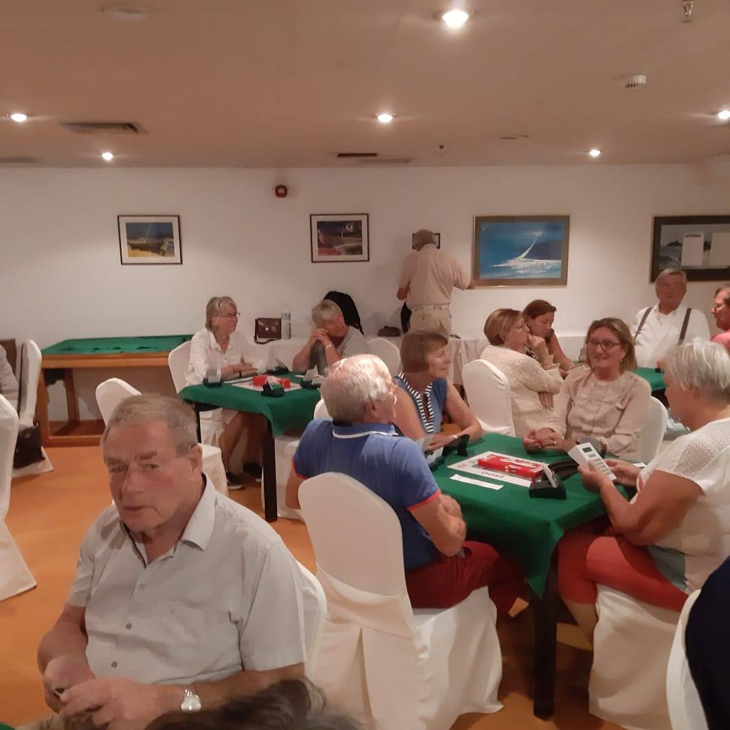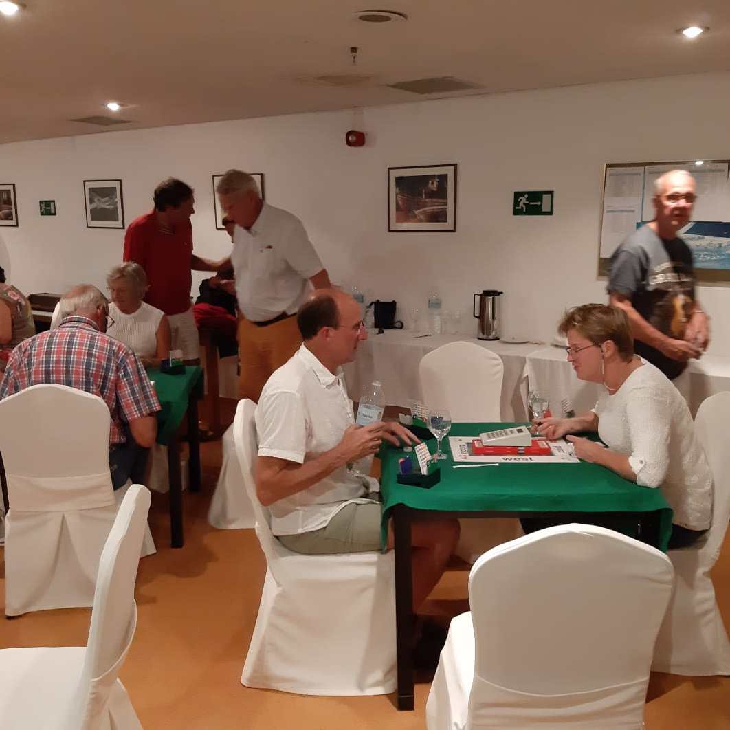 We zijn in goede stemming voor de laatste spellen. Bridgen op vakantie is een fijne avondinvulling met een sportief wedstrijdelement. We beginnen vandaag vooraf het diner met 4 ronden. Nadat iedereen heeft plaatsgenomen en elkaar succes wenst maar vooral veel plezier starten we met de laatste 6 ronden van 4 spellen. Na het diner pakken we de kaarten weer op voor de allerlaatste spelletjes van deze vakantie. Hierna feliciteren we als eerste de dagwinnaar Noor. Zij speelt vandaag wisselend met Jan, Oda en ondergetekende 🙂 .