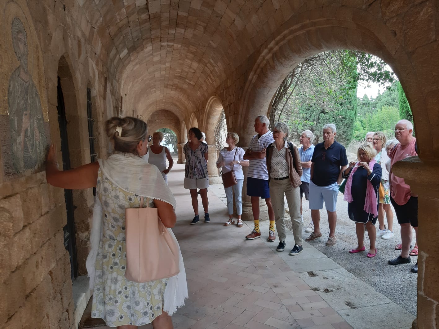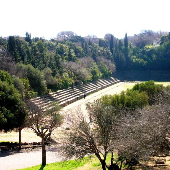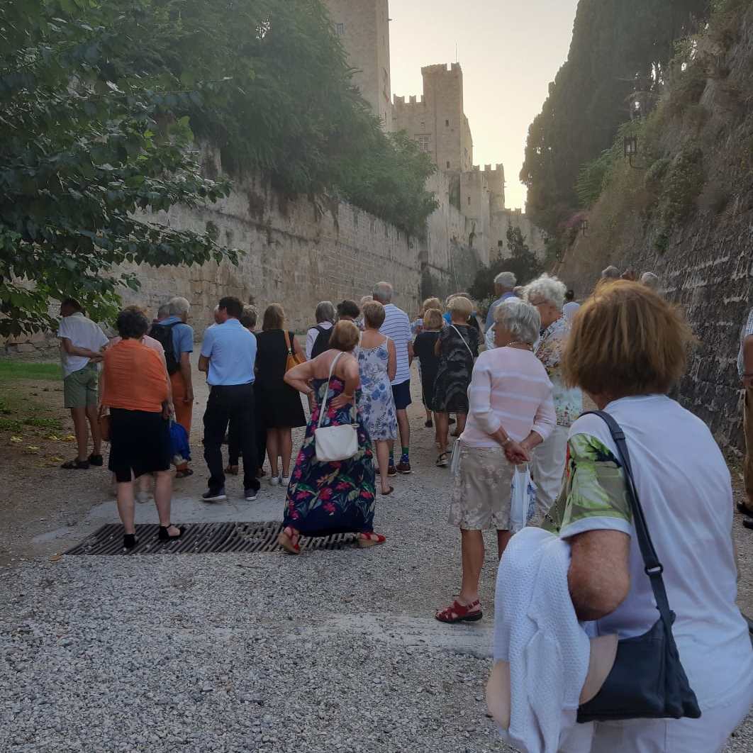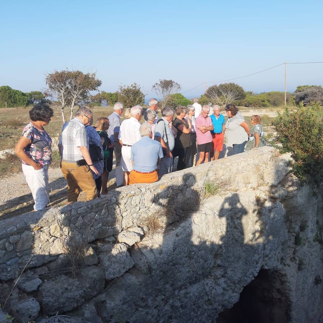 We vertrekken tegen 16.00 uur met een bus vol. Connie, onze Nederlands sprekende gids, geeft uitleg over de Mandraki haven. Hier lagen in de Oudheid de oorlogsschepen van Rhodos. We gaan naar ondergrondse gangen waar de bevolking vroeger koelte zocht en hierna verder met de bus naar het oude stadion waar vroeger de Spelen werden gehouden. Ook bezoeken we een kapelletje in de Antieke Stad.