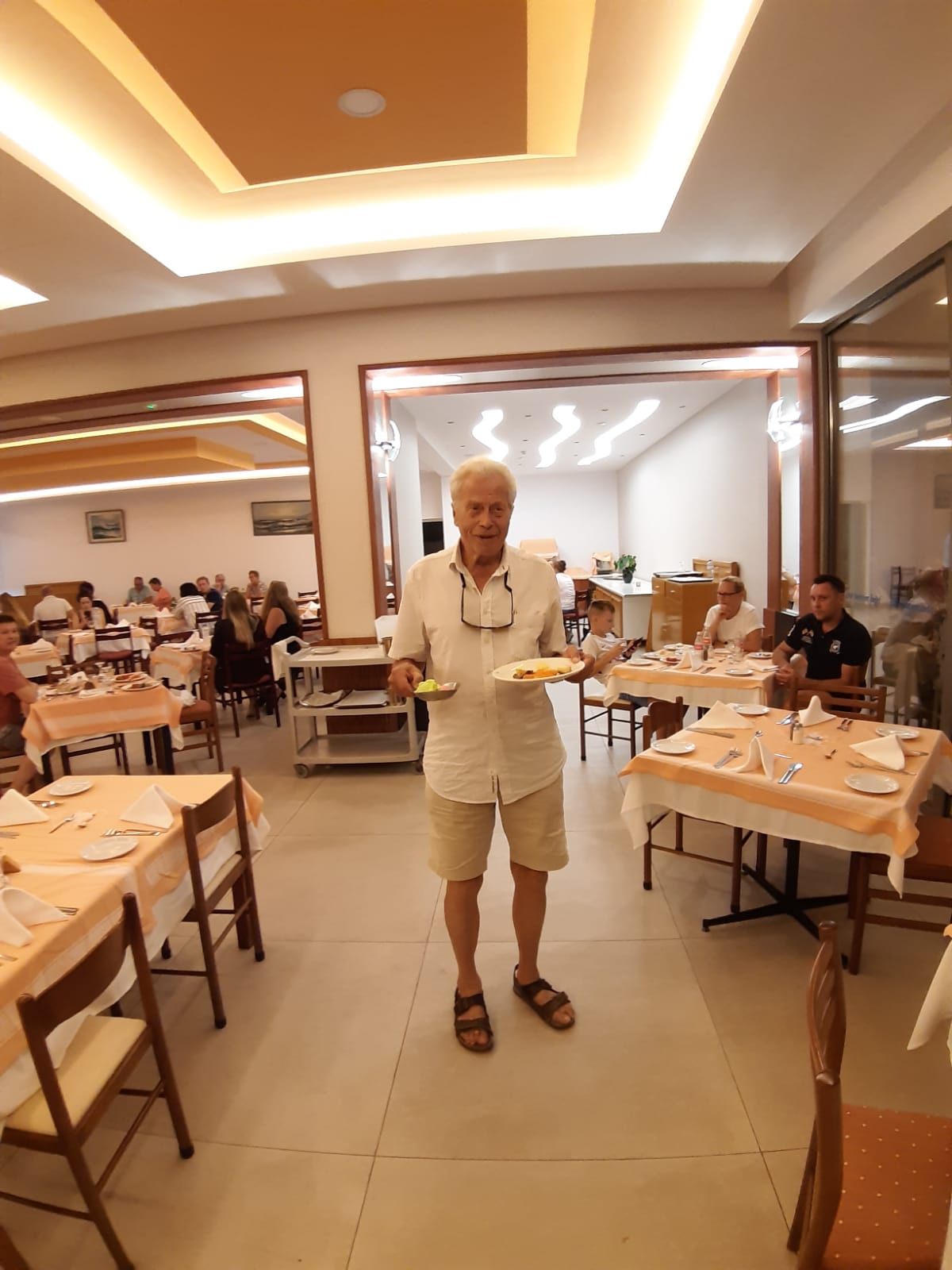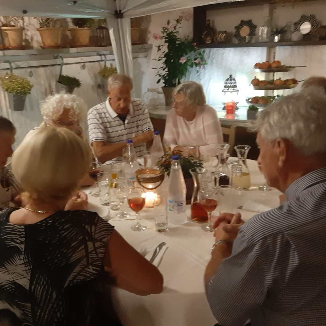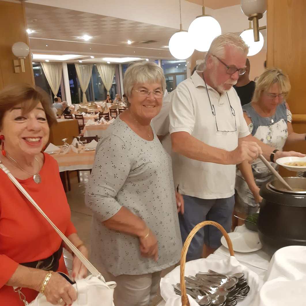 Tijdens het diner worden uiteenlopende gesprekken gevoerd. Maatschappelijke thema’s, de (klein)kinderen, het werk(verleden) komen aan bod maar vooral wordt veel gelachen. Na het diner gaan we naar de Griekse avond.