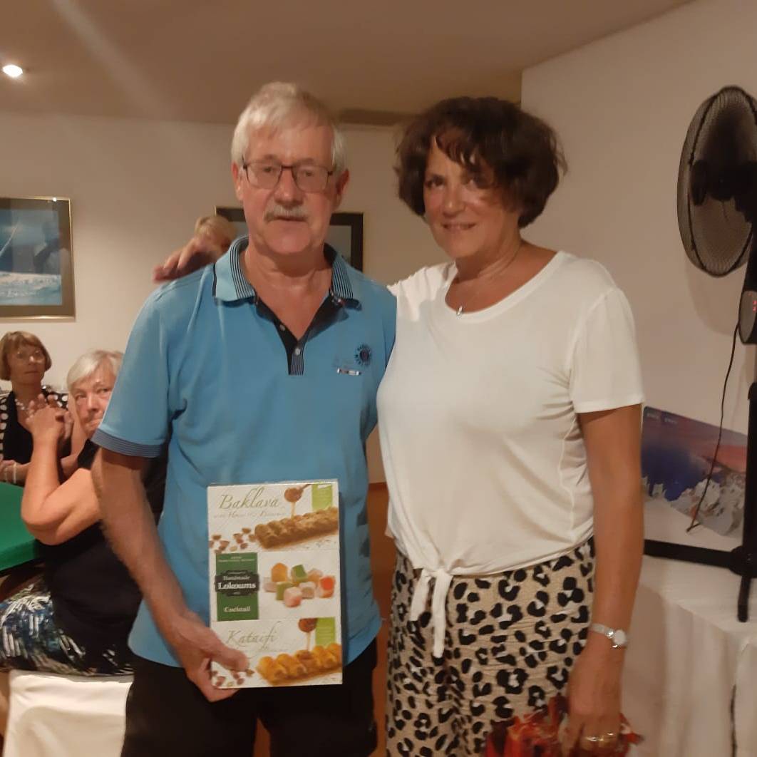 De winnaars van vandaag, Onno en Ineke, spelen nog maar kort en dan 1e worden is fantastisch. Zij hebben de les van Enri goed opgevolgd en zongen na het in ontvangst nemen van de dagprijs: “Enri bedankt, Enri bedankt!”. Hierna hebben we nog even een gezellige nazit. Naar de uitslag.