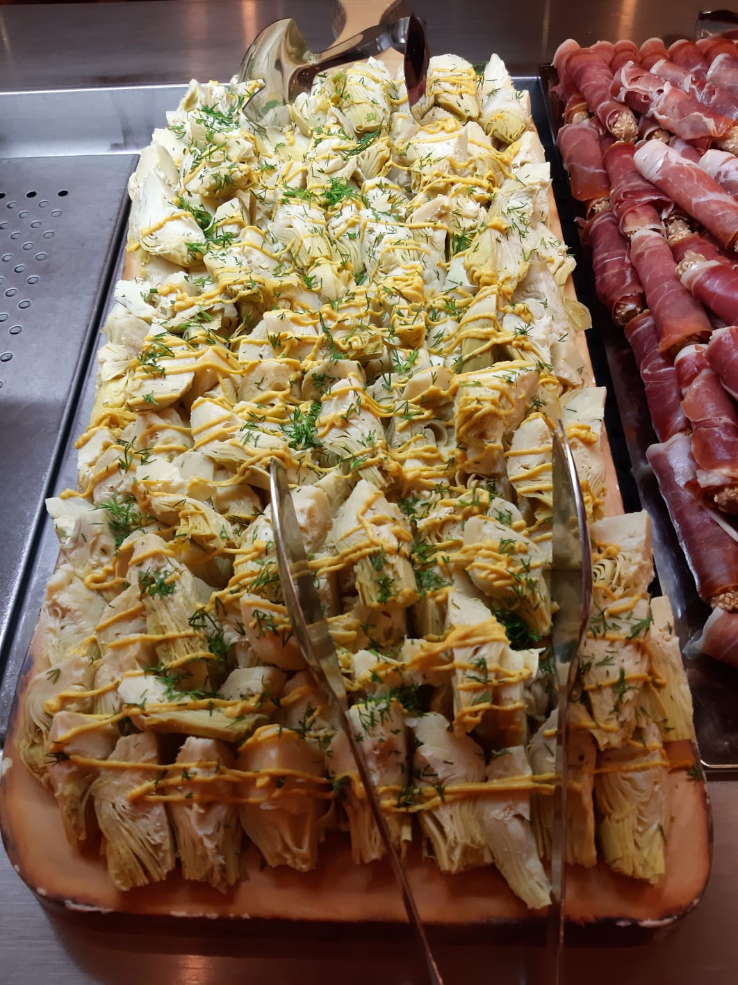We kijken altijd uit naar het dinermoment tegen 19.00 uur en verschijnen in luchtig zomerse kleding om plaats te nemen aan tafel. De keuken biedt altijd voor ieder wat wils. Onze gasten lopen tevreden langs het buffet. Het bordje wordt royaal voorzien, ook aan desserts 🙂 . De kip met ketting is elegant, sappig en smakelijk. Een dergelijke presentie is wellicht inspirerend voor thuis. 😉