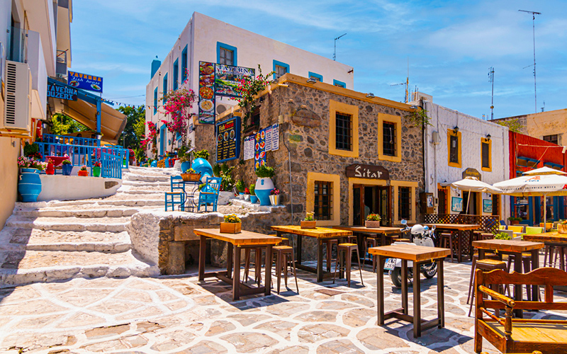 Kos-stad is een levendige stad met terrasjes en smalle straatjes. Ook zijn er in de stad volop leuke winkeltjes. De gebouwen in de stad geven een indruk van wat zich hier in het verleden heeft afgespeeld, de stijlen vanaf de Griekse tijd tot de Romeinse tijd, van de Byzantijnse tijd tot de Turkse tijd, zijn alle zeer duidelijk herkenbaar. Het centrum van de stad is opvallend groen met overal palmbomen en bloemen langs de straat. De lanen zijn erg mooi en wat ook opvallend is, is dat er heel veel gefietst wordt. De markthal in Kos-stad is ook een bezoek waard.
