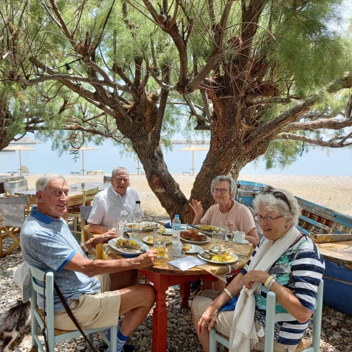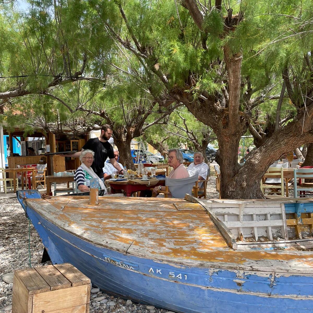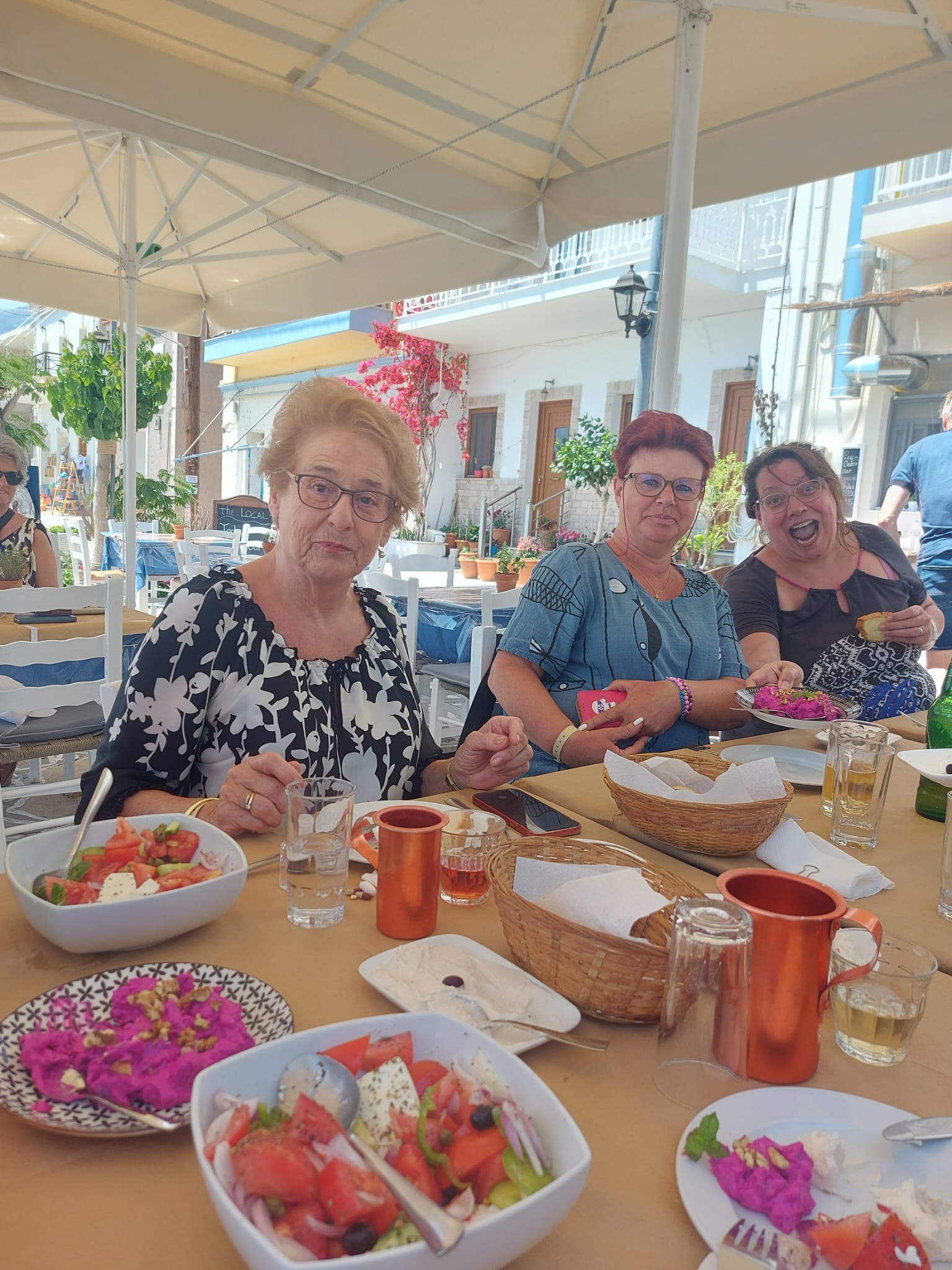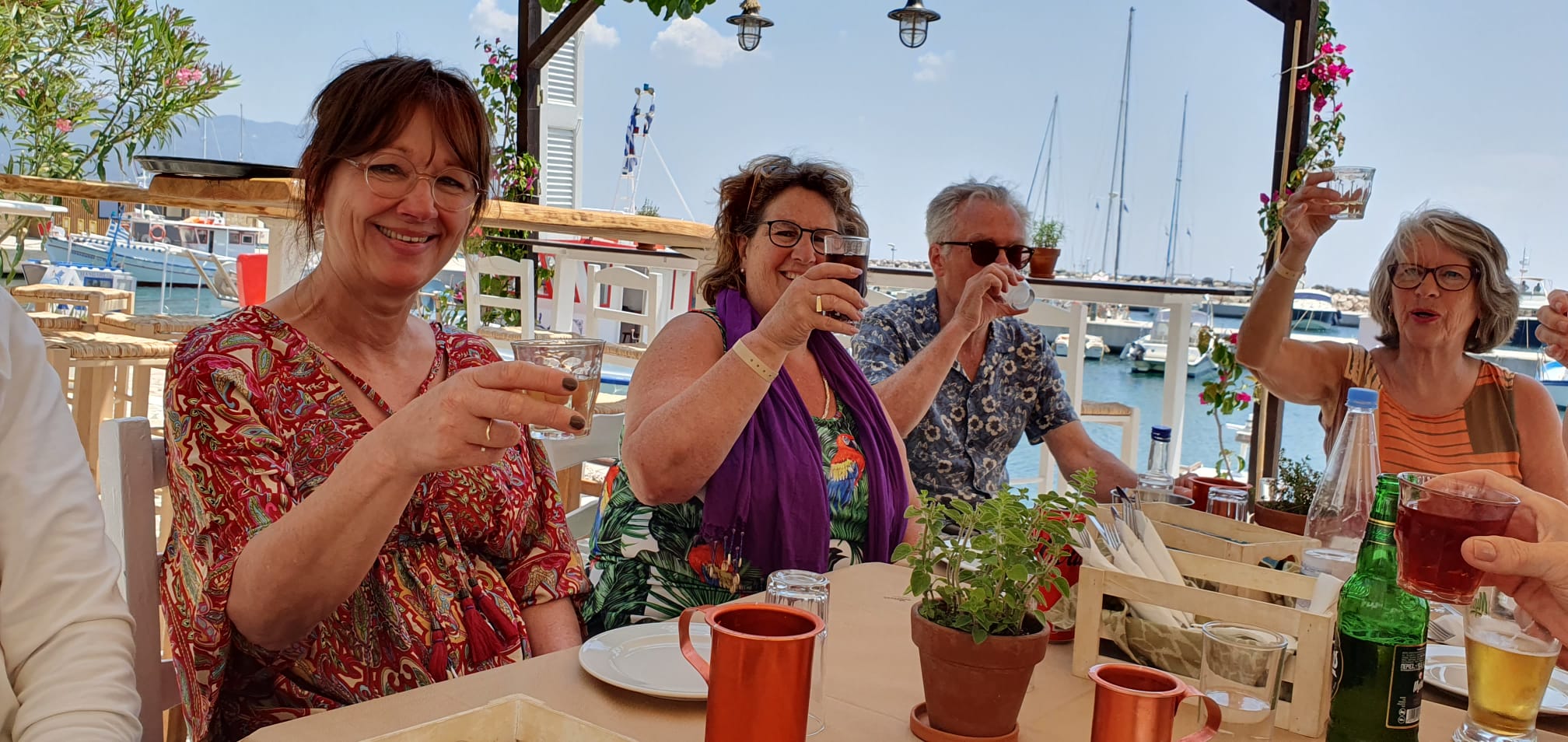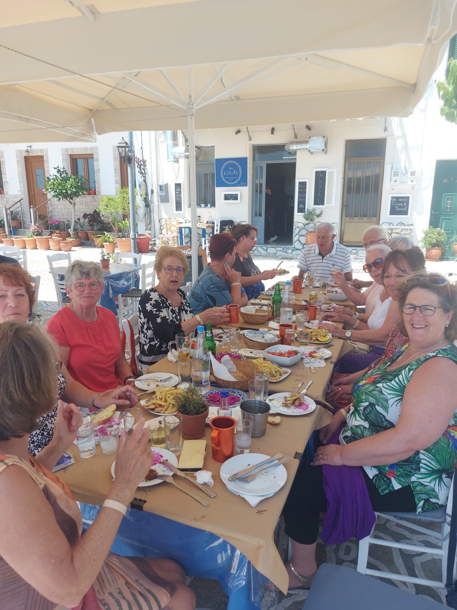 De tafel was leuk neergezet onder de parasol aan het haventje. Eerst eens rustig een drankje. Op de lange tafel werd vers brood neergezet met kruiden. Daarbij kwamen Taramosalata, een soort Tzaziki, heerlijke Griekse salade en nog wat brood. Daarna kregen we gefrituurde balletjes met kikkererwtenpuree, balletjes met een courgette vulling en grote schalen met gyros, frietjes en pitabrood. Dan denk je nu zal het wel klaar zijn met het vullen van de tafel. Er kwamen nog heerlijke kaasballetjes met sesamzaad en honing en een heerlijke bietensalade met walnoten. De vingers werden erbij afgelikt. Als laatste van het hoofdmenu kregen we heerlijke grote langoustines. Een feestje voor de visliefhebbers. We sluiten af met nog wat wijn van het huis en een heerlijke luchtige yoghurt met een huisgemaakte siroop en mandarijn.