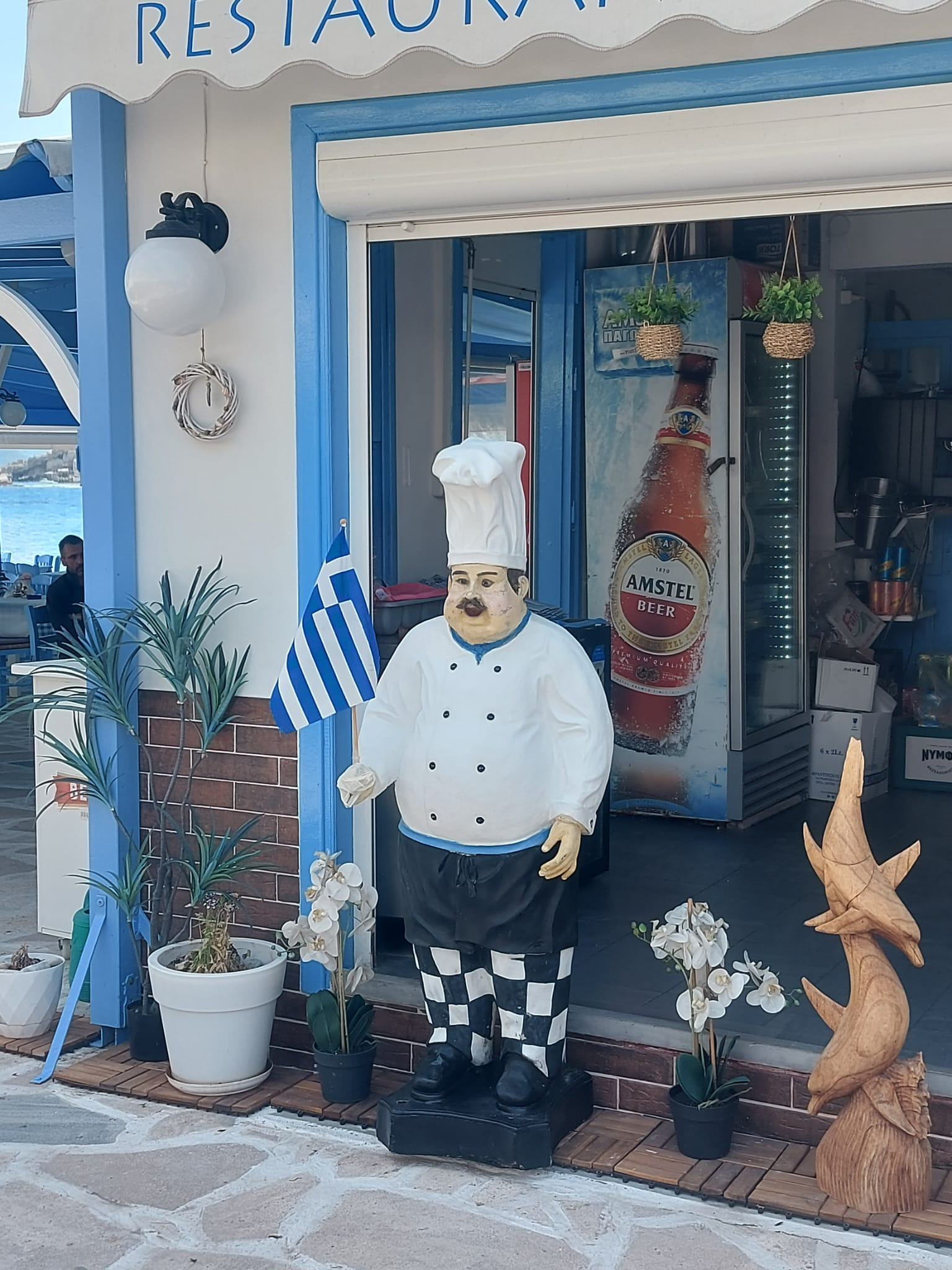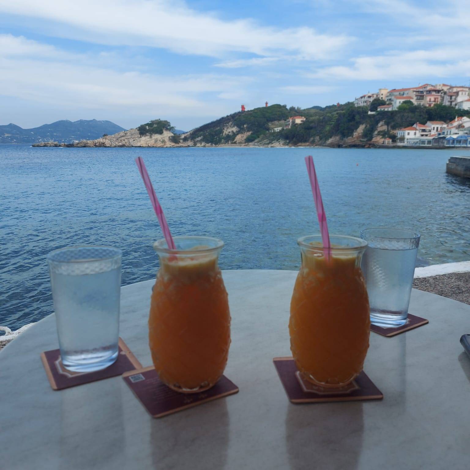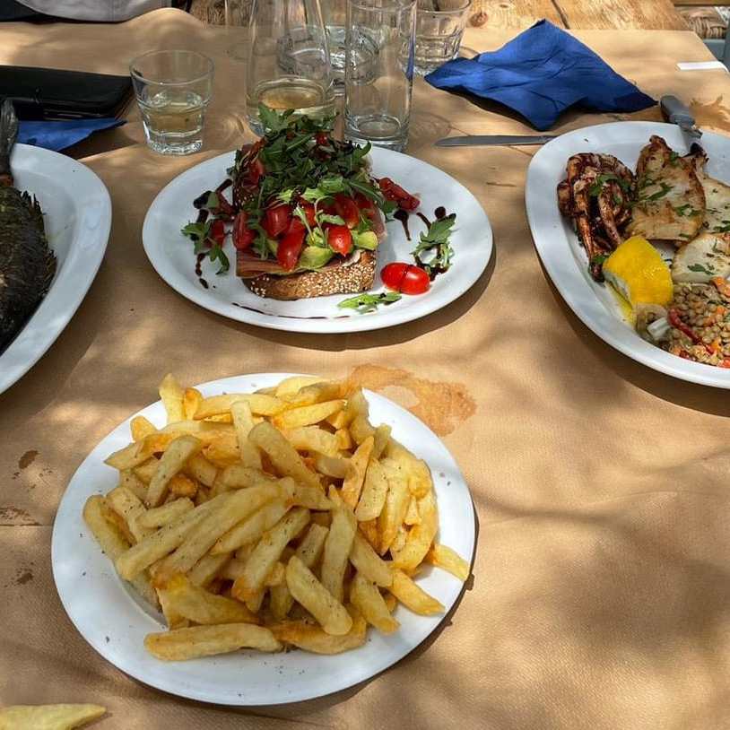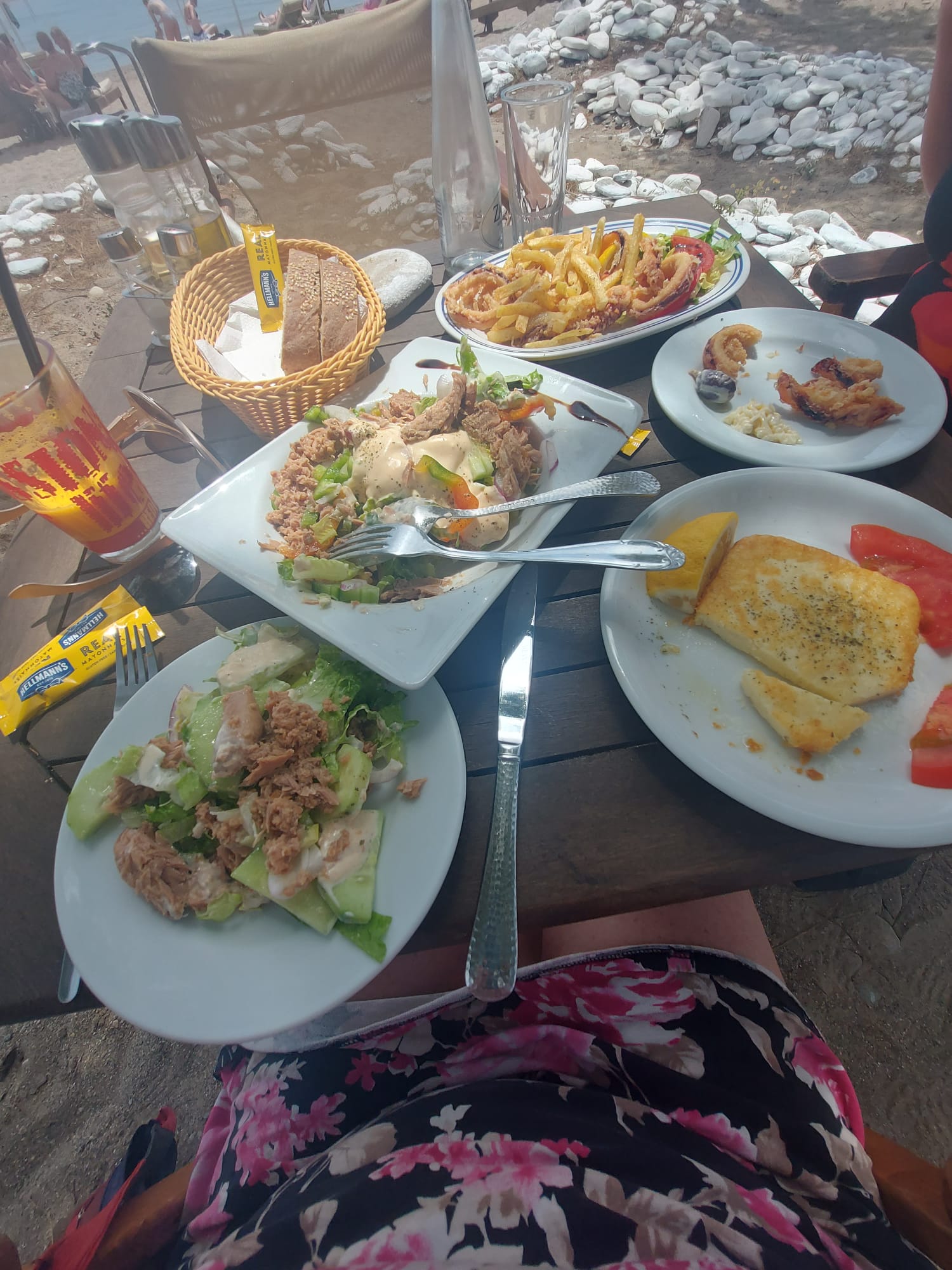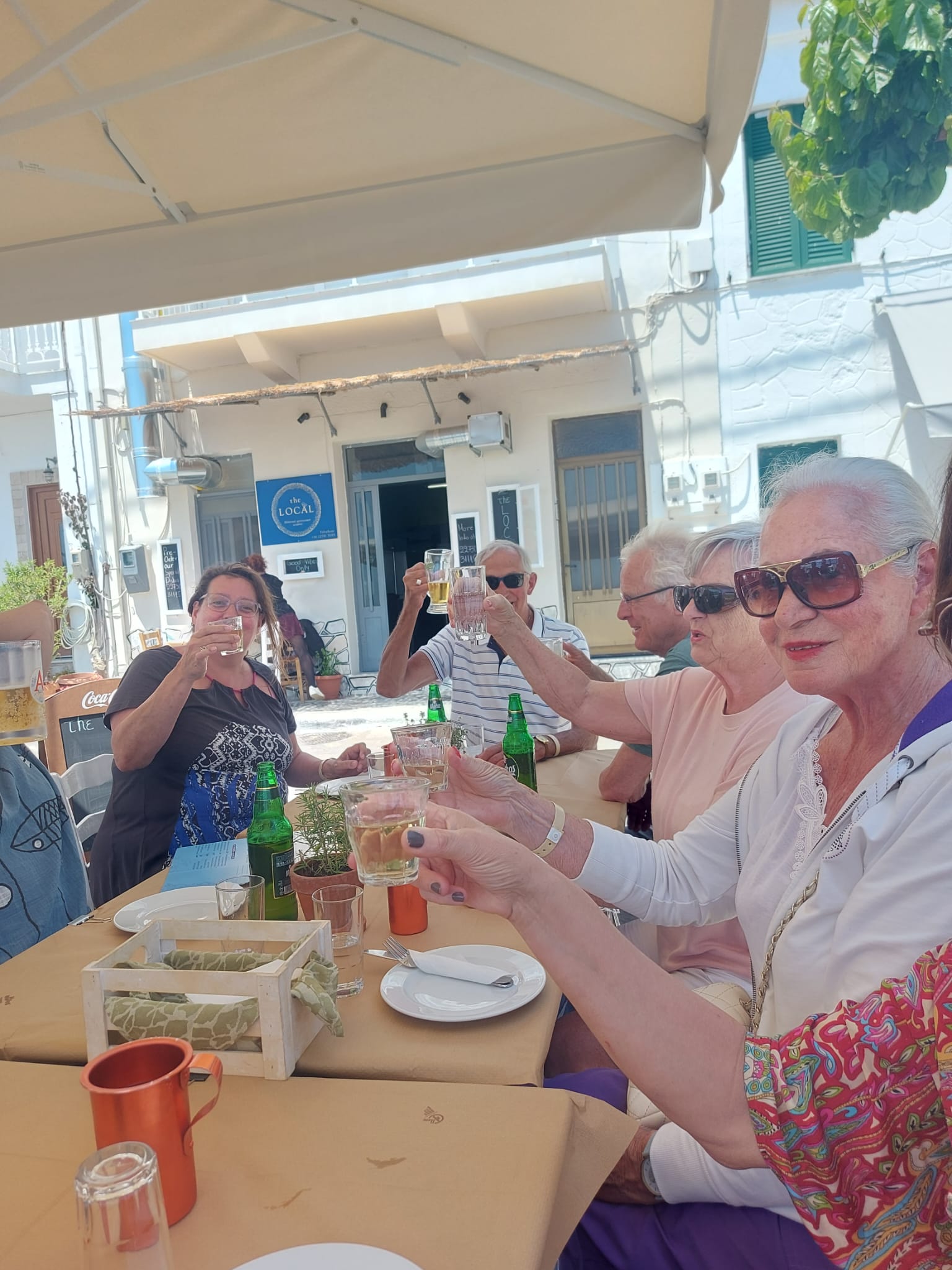 De tafel was leuk neergezet onder de parasol aan het haventje. Eerst eens rustig een drankje. Op de lange tafel werd vers brood neergezet met kruiden. Daarbij kwamen Taramosalata, een soort Tzaziki, heerlijke Griekse salade en nog wat brood. Daarna kregen we gefrituurde balletjes met kikkererwtenpuree, balletjes met een courgette vulling en grote schalen met gyros, frietjes en pitabrood. Dan denk je nu zal het wel klaar zijn met het vullen van de tafel. Er kwamen nog heerlijke kaasballetjes met sesamzaad en honing en een heerlijke bietensalade met walnoten. De vingers werden erbij afgelikt. Als laatste van het hoofdmenu kregen we heerlijke grote langoustines. Een feestje voor de visliefhebbers. We sluiten af met nog wat wijn van het huis en een heerlijke luchtige yoghurt met een huisgemaakte siroop en mandarijn.