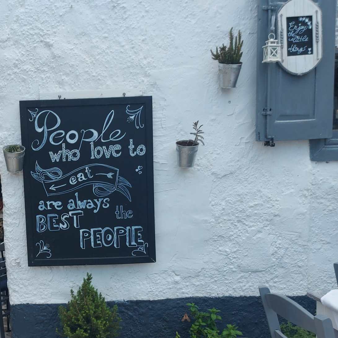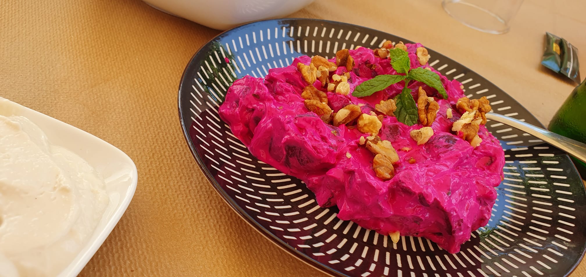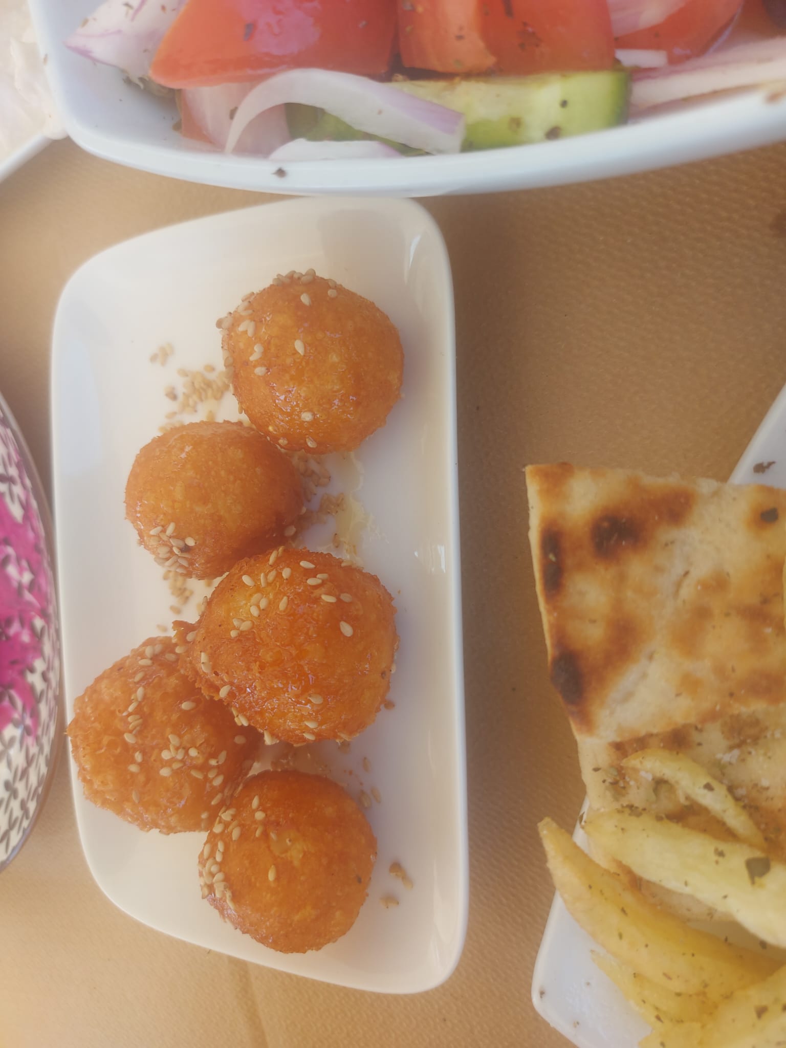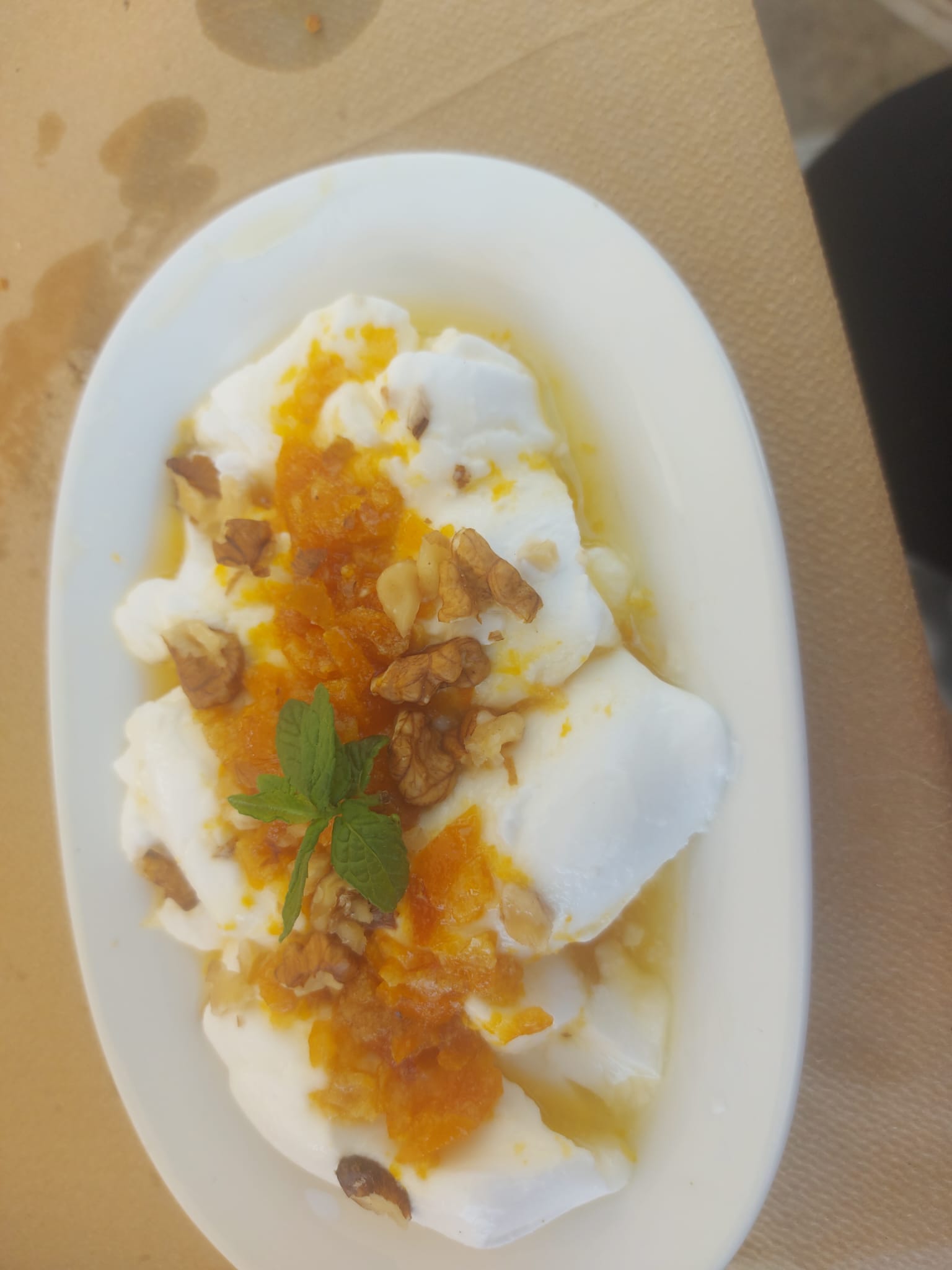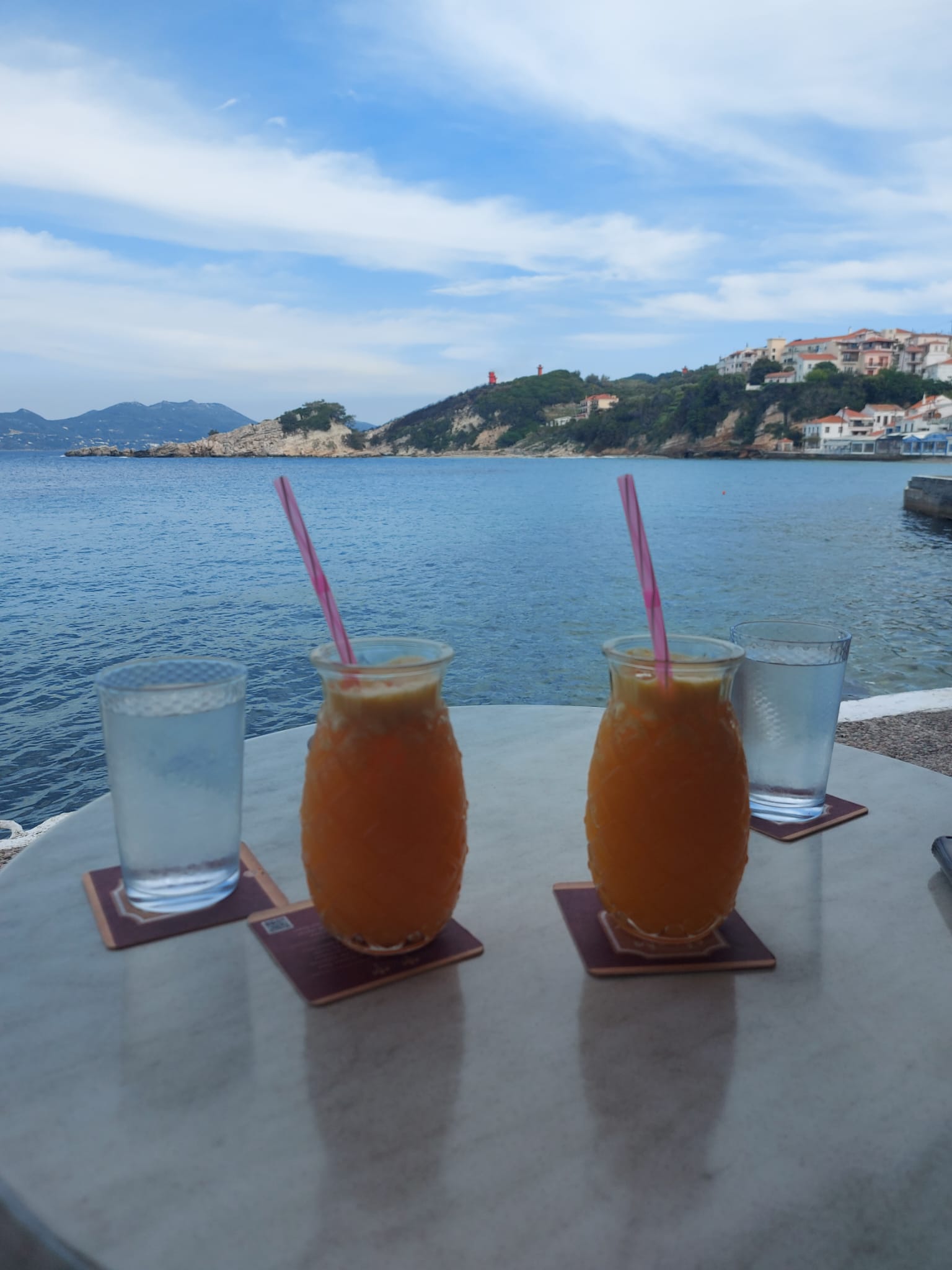 De tafel was leuk neergezet onder de parasol aan het haventje. Eerst eens rustig een drankje. Op de lange tafel werd vers brood neergezet met kruiden. Daarbij kwamen Taramosalata, een soort Tzaziki, heerlijke Griekse salade en nog wat brood. Daarna kregen we gefrituurde balletjes met kikkererwtenpuree, balletjes met een courgette vulling en grote schalen met gyros, frietjes en pitabrood. Dan denk je nu zal het wel klaar zijn met het vullen van de tafel. Er kwamen nog heerlijke kaasballetjes met sesamzaad en honing en een heerlijke bietensalade met walnoten. De vingers werden erbij afgelikt. Als laatste van het hoofdmenu kregen we heerlijke grote langoustines. Een feestje voor de visliefhebbers. We sluiten af met nog wat wijn van het huis en een heerlijke luchtige yoghurt met een huisgemaakte siroop en mandarijn.