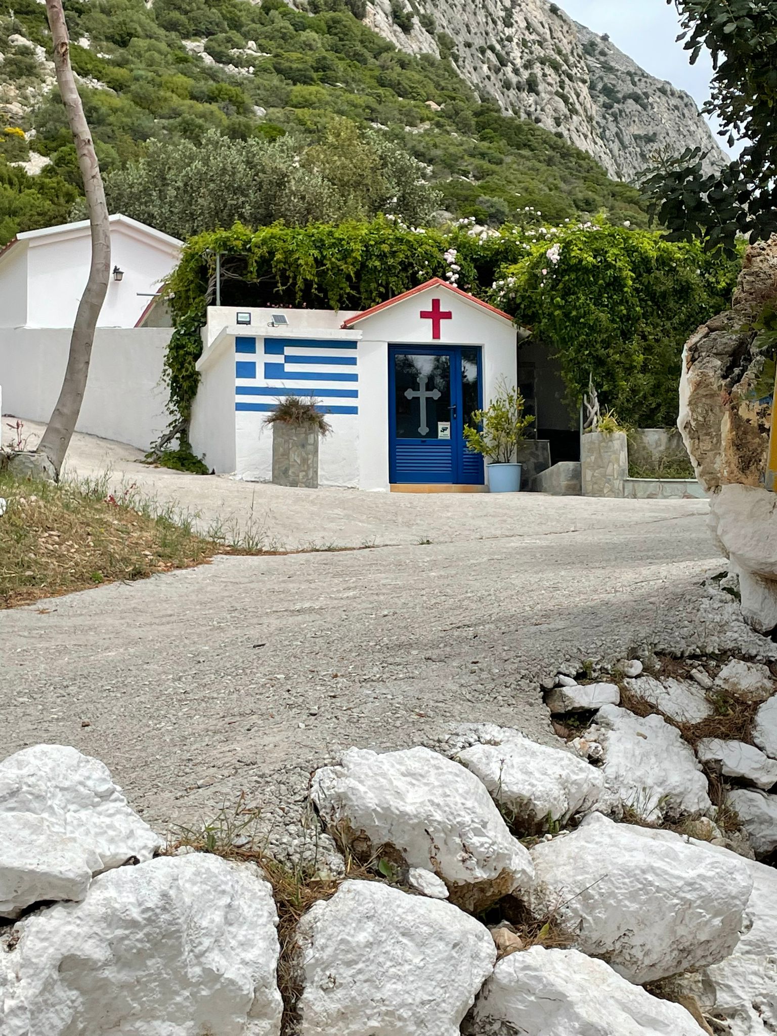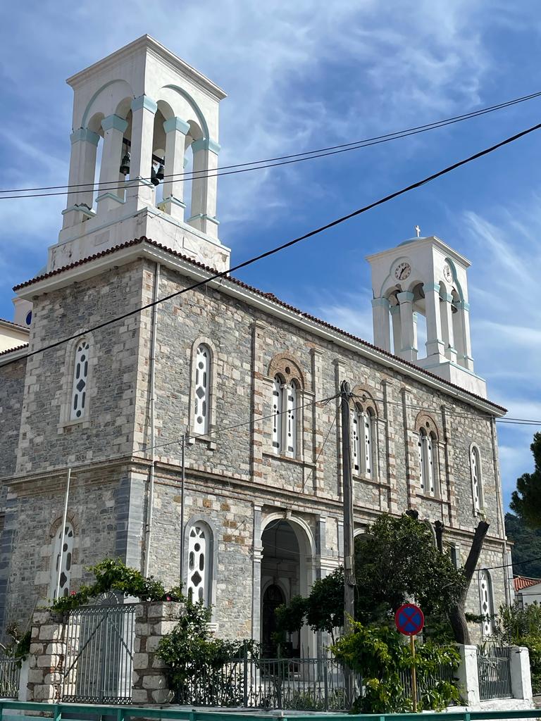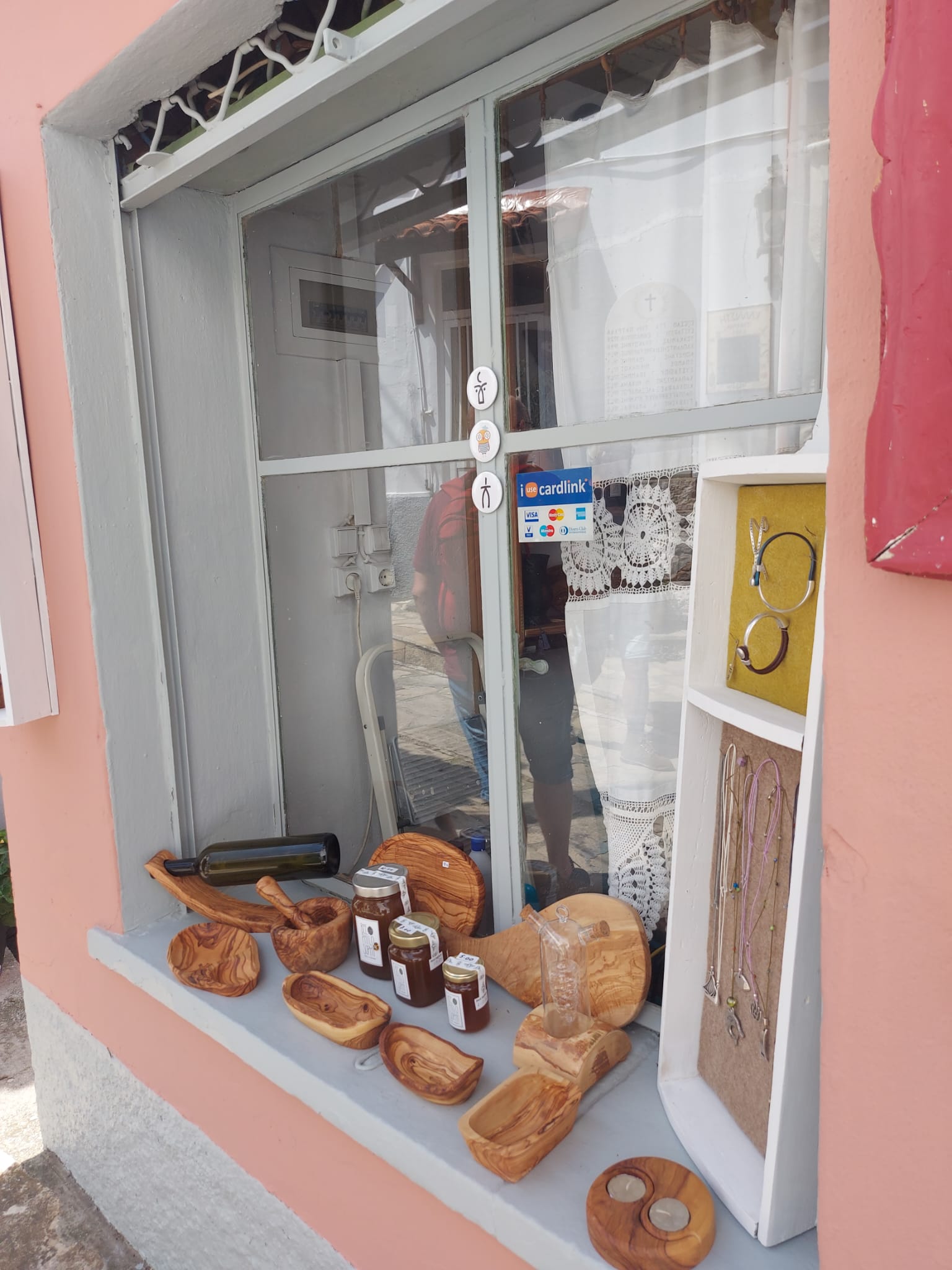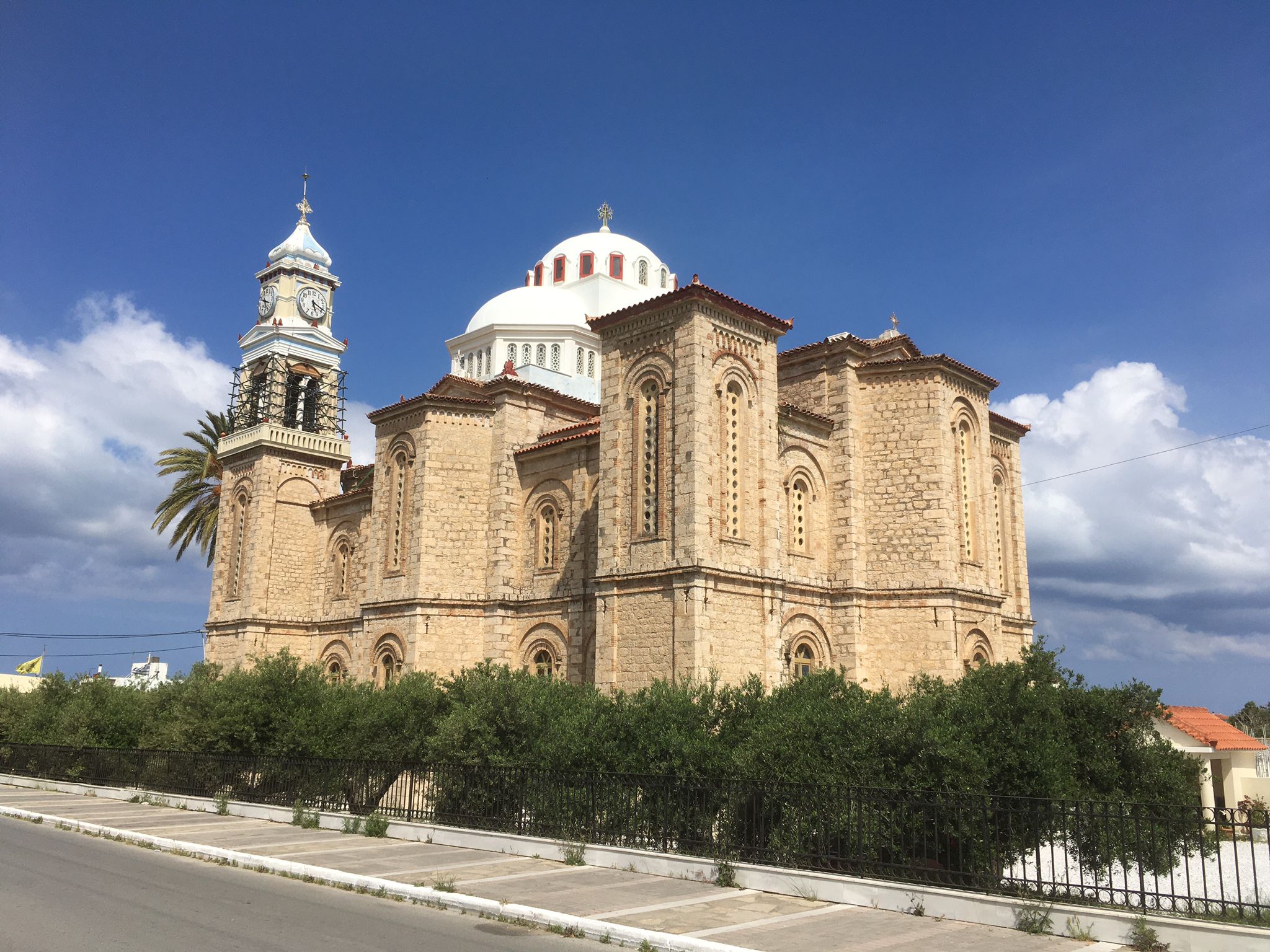We gaan via Karlovassi de een na grootste stad van Samos via de kustweg naar Kokkari. Onderweg vertelt onze gids Ida van alles over het eiland, de plaatsjes onderweg en de gebruiken en gewoontes op het eiland. Uit de bus nemen we ook wat foto’s. We komen langs een geitenhoeder. We naderen Kokkari een hele leuke havenplaats. Jammer genoeg kunnen we de kerk niet bezoeken. Deze is door de aardbeving van 2020 niet toegankelijk.