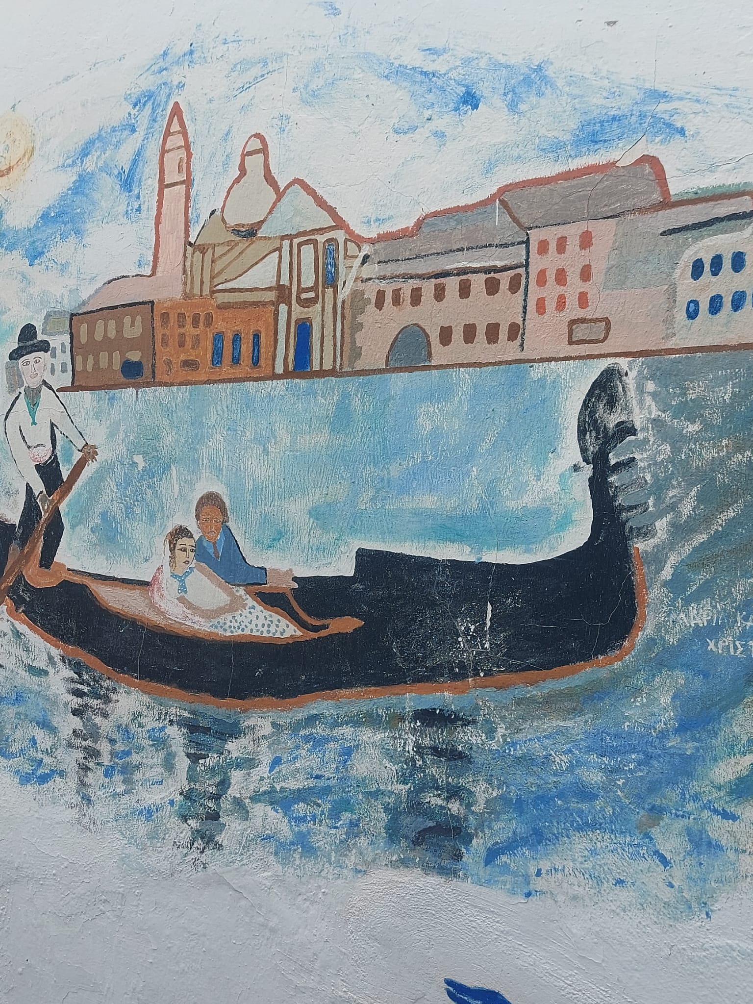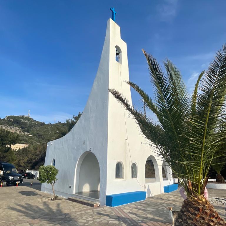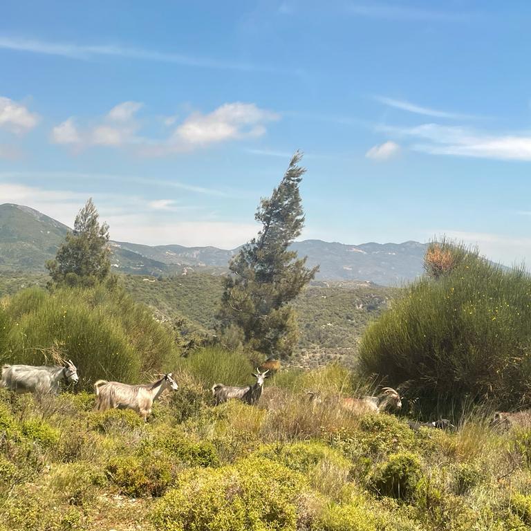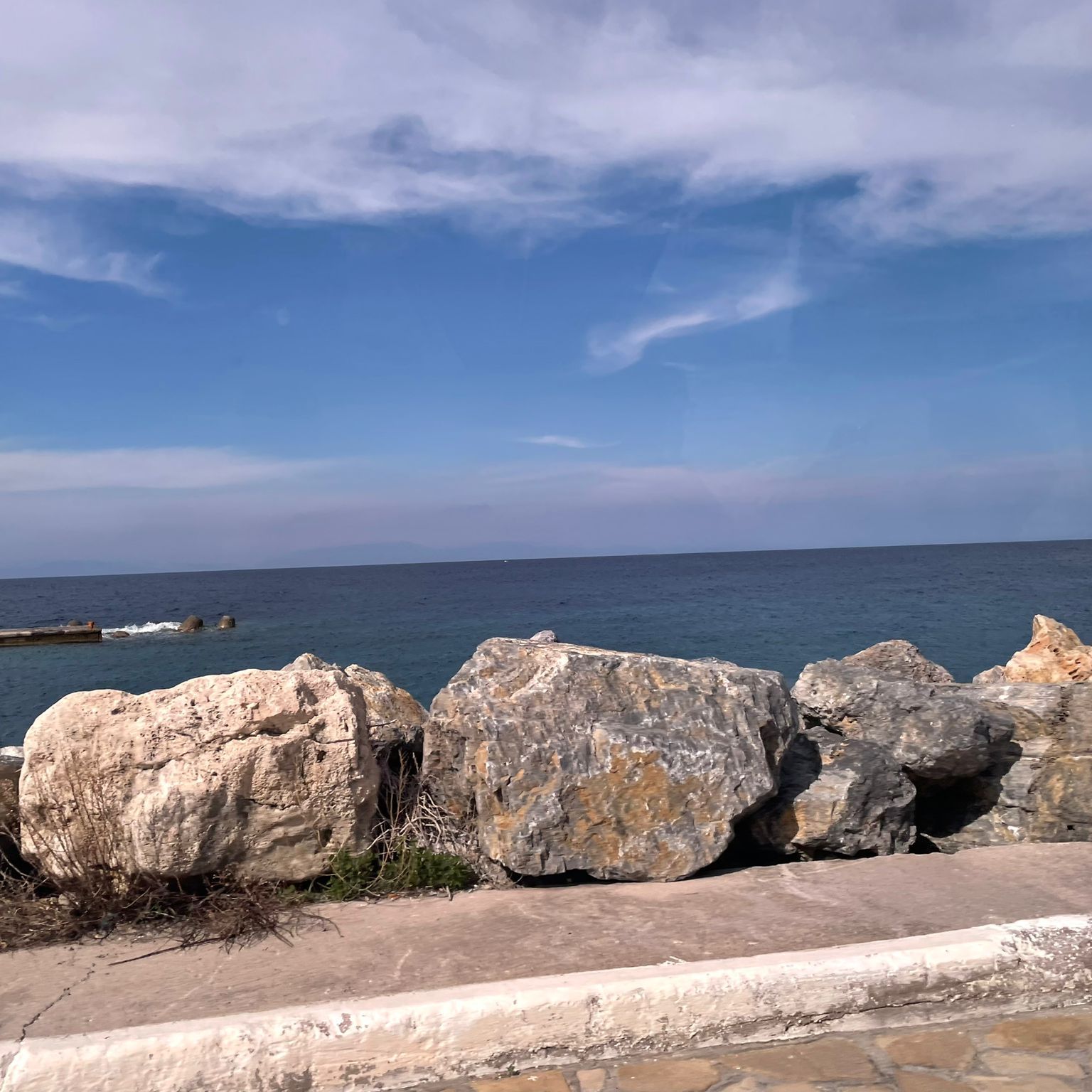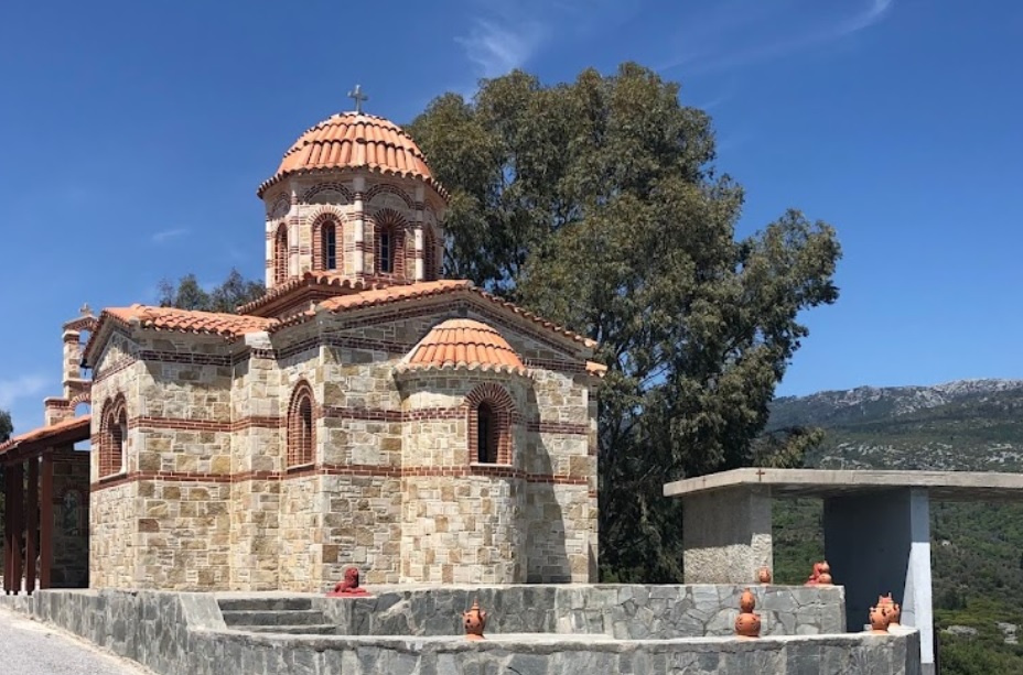 We gaan via Karlovassi de een na grootste stad van Samos via de kustweg naar Kokkari. Onderweg vertelt onze gids Ida van alles over het eiland, de plaatsjes onderweg en de gebruiken en gewoontes op het eiland. Uit de bus nemen we ook wat foto’s. We komen langs een geitenhoeder. We naderen Kokkari een hele leuke havenplaats. Jammer genoeg kunnen we de kerk niet bezoeken. Deze is door de aardbeving van 2020 niet toegankelijk.