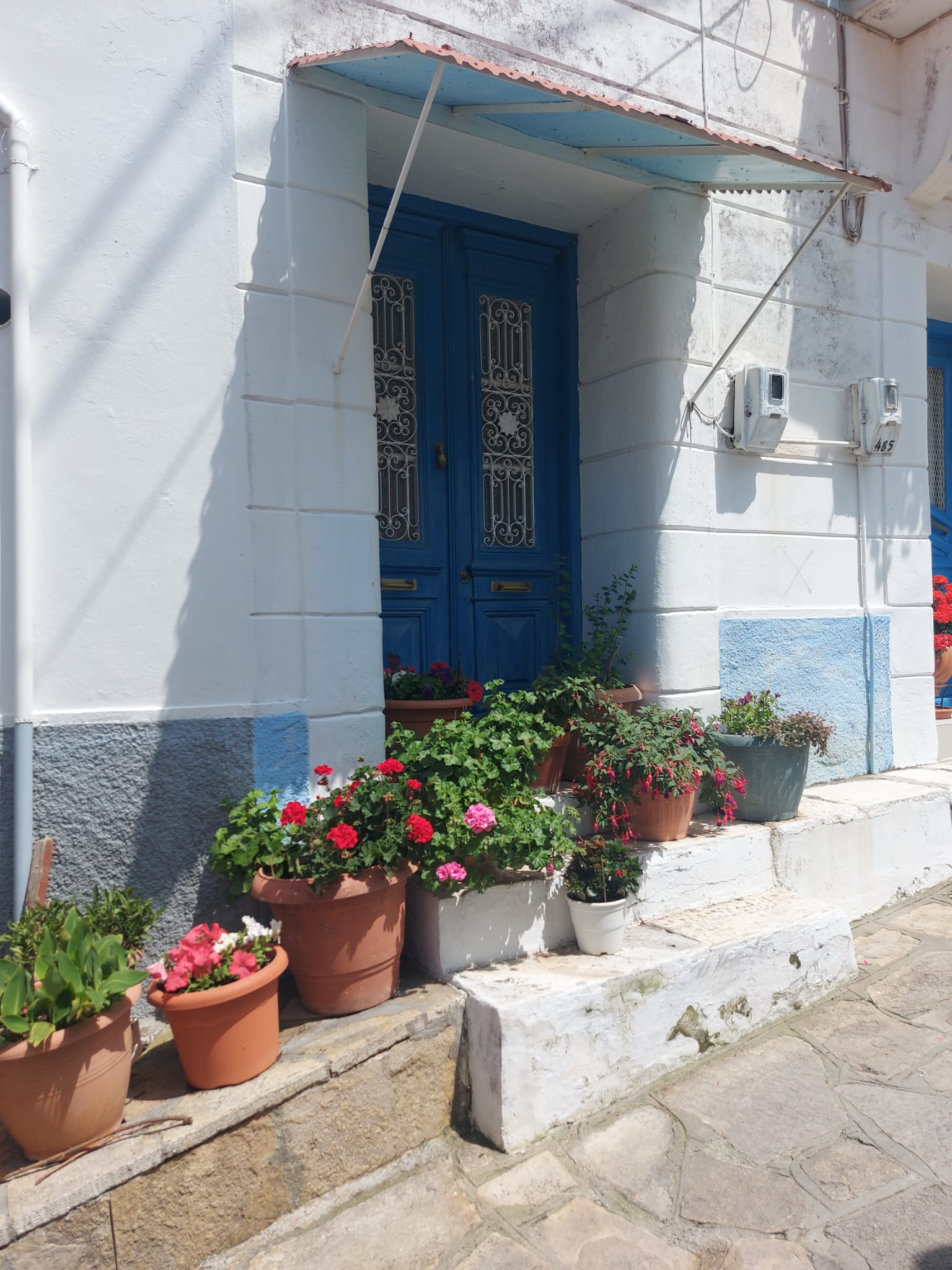 In de buurt van de burcht en de kerk in Pythagorion (Samos) ligt het straatje ‘Al. Lygourgou’ beter bekend als “het blauwe straatje”. De bewoners hebben dit straatje, is eigenlijk meer een steegje, blauw en wit geschilderd. In het straatje zijn ook allerlei objecten geplaatst waardoor het een klein openluchtmuseum is geworden. Zoals geschreven in het verslag van gisteren is een bezoek aan het klooster, de boulevard en het archeologisch museum aan te bevelen.
