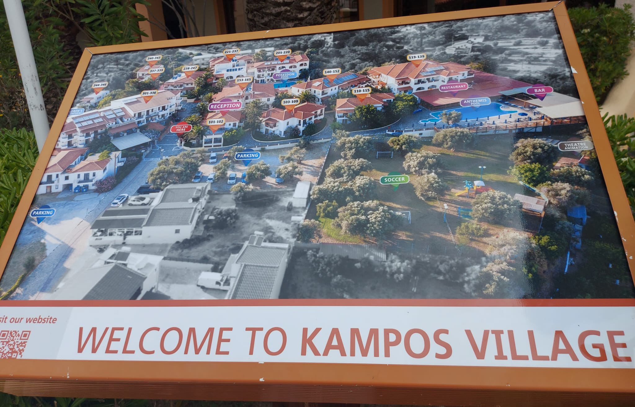 Na ruim drie uur vliegen kwamen we op de kleine luchthaven van Samos aan. In tegenstelling tot Schiphol waar we veel moesten lopen, was het een kleine wandeling op Airport Samos. We waren het enige vliegtuig, binnen een half uur zaten we in de bus. We werden goed opgevangen door de reisleiding van Corendon. In de bus kregen we een koud flesje water. Een prachtige rit door de berg was een kadootje. Na een klein uurtje met wat tussenstops waren we in Kampos Village.