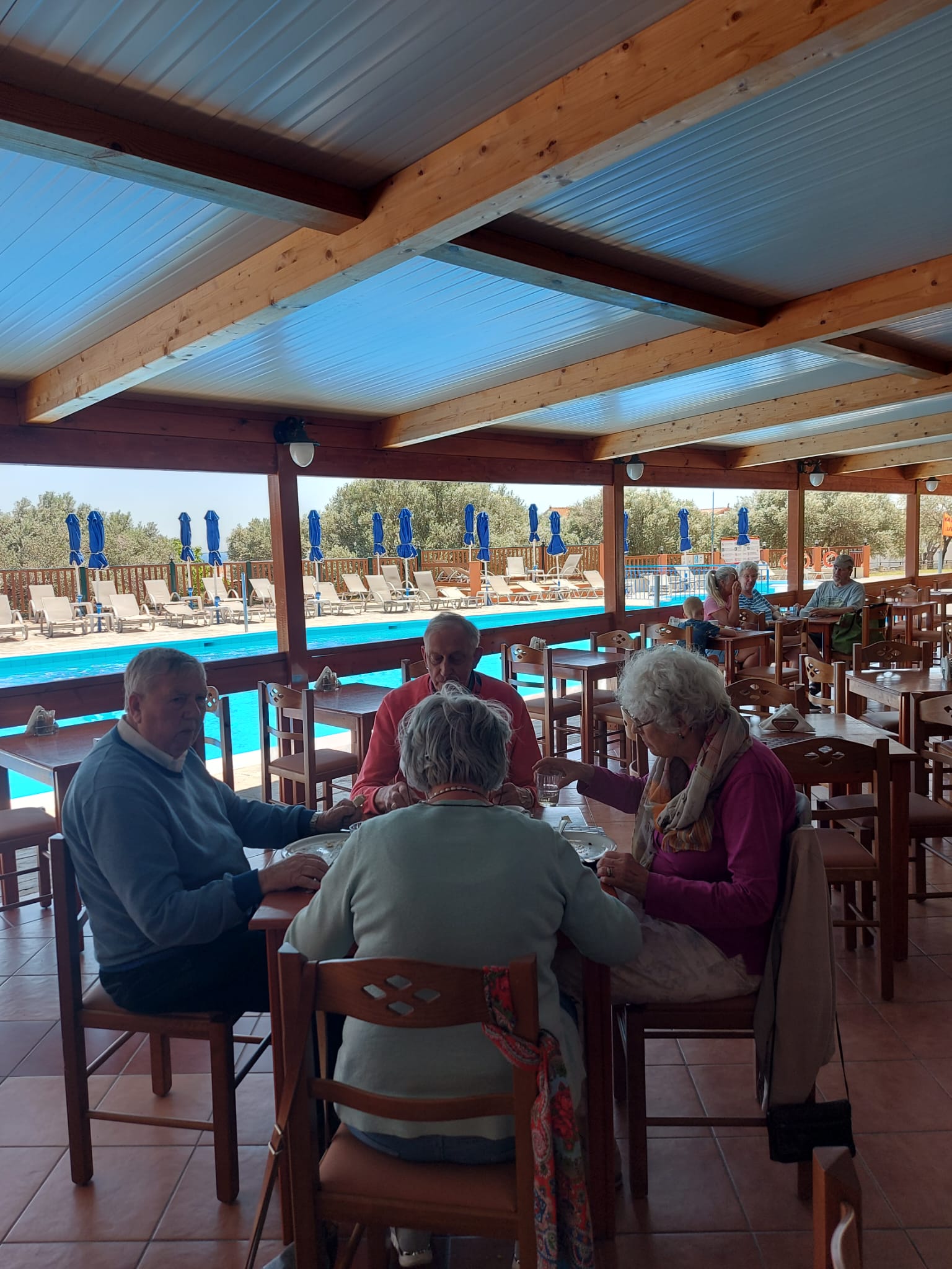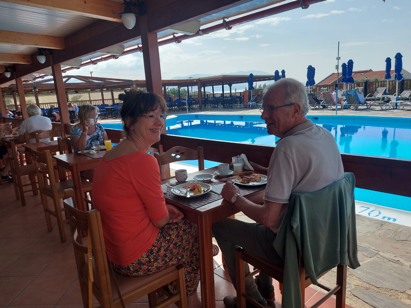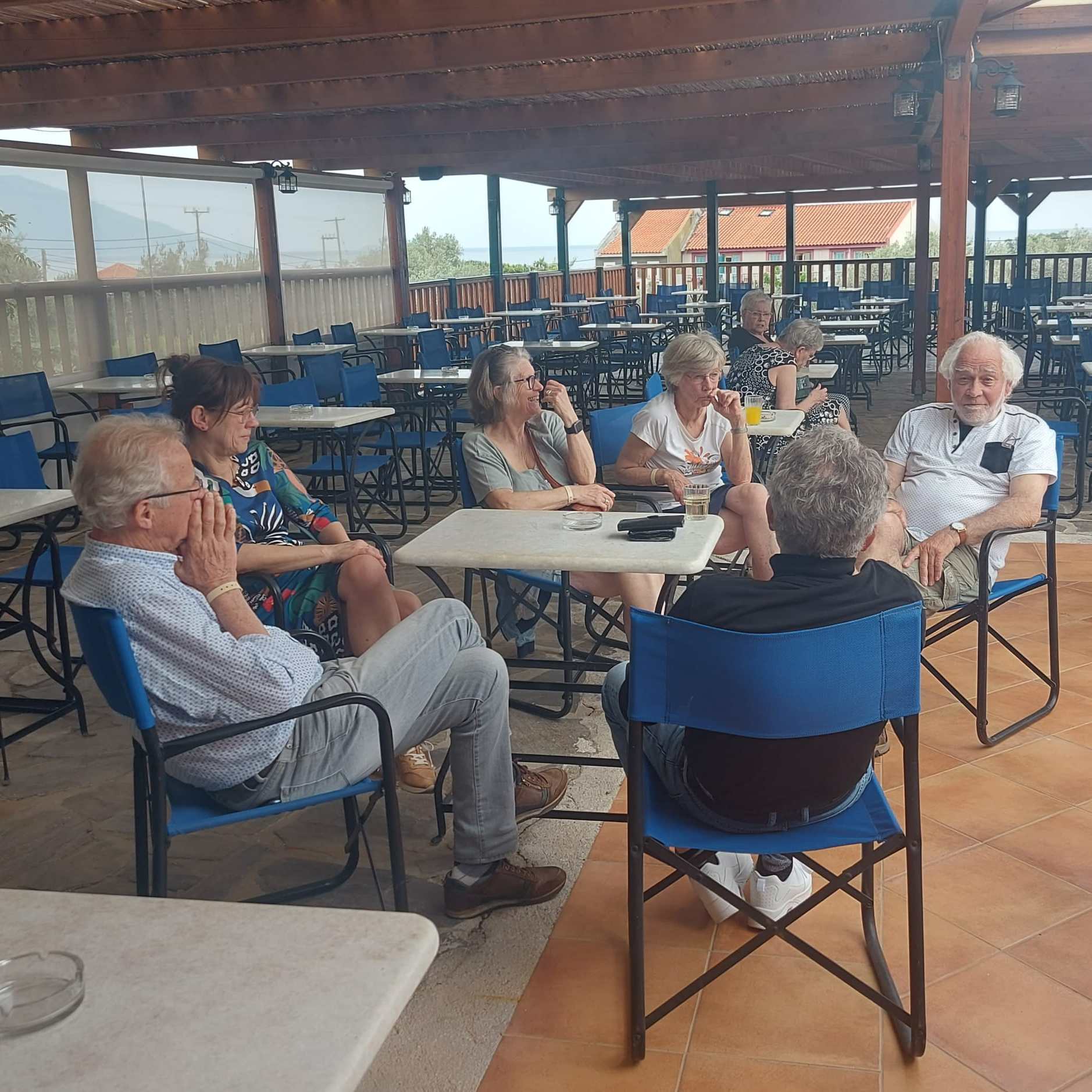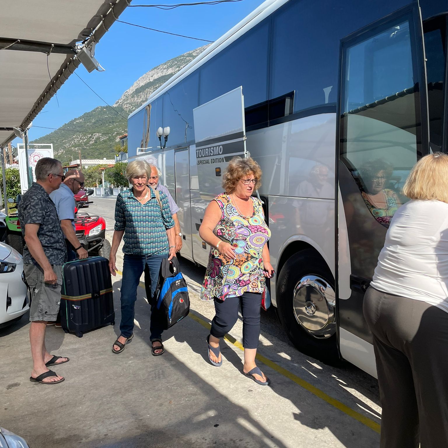 Om 14.00 uur staan en zitten we allemaal in de buurt van de receptie. Ondertussen heb ik al een appje gehad dat de bus iets later is. Typisch Grieks weten we ondertussen, altijd net wat te laat. Geen probleem, het weer is heerlijk en er valt genoeg te praten.