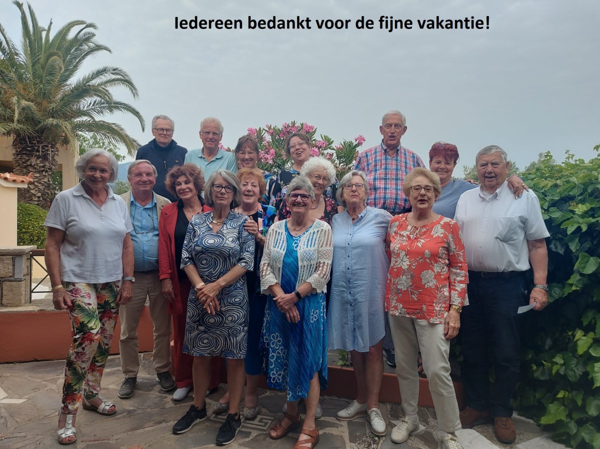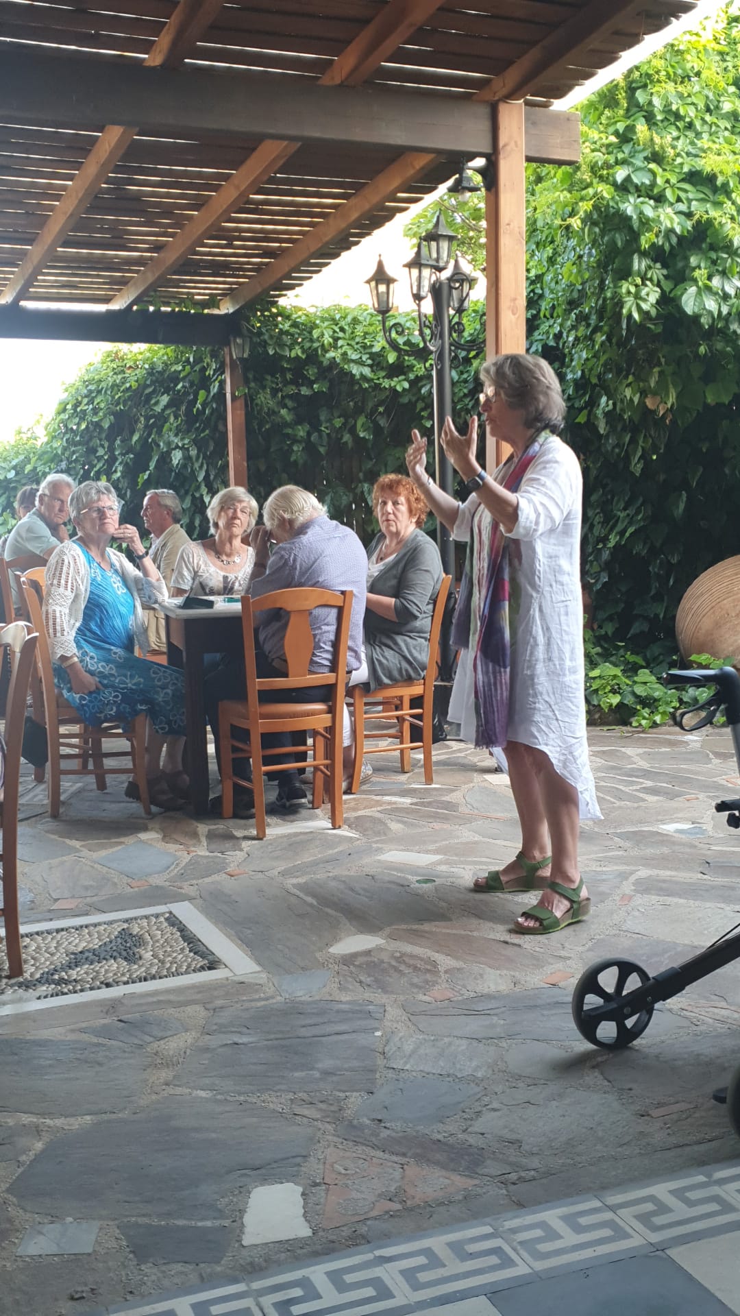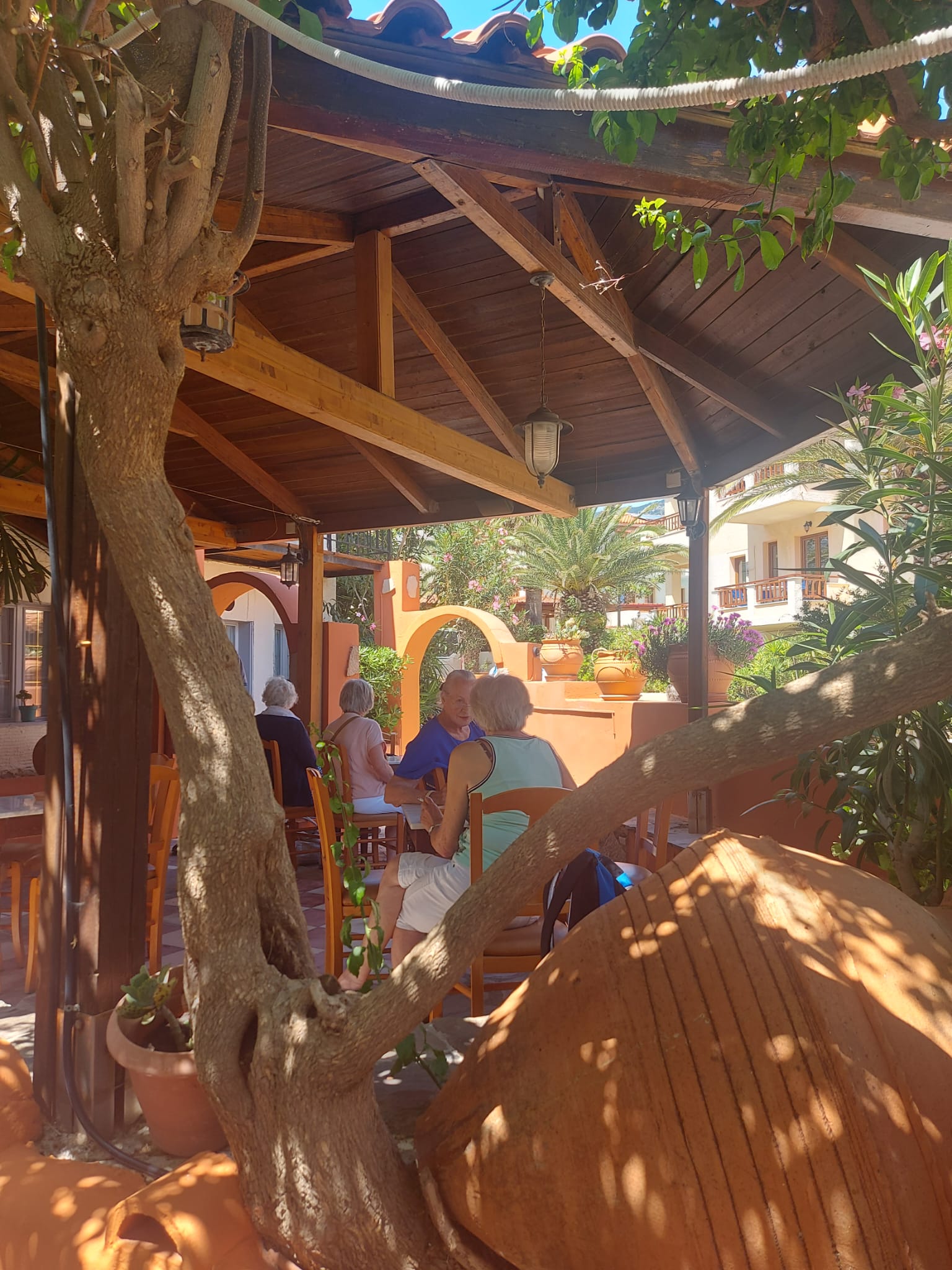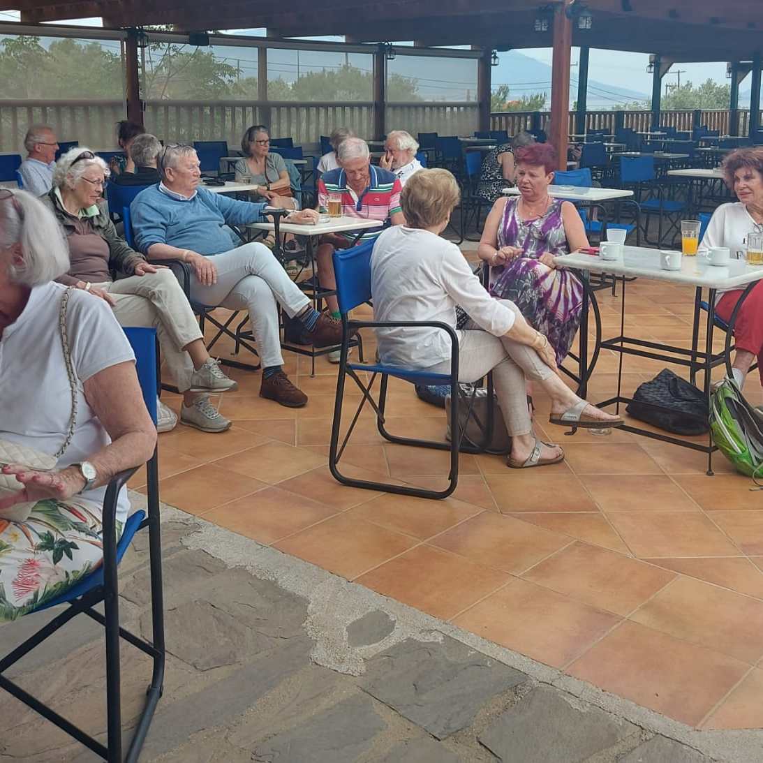 Om 14.00 uur staan en zitten we allemaal in de buurt van de receptie. Ondertussen heb ik al een appje gehad dat de bus iets later is. Typisch Grieks weten we ondertussen, altijd net wat te laat. Geen probleem, het weer is heerlijk en er valt genoeg te praten.