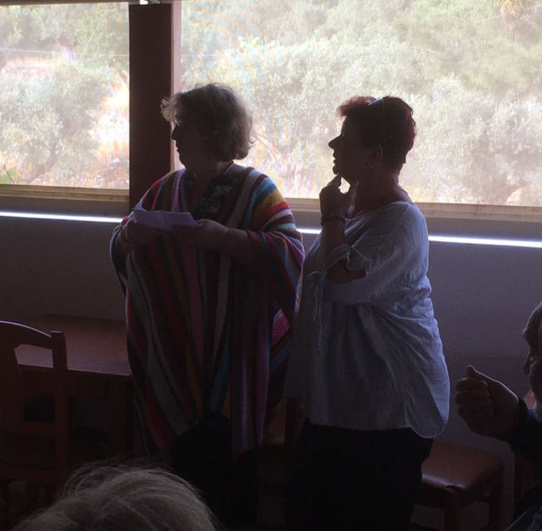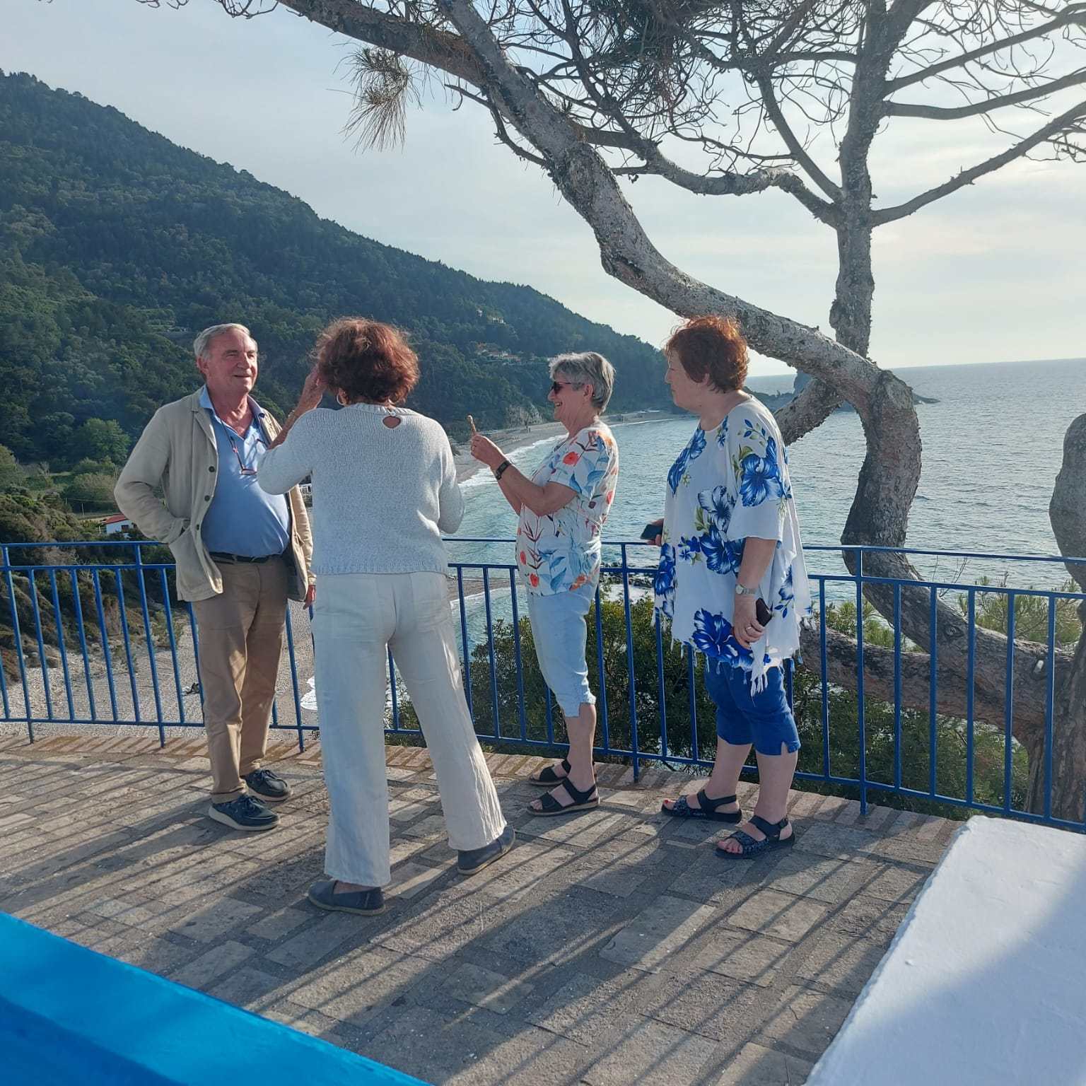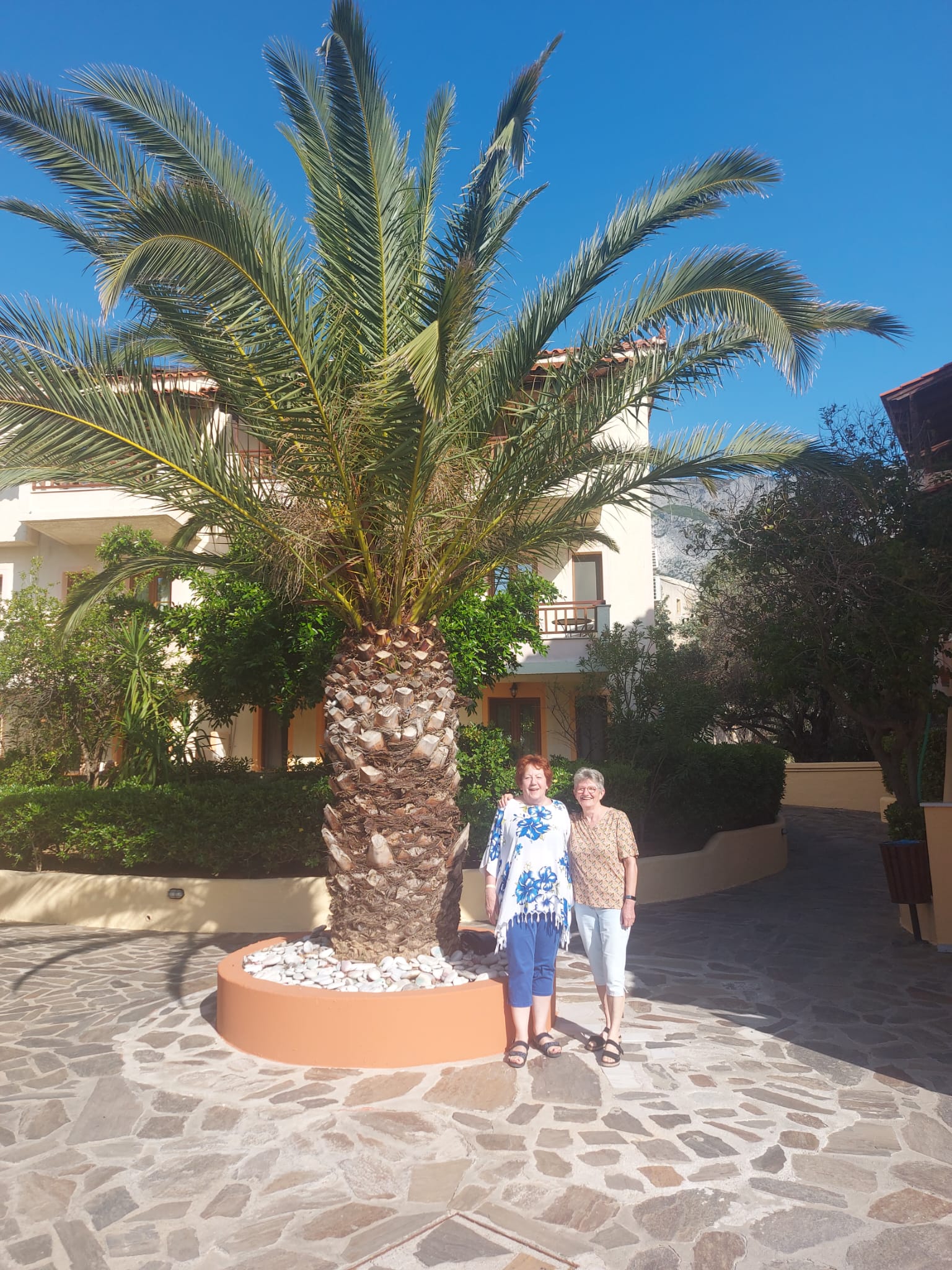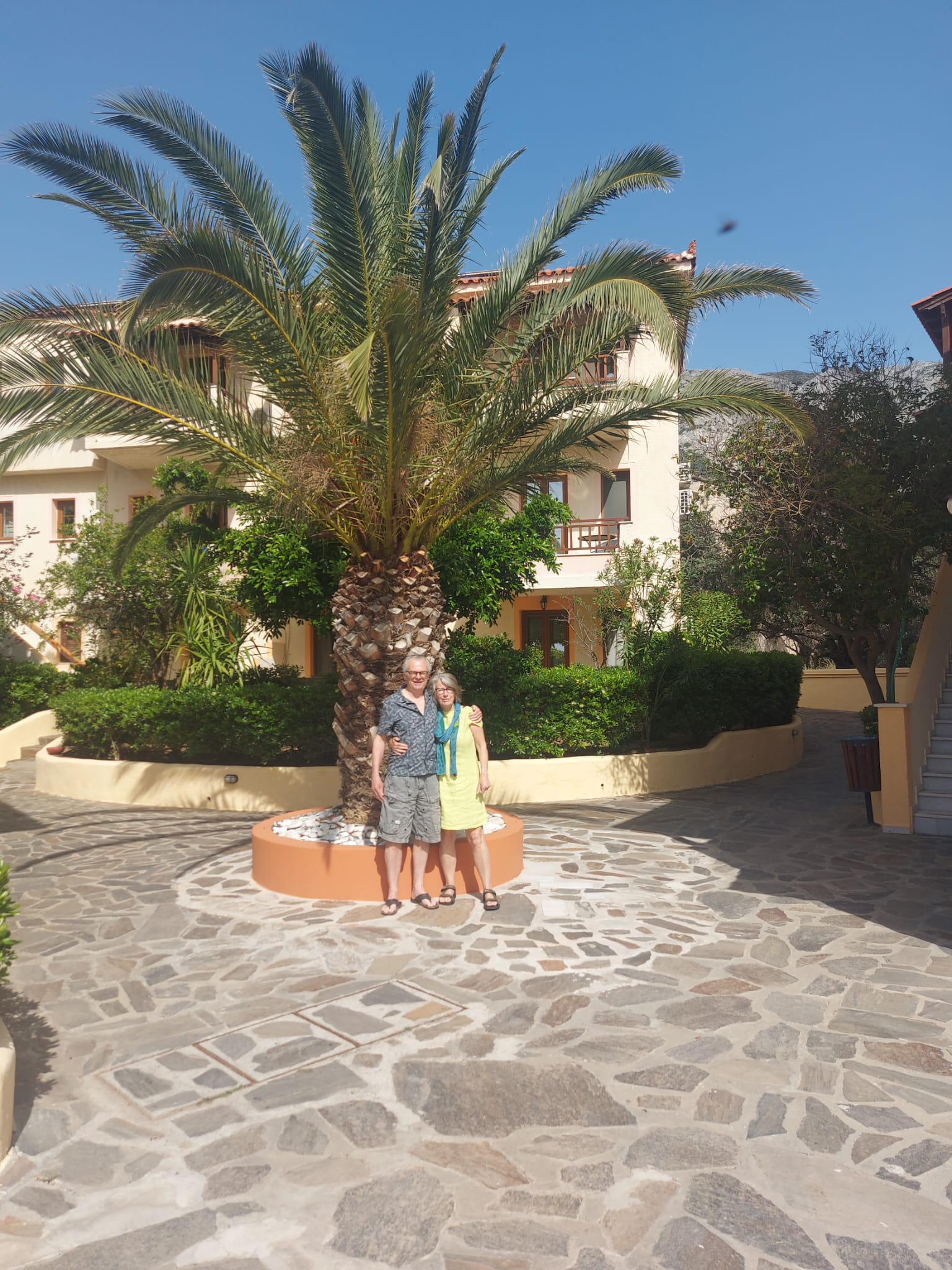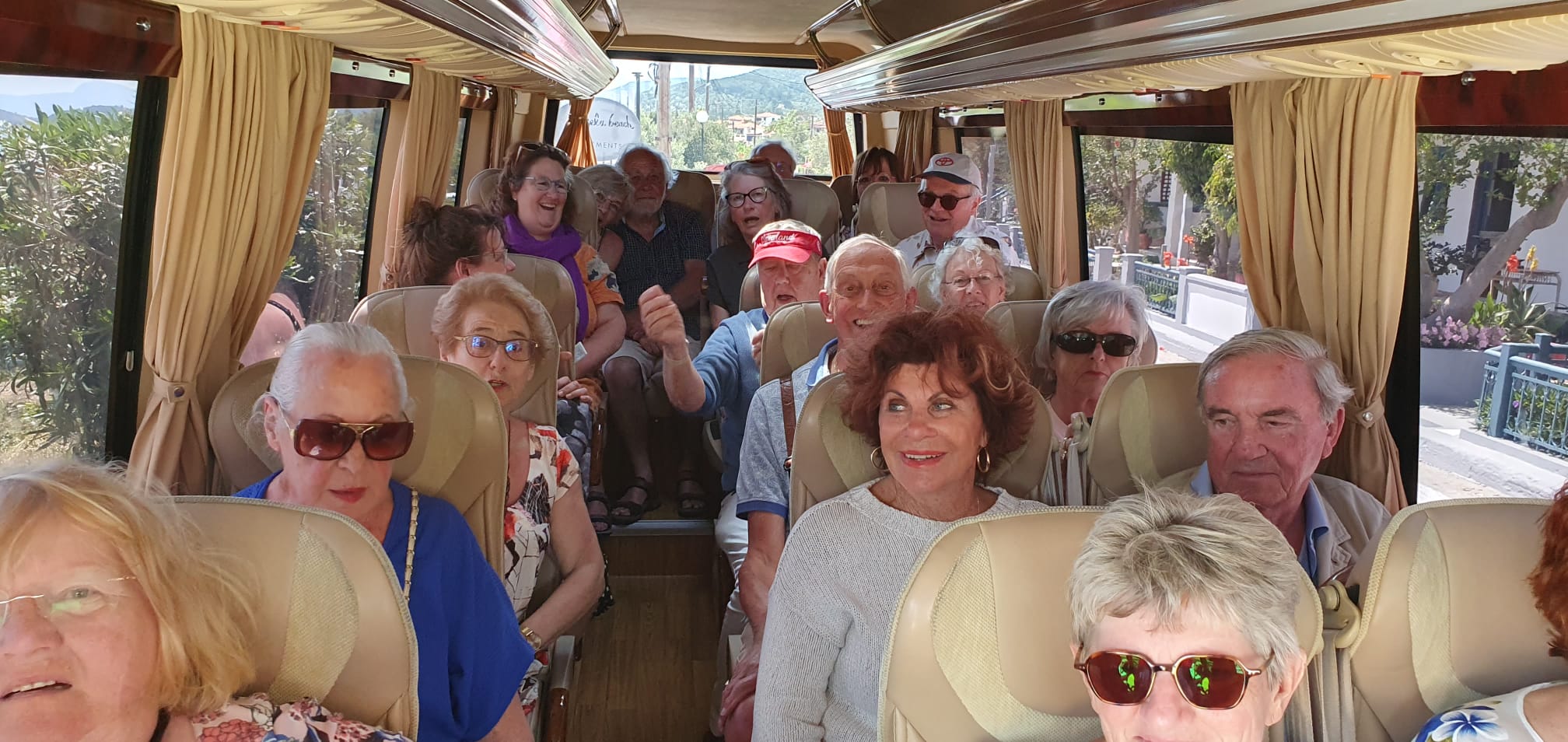 Om 14.00 uur staan en zitten we allemaal in de buurt van de receptie. Ondertussen heb ik al een appje gehad dat de bus iets later is. Typisch Grieks weten we ondertussen, altijd net wat te laat. Geen probleem, het weer is heerlijk en er valt genoeg te praten.