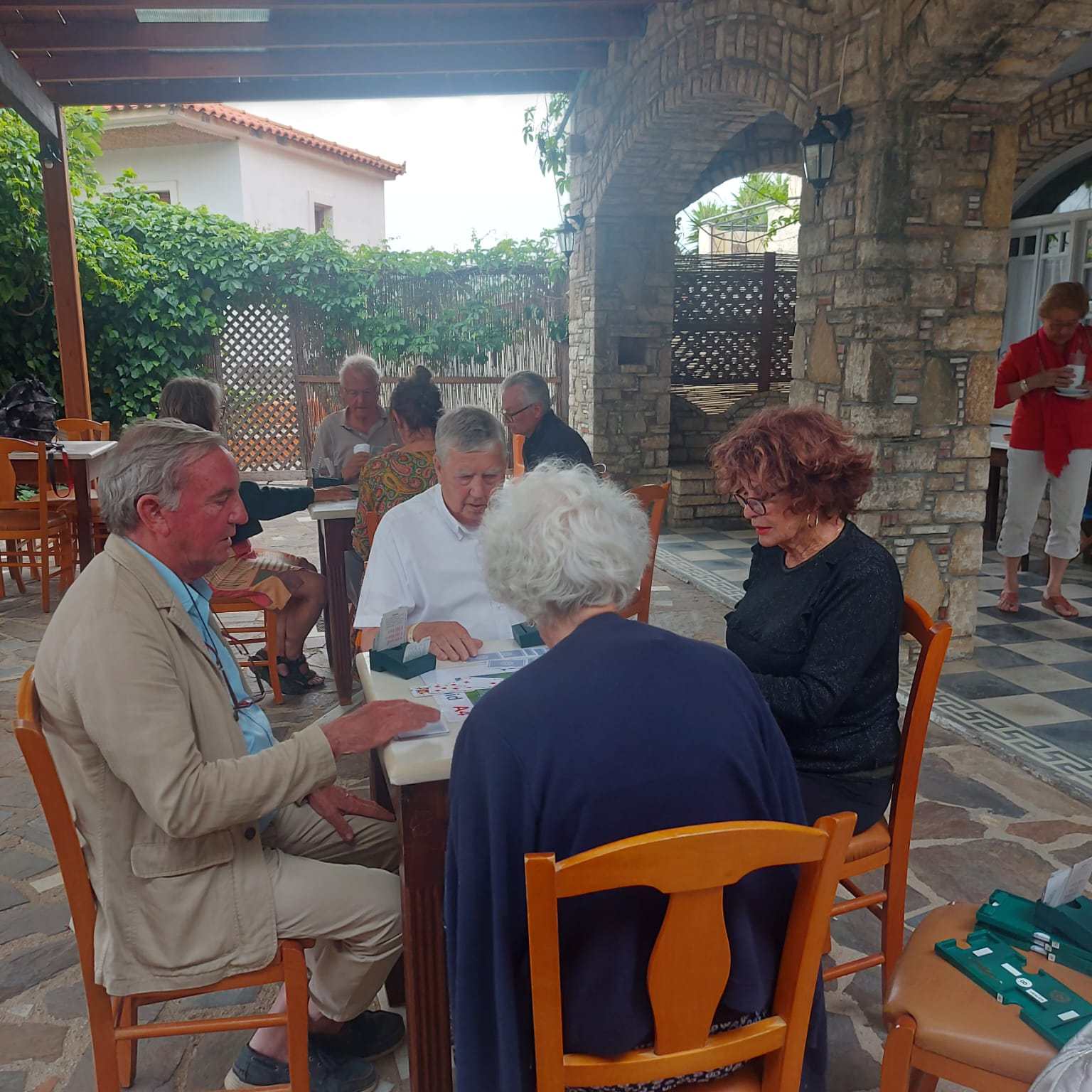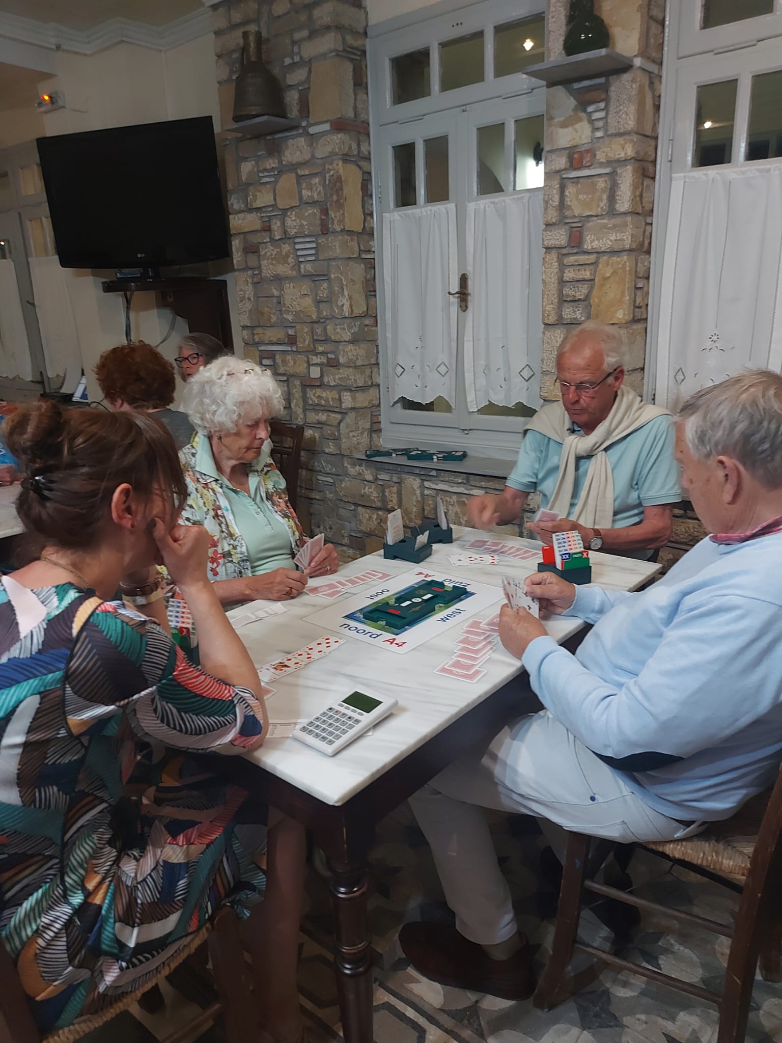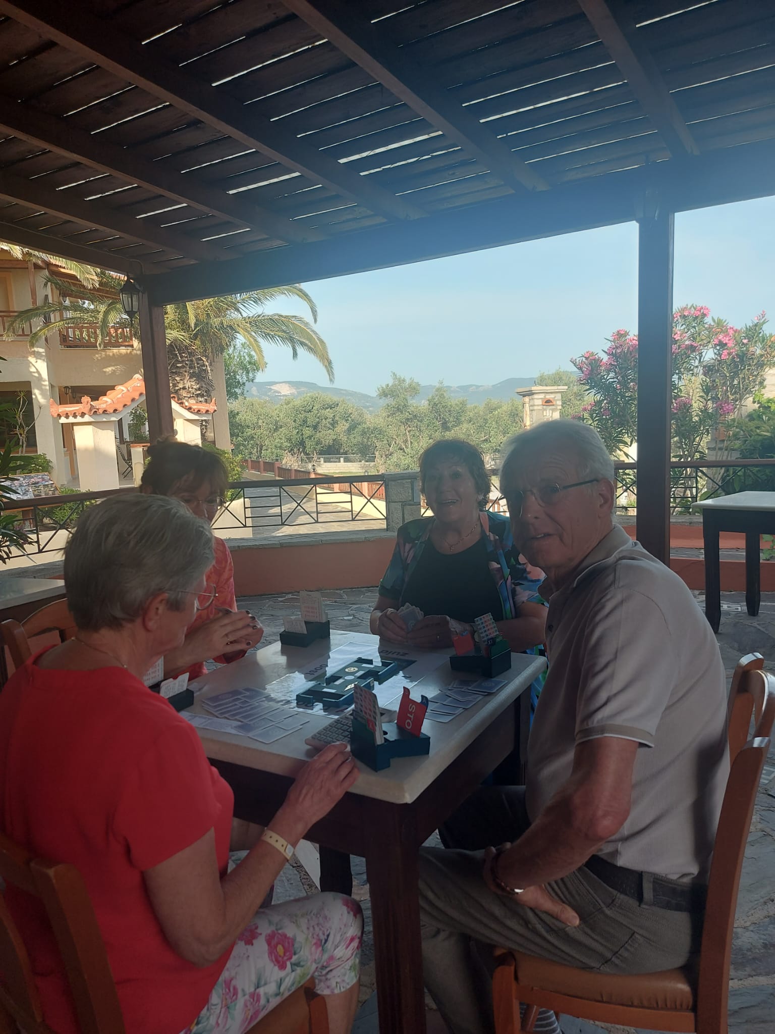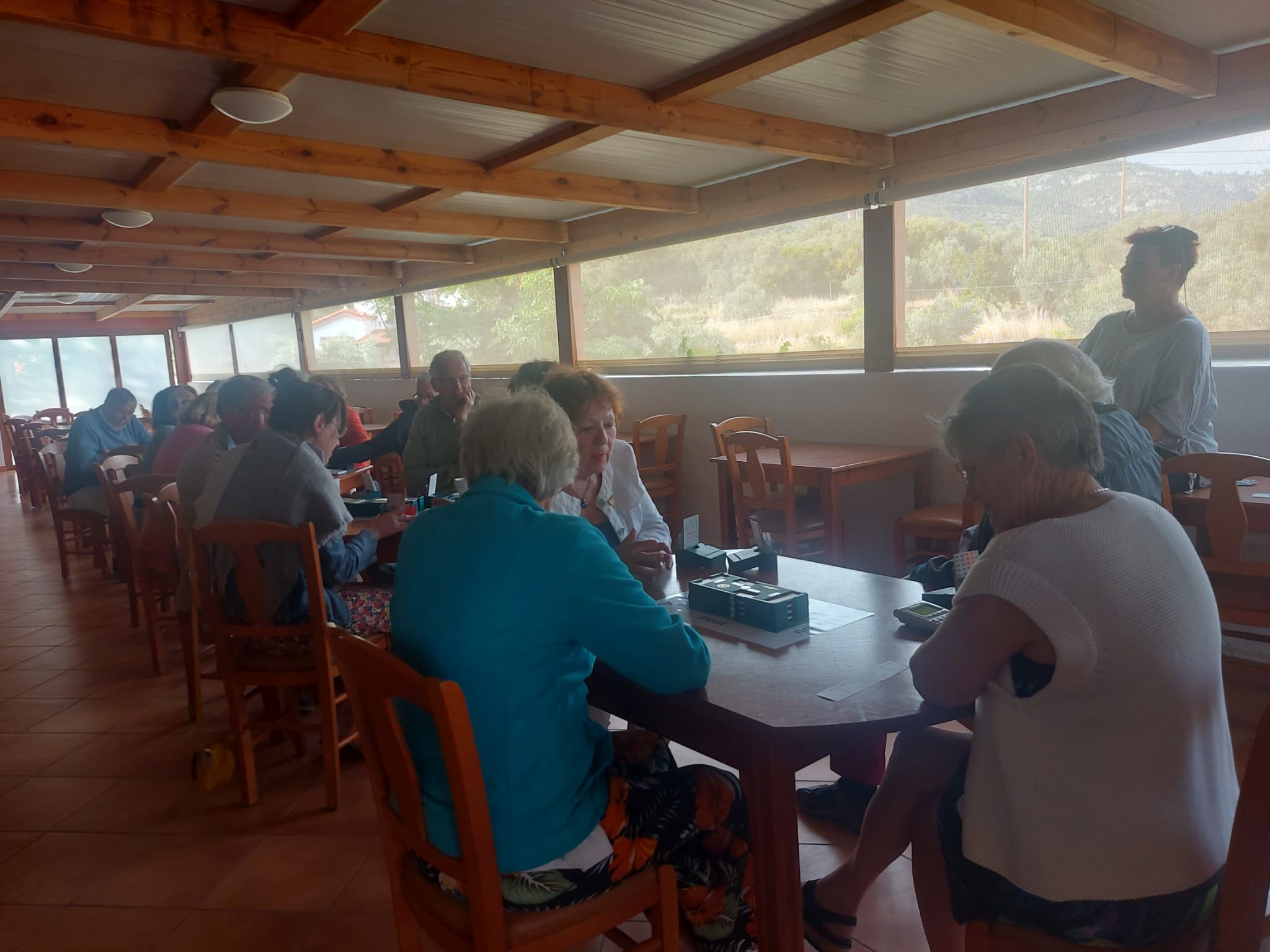 Om 17.45 uur was iedereen weer paraat om te gaan bridgen. Tanja heeft nog een leuke tip gegeven om een dorpje in de buurt te bezoeken; Ormos. Daarnaast ligt de lijst voor de boottochten op dinsdag en donderdag klaar om in te tekenen. Buiten bridgen vooraf aan het eten op een idyllisch plekje is erg leuk. Het zicht op de heuvels is magnifiek. Na het diner gaan we binnen verder. Naar de uitslag. Emmy en Leo zijn eerste geworden (laatste afbeelding).