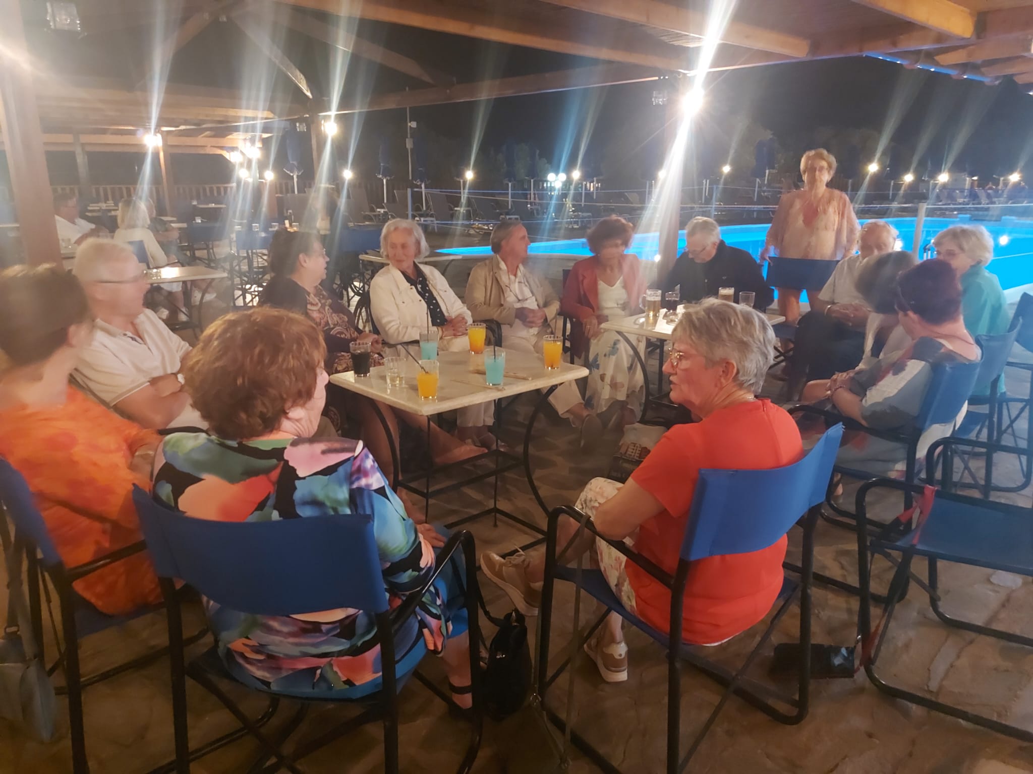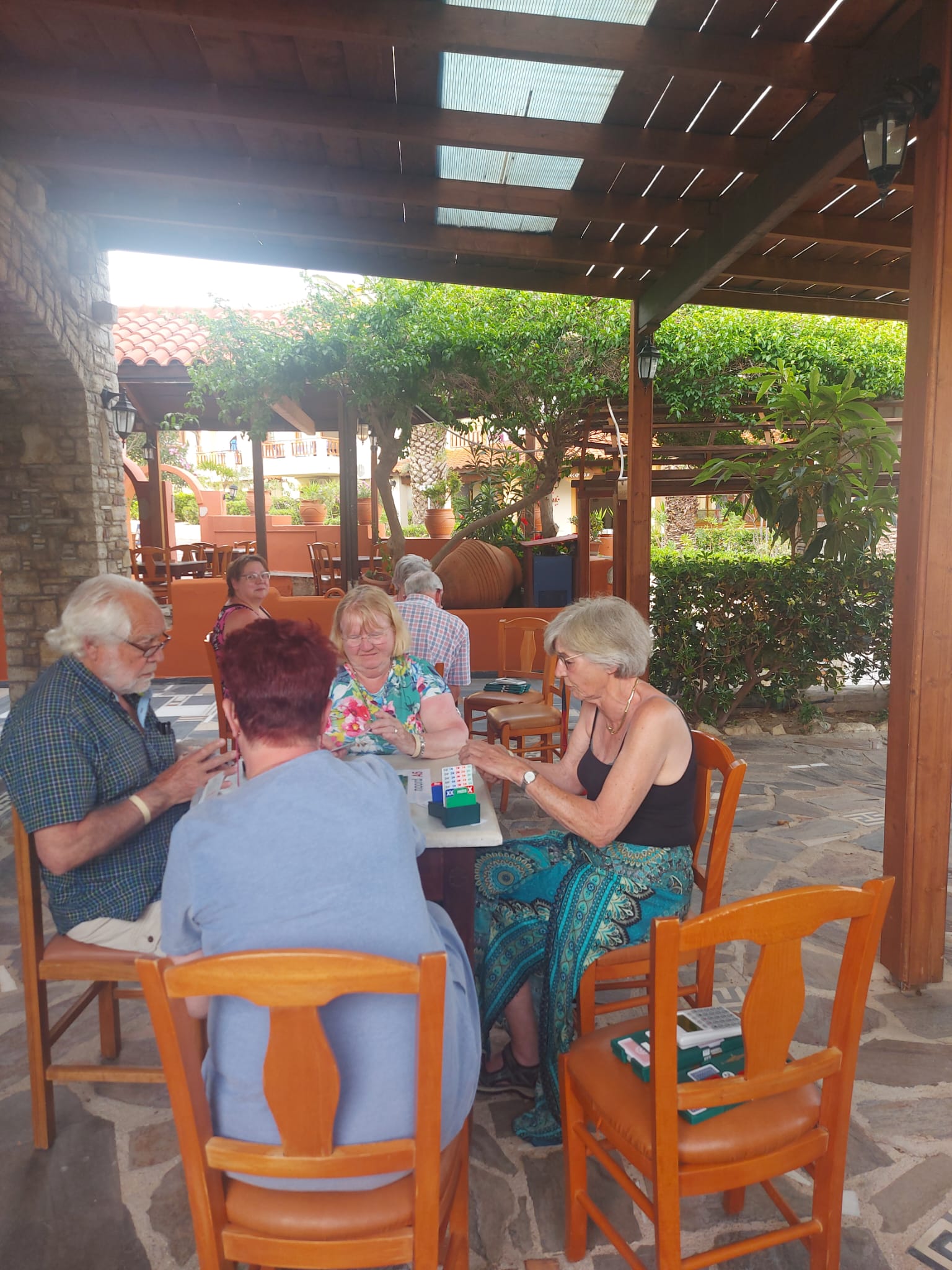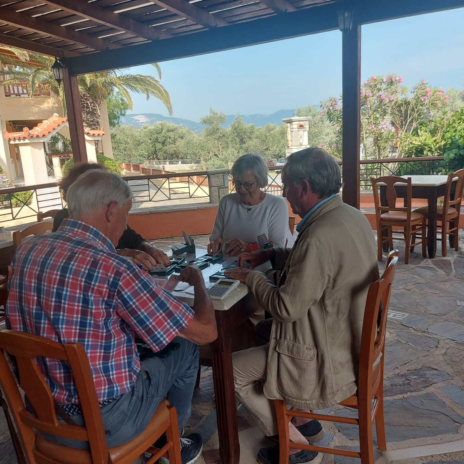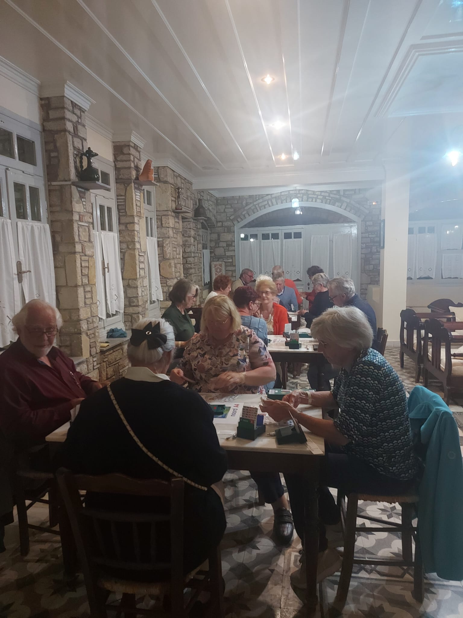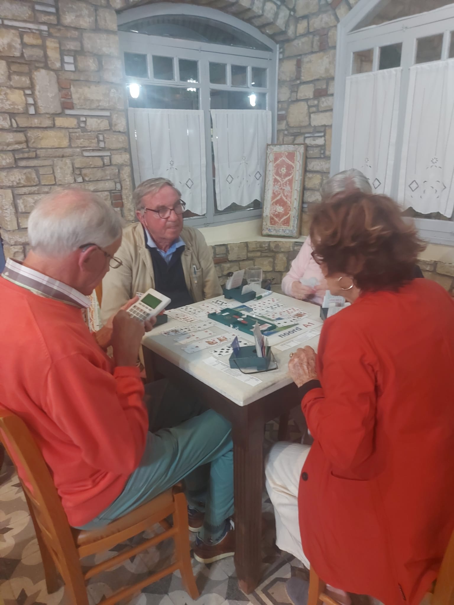 Om 17.45 uur was iedereen weer paraat om te gaan bridgen. Tanja heeft nog een leuke tip gegeven om een dorpje in de buurt te bezoeken; Ormos. Daarnaast ligt de lijst voor de boottochten op dinsdag en donderdag klaar om in te tekenen. Buiten bridgen vooraf aan het eten op een idyllisch plekje is erg leuk. Het zicht op de heuvels is magnifiek. Na het diner gaan we binnen verder. Naar de uitslag. Emmy en Leo zijn eerste geworden (laatste afbeelding).