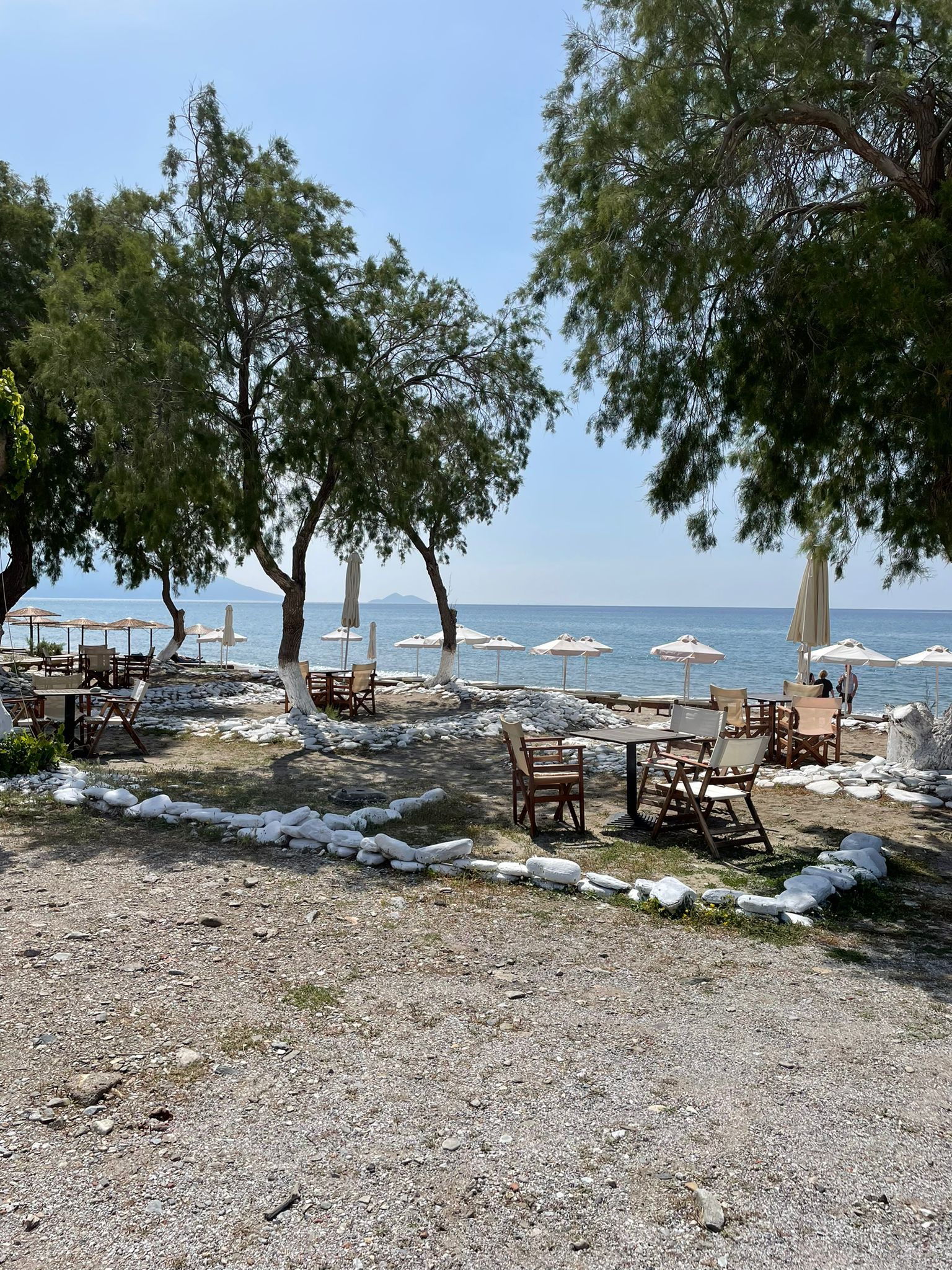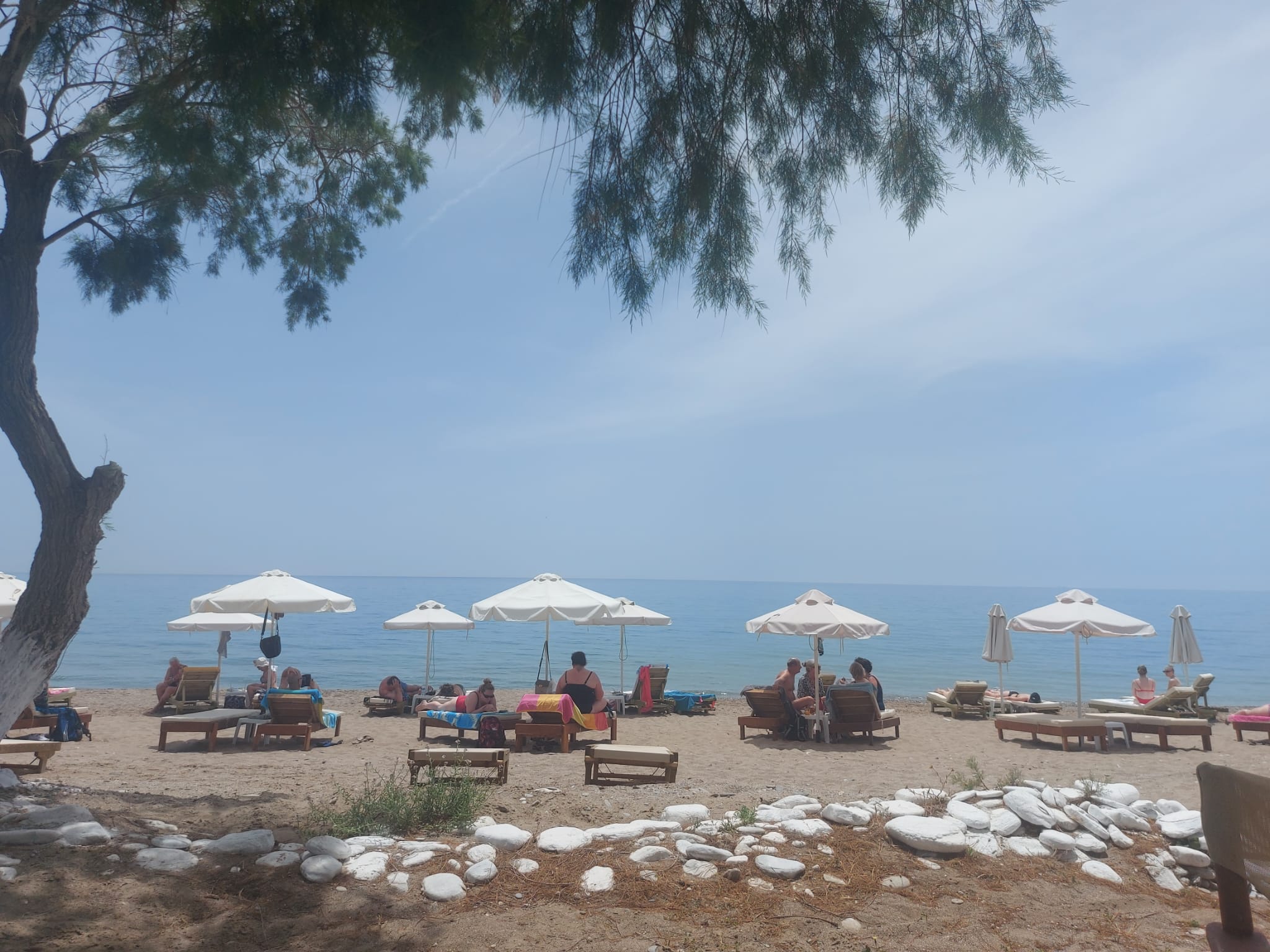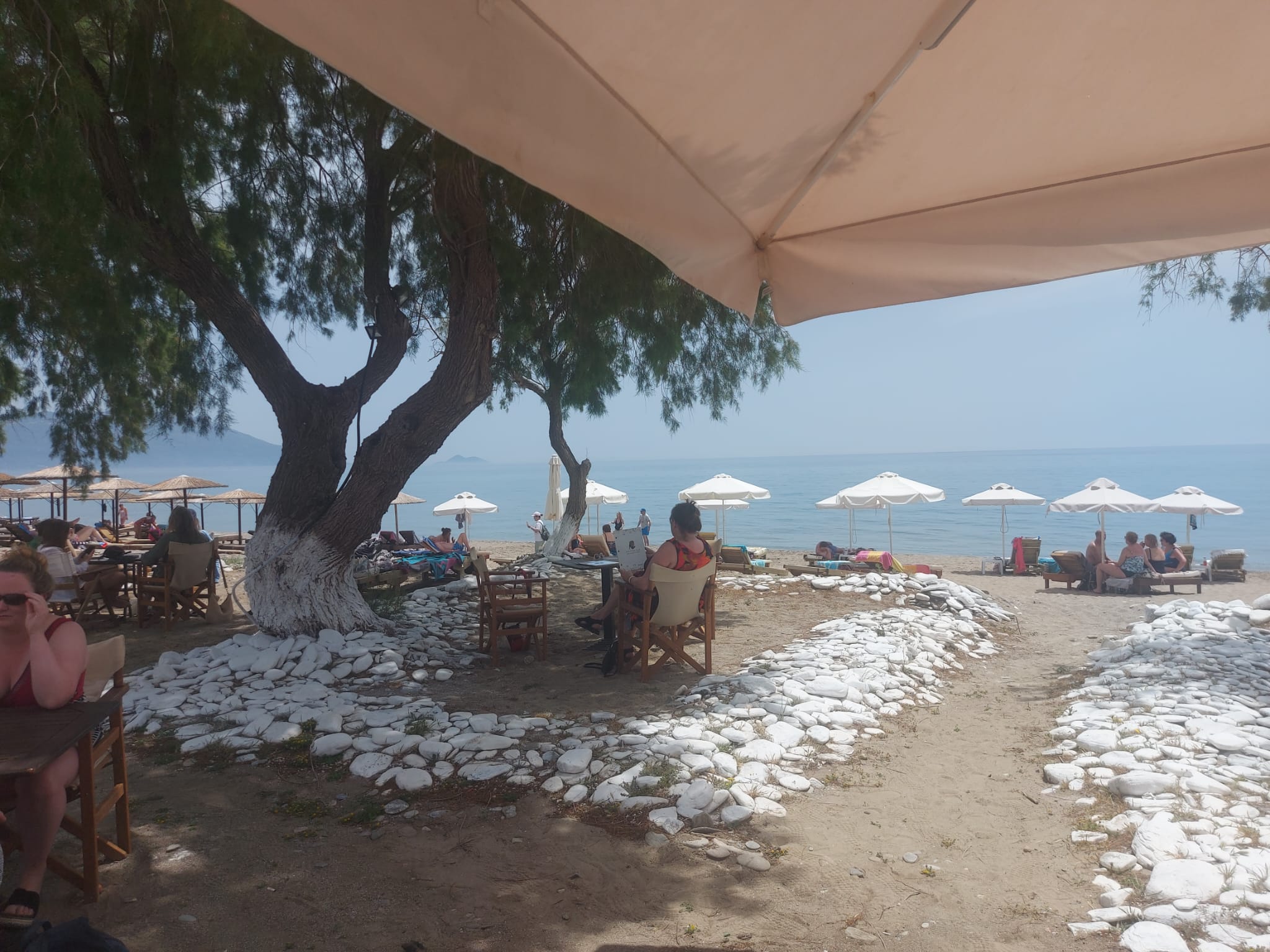We lopen in een paar minuten naar de zee. Het is een heerlijk zonnige dag. Echt strandweer. Tegenover restaurant Kleopatra zijn gratis strandbedden en parasols. Doen ze slim, ze leggen meteen de drank- en lunchkaart neer. We liggen met acht mensen van de groep lekker te lezen, wat te keuvelen of te slapen. Het zeewater mag nog wat warmer, maar het is goed te doen. Lunchen bij Kleoptra kan heerlijk in de schaduw onder een boom.