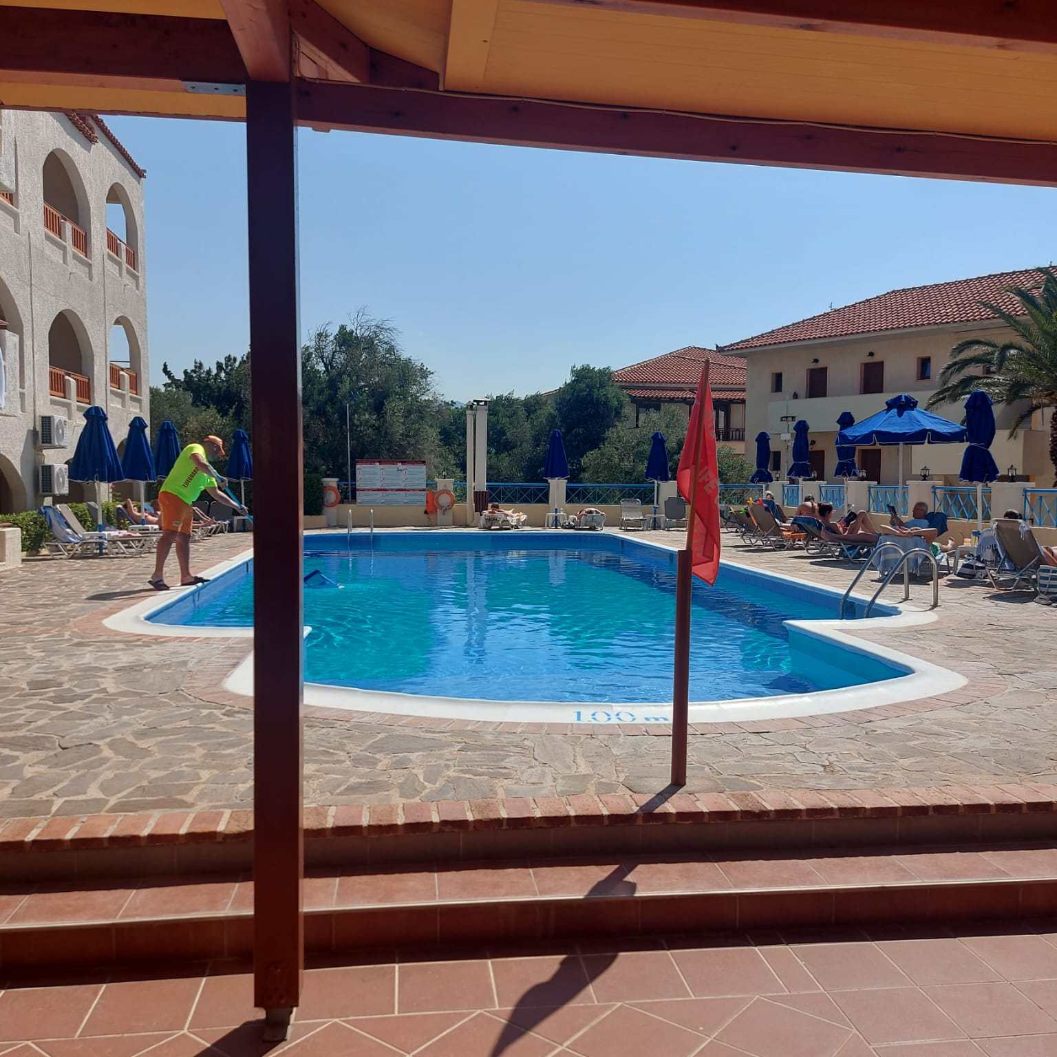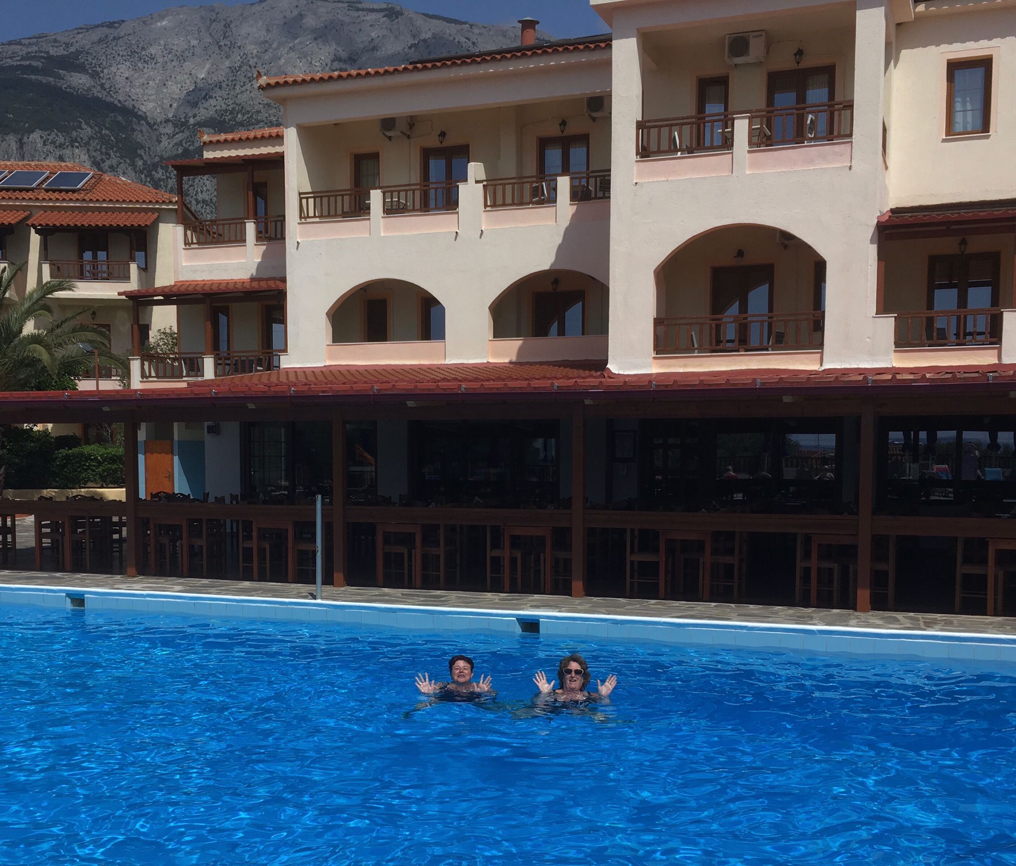 Het is nu heerlijk weet in Samos. We zitten met een groepje bij het zwembad. Verder zijn gasten het dorp aan het verkennen. Vergeten spulletjes zoals tandpasta worden in het supermarktje 80 meter van ons resort gekocht. Ook gisteren zijn er al inkopen gedaan. Een mooie nieuwe broek, een strandlaken wat fris en drank voor op de kamer. Elke kamer heeft een koelkast. Tenslotte is het ook lekker om eens op het balkon te zitten met een drankje.