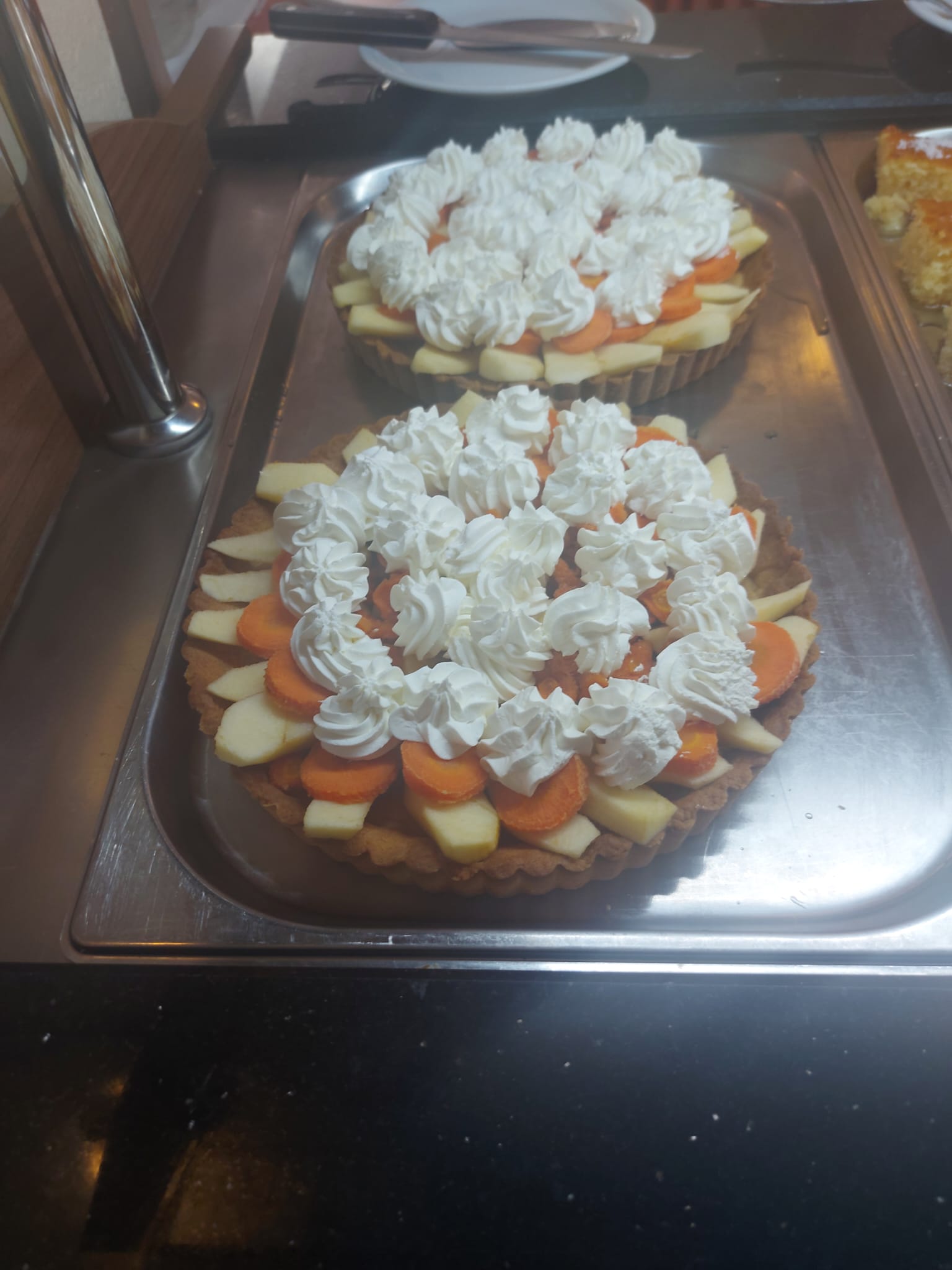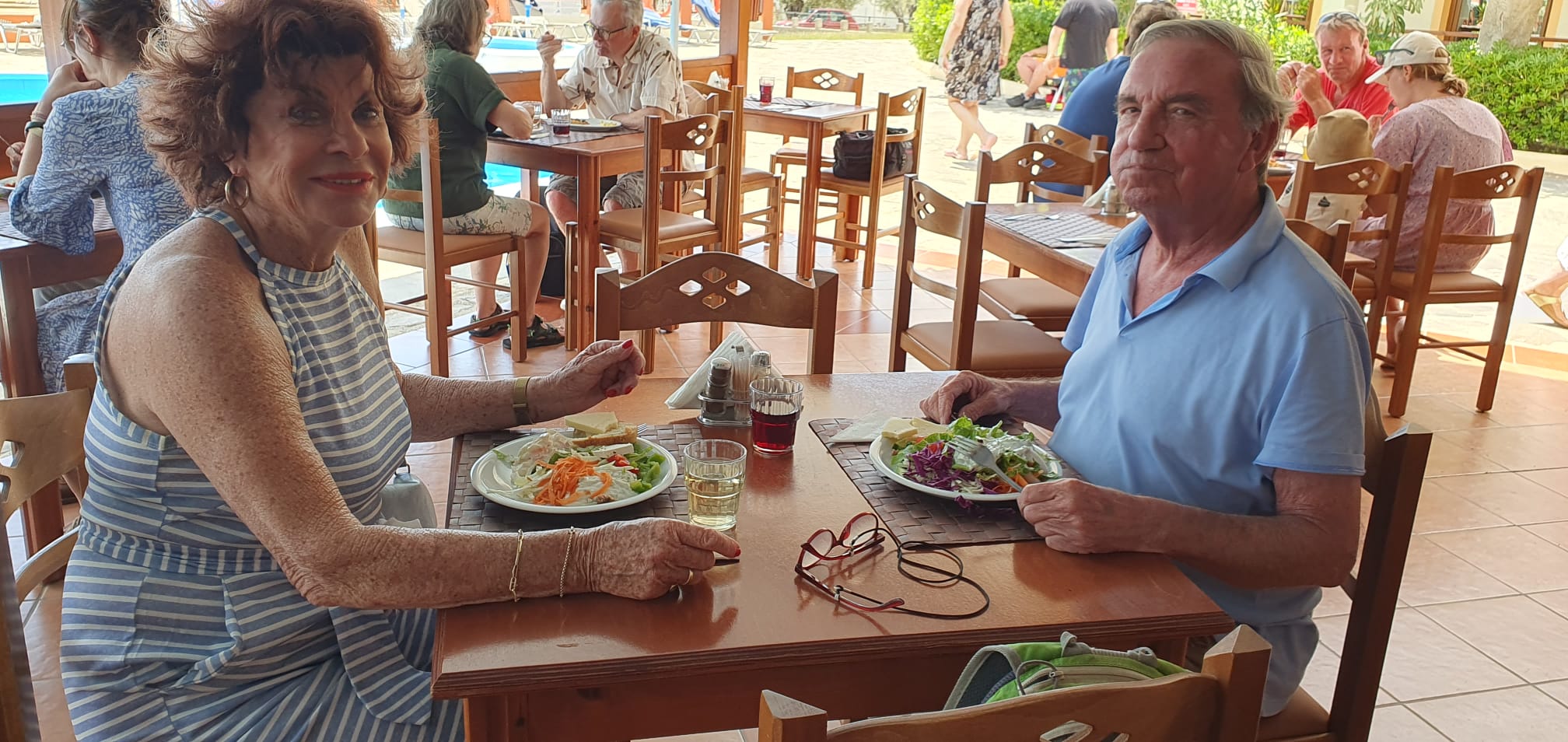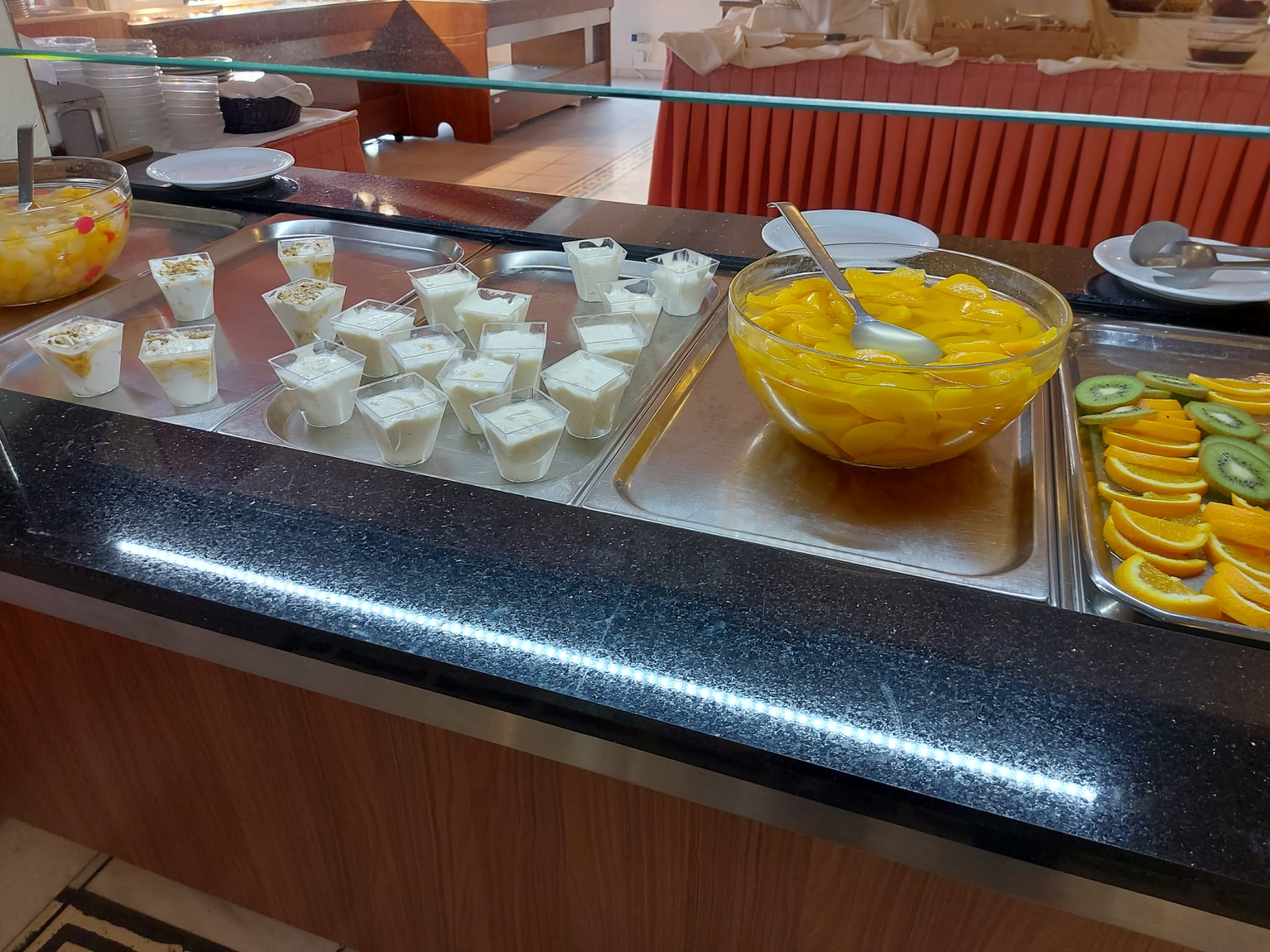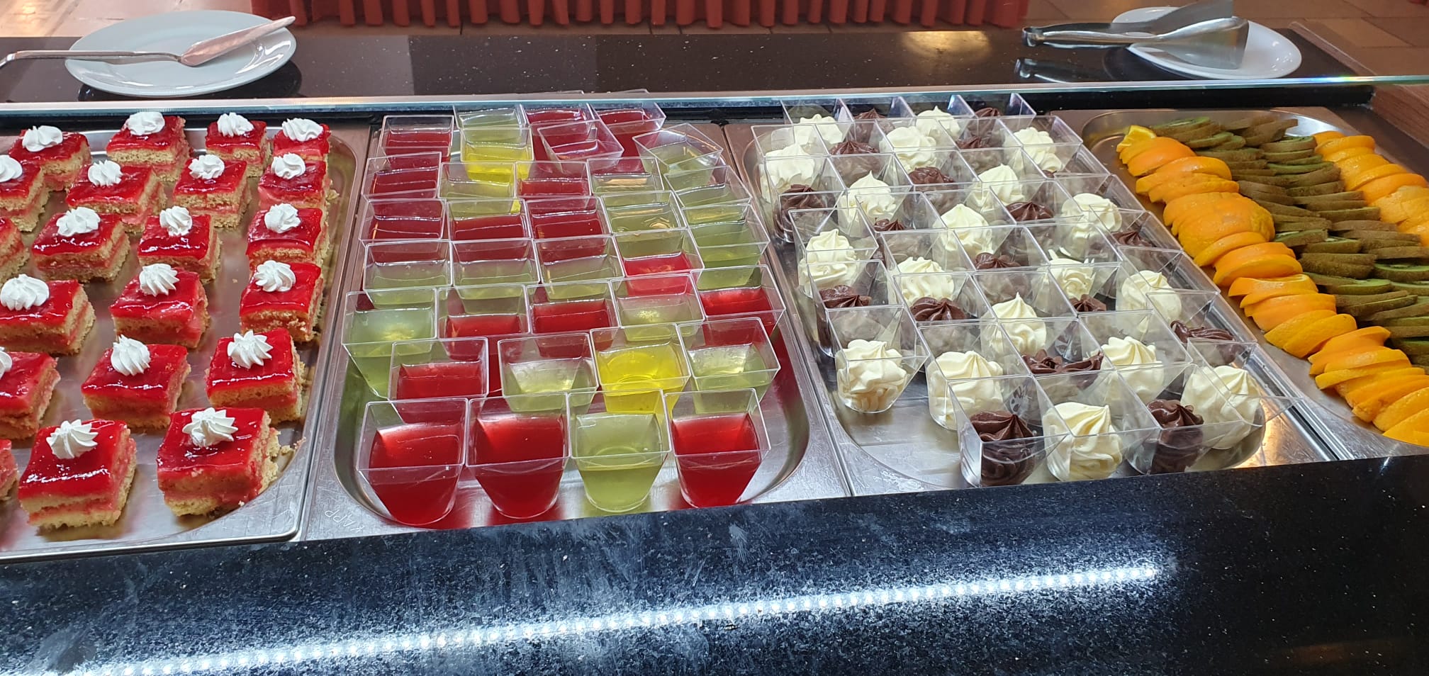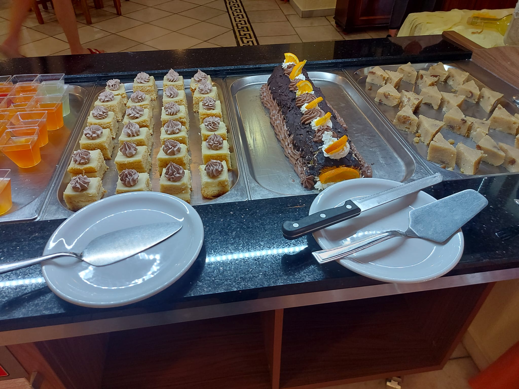 De lunch is van 13.00 uur tot 14.30. Een heerlijk saladebuffet. Het warme buffet bevatte onder andere: paella, kiprollade, mals varkensvlees, verse groenten, frietjes en quiche lorraine. Daarnaast zijn er ook heerlijke toetjes. De manager Nikos en de chefkok zorgen goed voor ons.