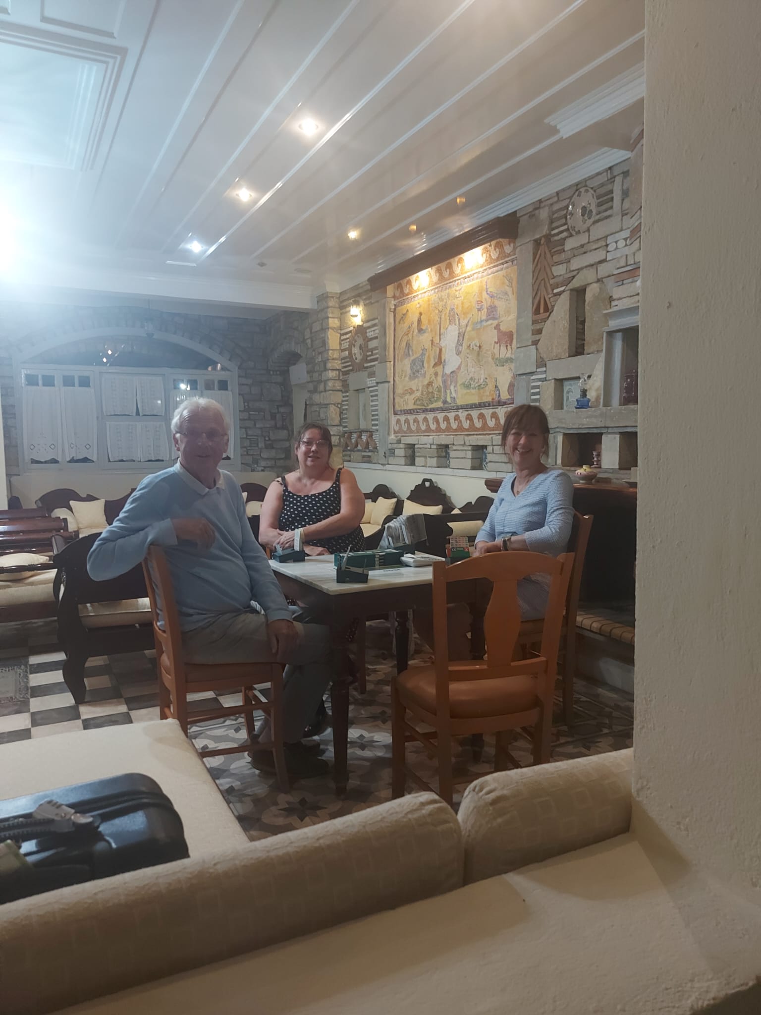 Ons werd verteld van alles van te kaart te bestellen zodat we zoals de Grieken dat doen alles delen en kunnen proeven. Gebakken kaas, fetakaas uit de oven, grote kidneybeans in de knoflook, garnalen tzatiki, twee soorten gehaktballetjes en varkensvlees. Steeds kwam er een gerecht, heerlijk van smaak en lekker warm. Grote glazen verse jus d’ Orange, wijn, koffie en een toetje. Voor net aan 21 euro per persoon hebben we een hele gezellige avond gehad met heerlijk eten en drinken.