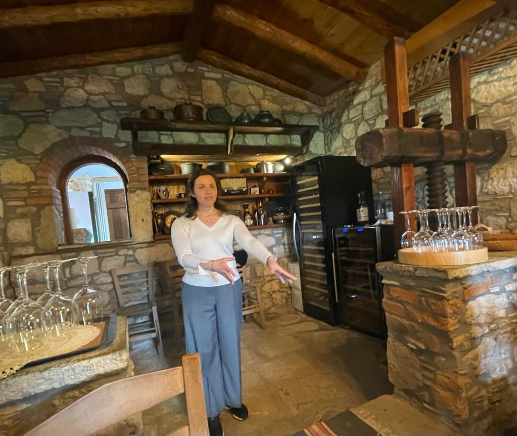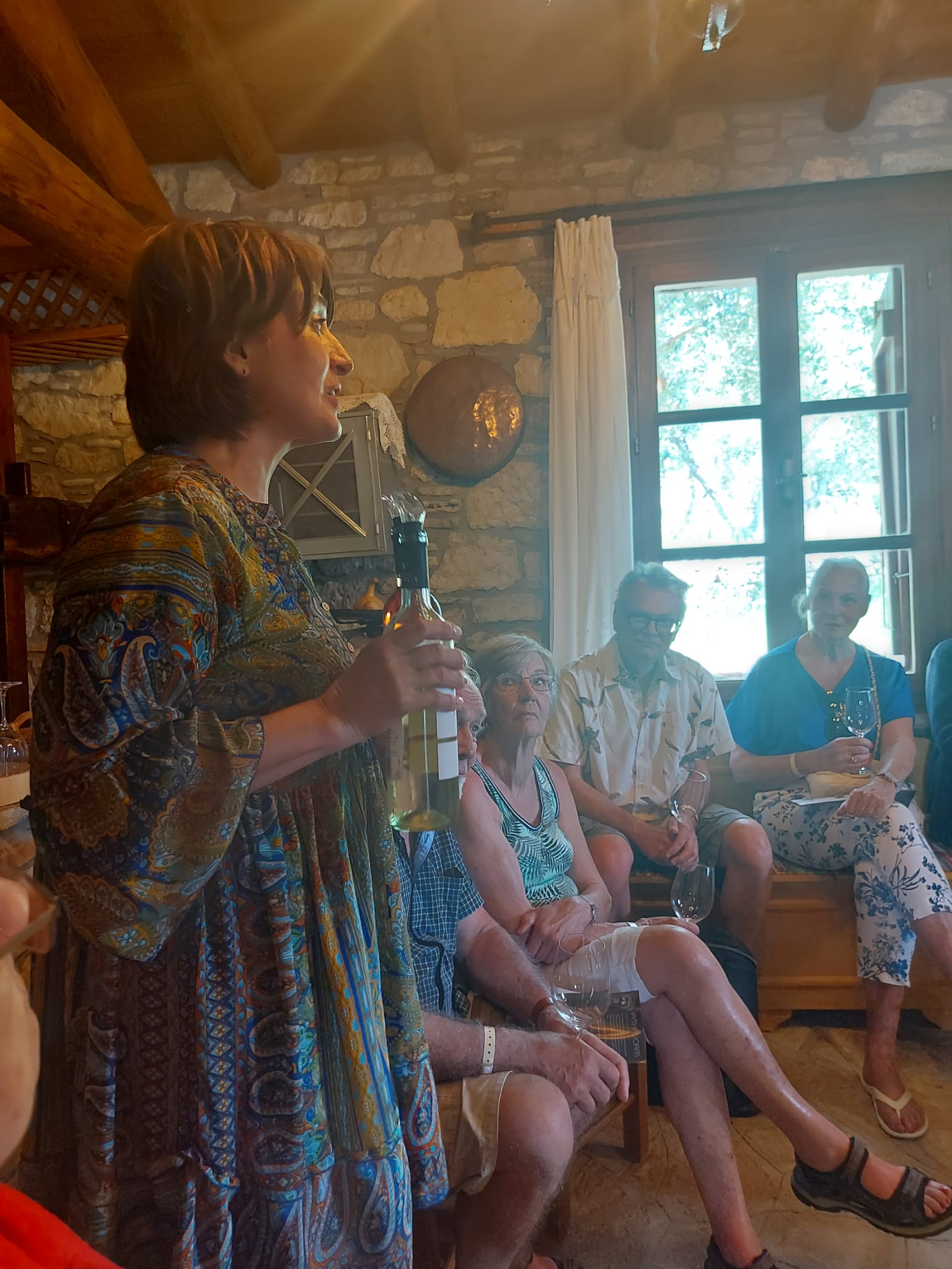 Doordat we niet rijden met een grote bus, kunnen we op weg naar onze eerste stop door pittoreske dorpjes rijden. We gaan binnendoor naar Leka. Daar bevindt zich een wijngaard en fabriek waar ze uiteraard Griekse wijn maak. We worden ontvangen in een oud huis waar vroeger de familie ook echt gewoond heeft. We krijgen uitleg over het huis en natuurlijk over de wijn. We krijgen mooie grote glazen en zes wijnen te proeven. Van droog naar semi-droog en daarnaast een dessertwijn en een dessertlikeur. Heerlijk zoet uiteraard.