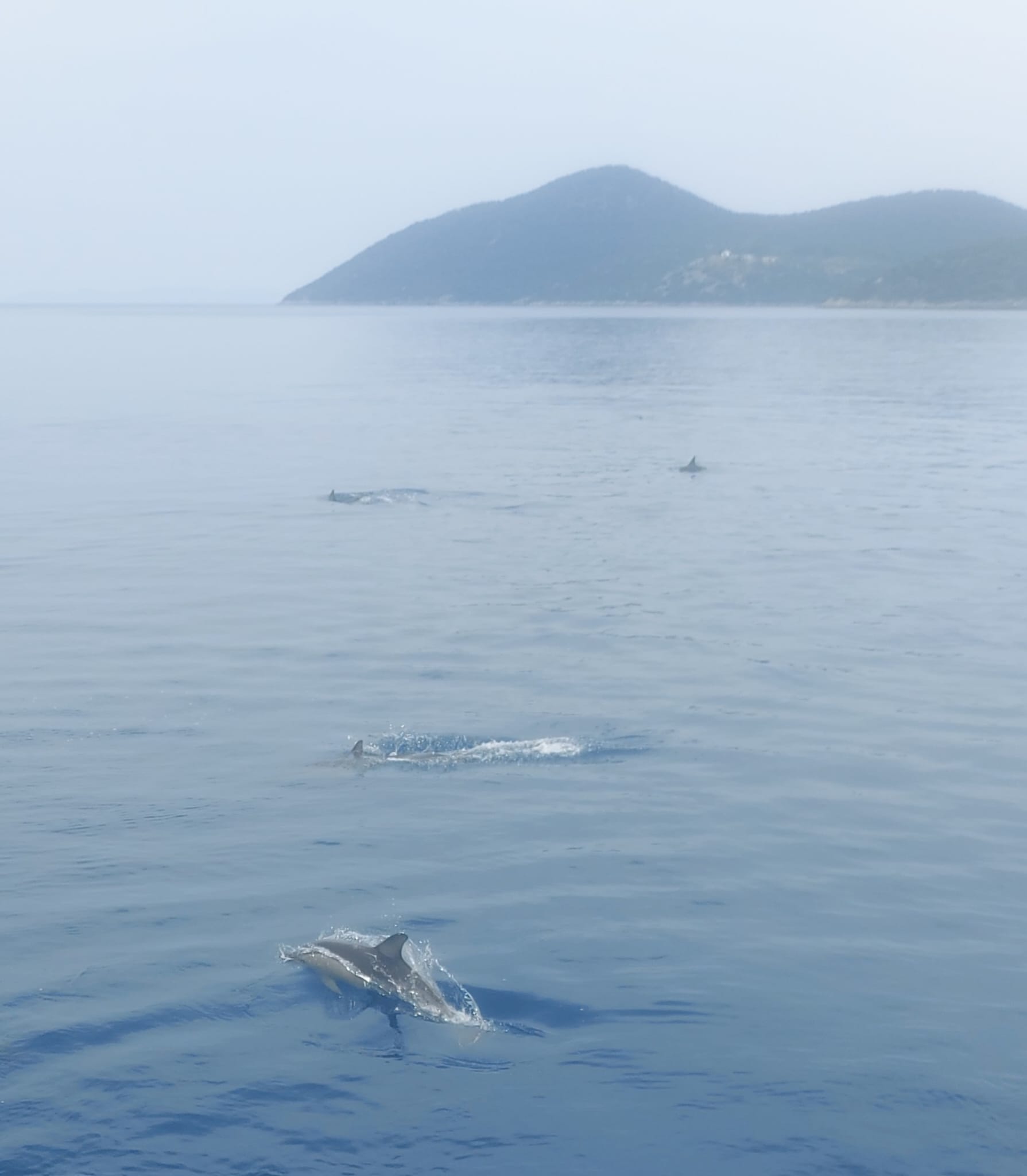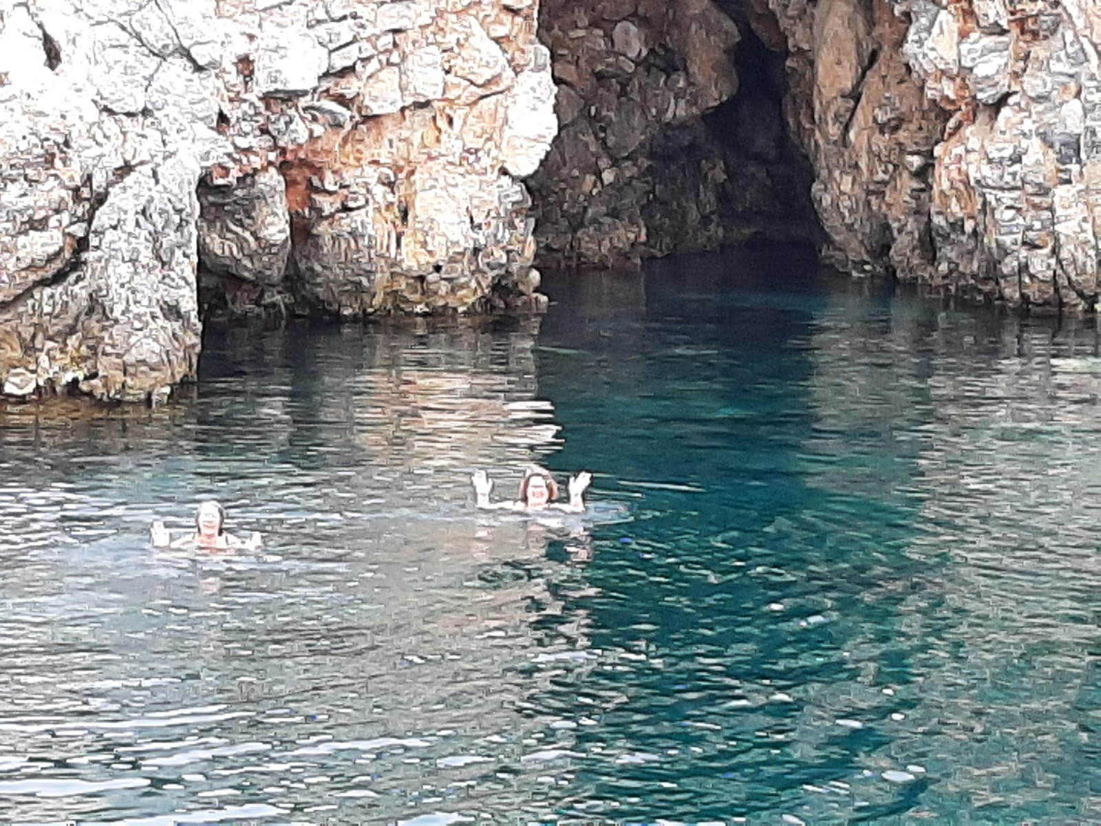 Tot onze grote verrassing vond een groep dolfijnen het tijd worden voor een speelkwartier rond onze boot. We stonden op de banken en het voordek om niks te missen. Wat een kadootje op deze mooie dag. Nadat we weer tot “rust” waren gekomen ging de tocht verder. Op weg naar de grot om vanaf de boot het water in te gaan om daarheen te zwemmen. Na drie kwartier gingen we verder varen en kregen we nog een bakje fruit ( uit blik).