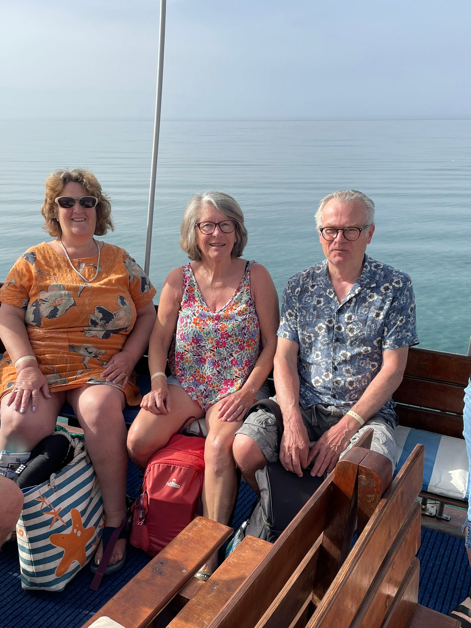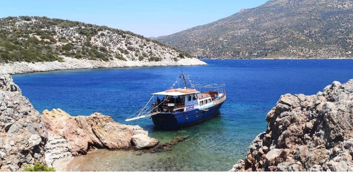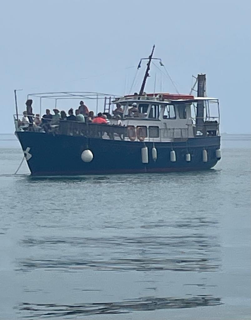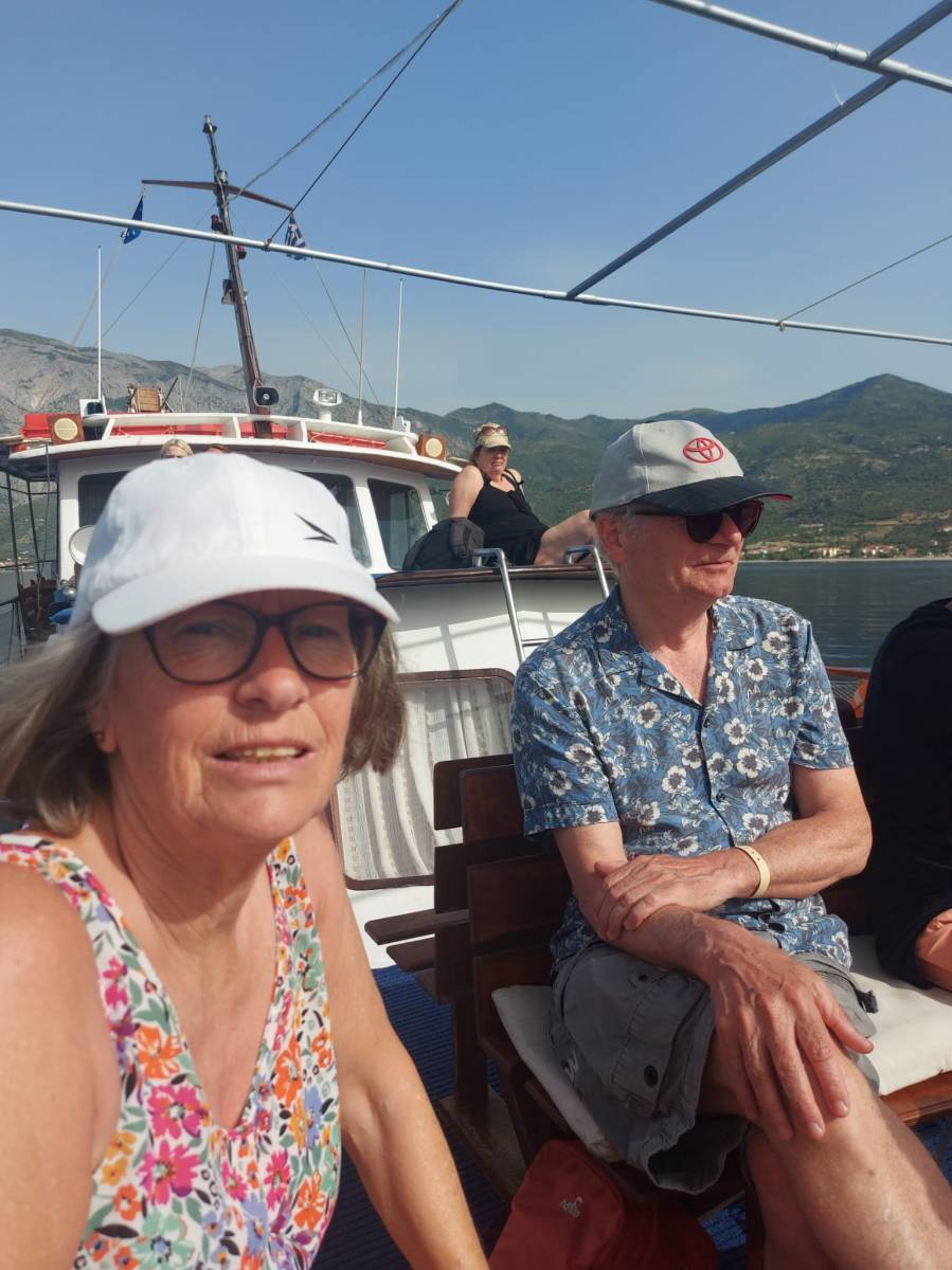 Hoe leuk was het om Kampos binnen te varen en vanaf het strand toegezwaaid te worden door mensen van onze groep. Marion heeft een prachtige foto gemaakt van de boot. Donderdag gaan we met dezelfde boot een kleinere tocht maken langs de kust.