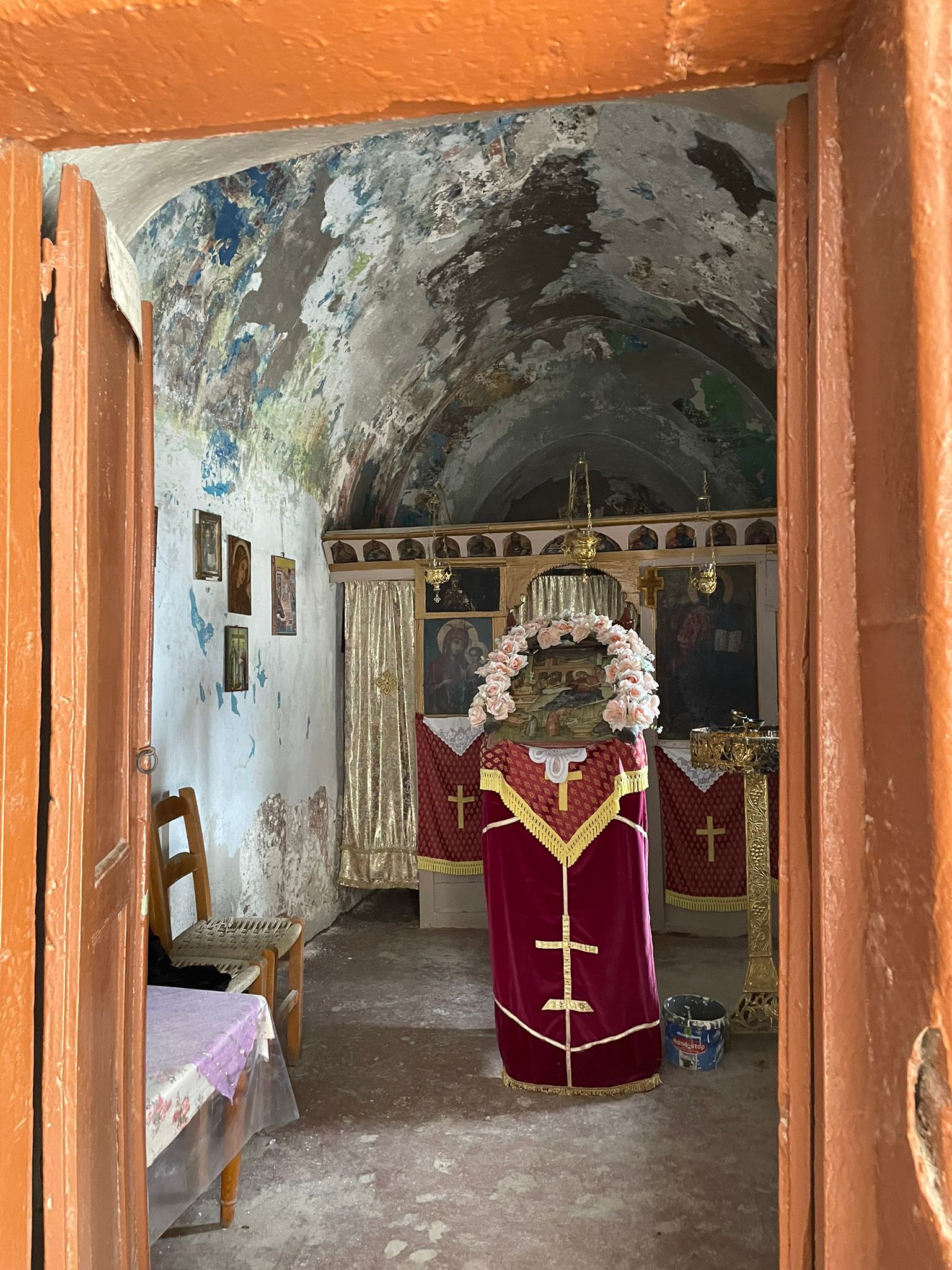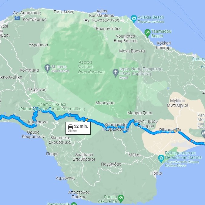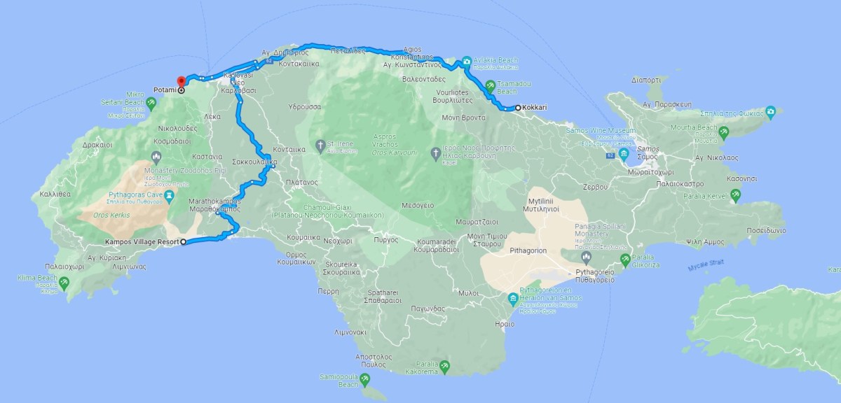 We rijden weer terug naar Karlovasi. Alhoewel het dezelfde weg is ziet het er toch anders uit. We rijden door Karlovasi via de kustweg naar Potami. Karlovasi is aan de kust on 2020 erg getroffen door de aardbeving. Huizen en fabrieken zijn verwoest. In Potami staat een heel klein kerkje. Daarnaast hebben we een prachtig uitzicht over zee en een mooie mozaïek op de vloer.
