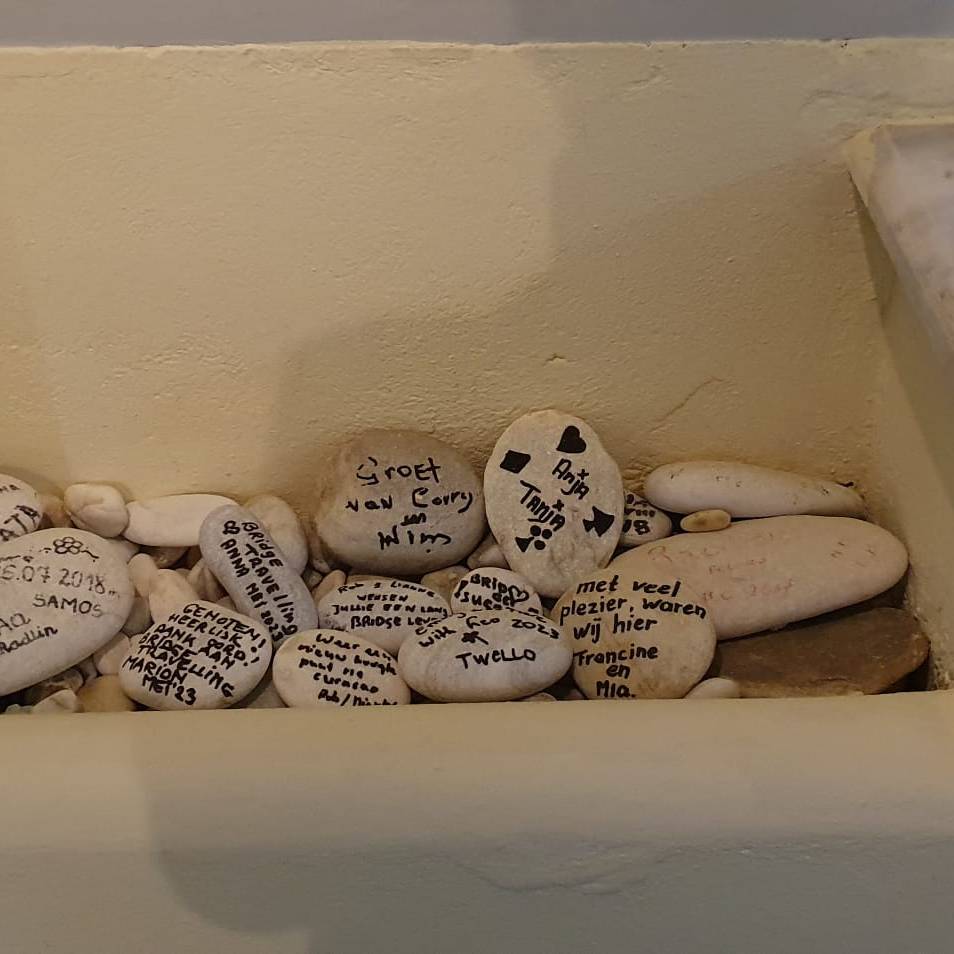 Wat erg leuk is hier in het hotel is dat het gastenboek geen boek is maar stenen.