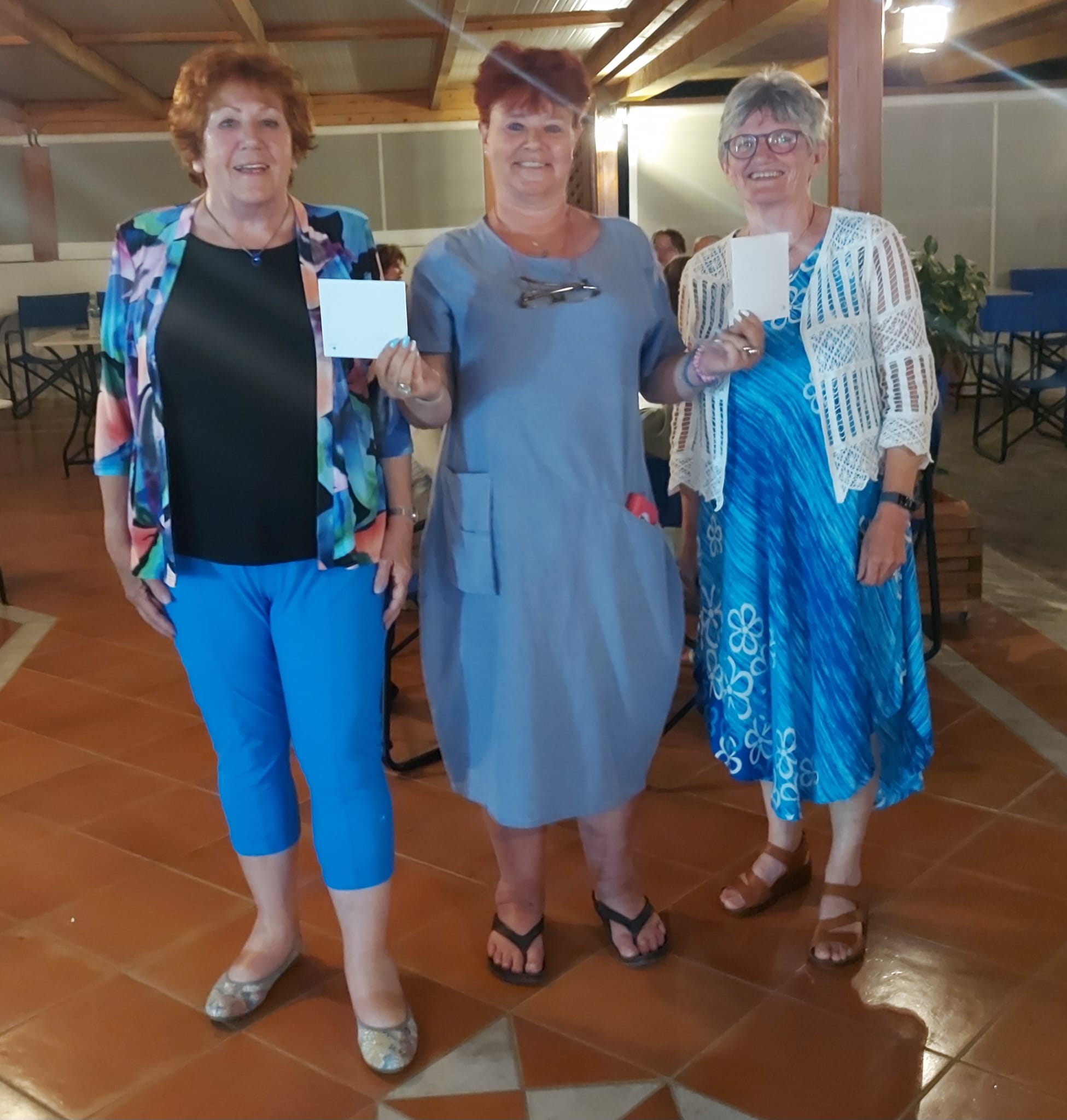 We spelen 3 ronden buiten vooraf aan het diner. Daarna 3 ronden binnen i.v.m. het licht en de koelte van de zee. We waren op tijd klaar voor een gezellige nazit. Naar de uitslag. Anja en Marion zijn eerste geworden (laatste afbeelding).
