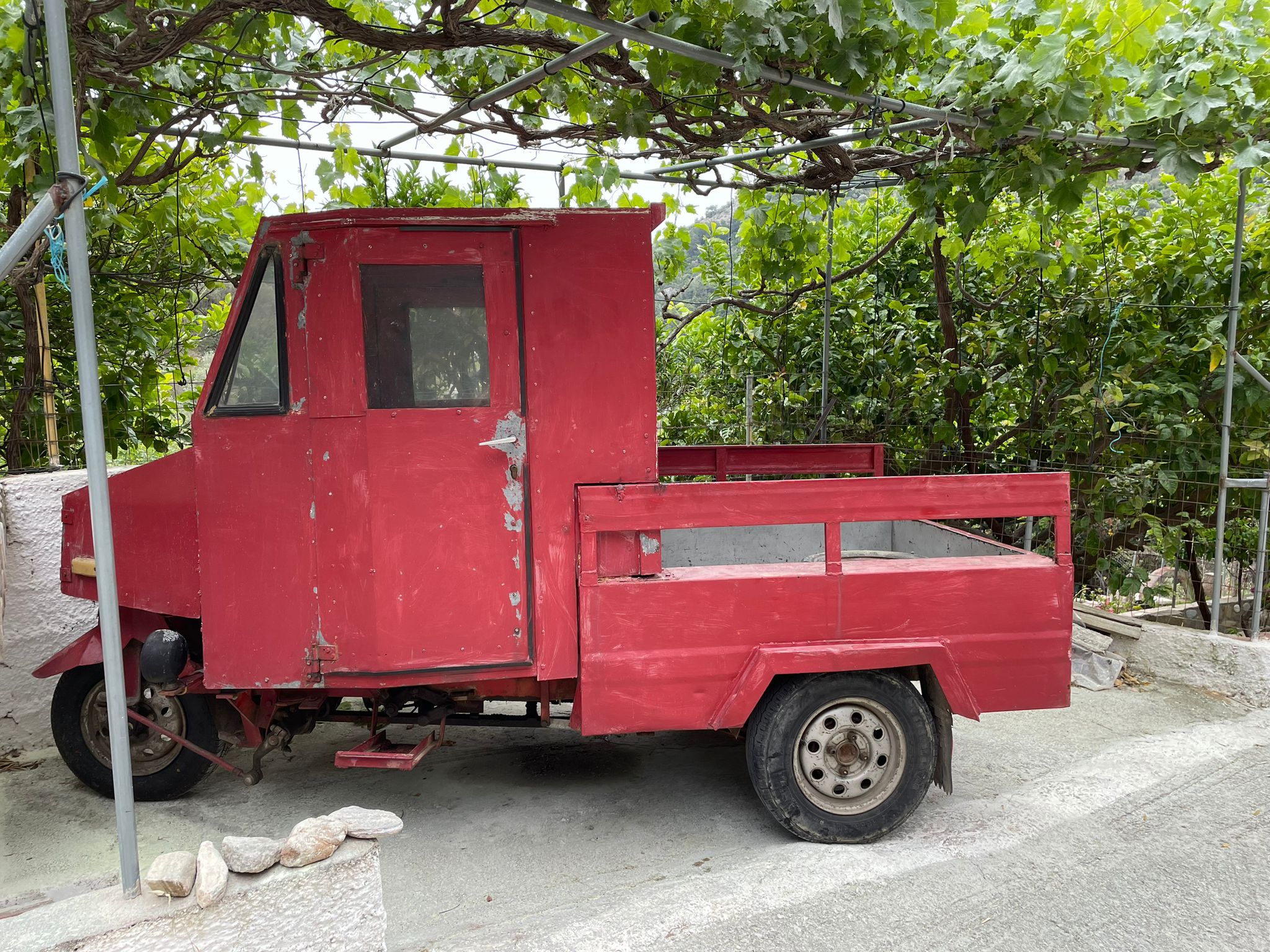 Op aanraden van Rob en Lianne zijn we op weg naar de lunch in Ormos. Twee taxi’s brengen ons in twee keer weg.