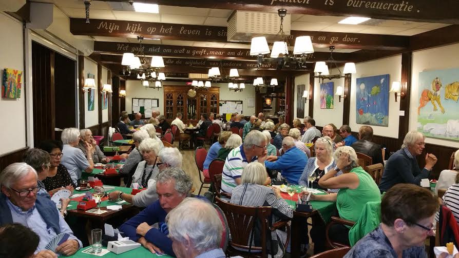 Het dinerbuffet laat ons goed smaken en de warme uitstraling van het hotel maakt het tot een zeer aangename sfeer. Om 19.30 uur trapt Marian Beemster, wedstrijdbegeleiding, af voor de eerste zitting. Deze vindt plaats tussen de lokale bridgers hetgeen de decibels doet stijgen en de concentratie bij sommige doet zakken. Morgen en zondag hebben we de zaal voor onze groep alleen (48 bridgers). Nadat de uitslag bekend is gemaakt blijft een grote groep