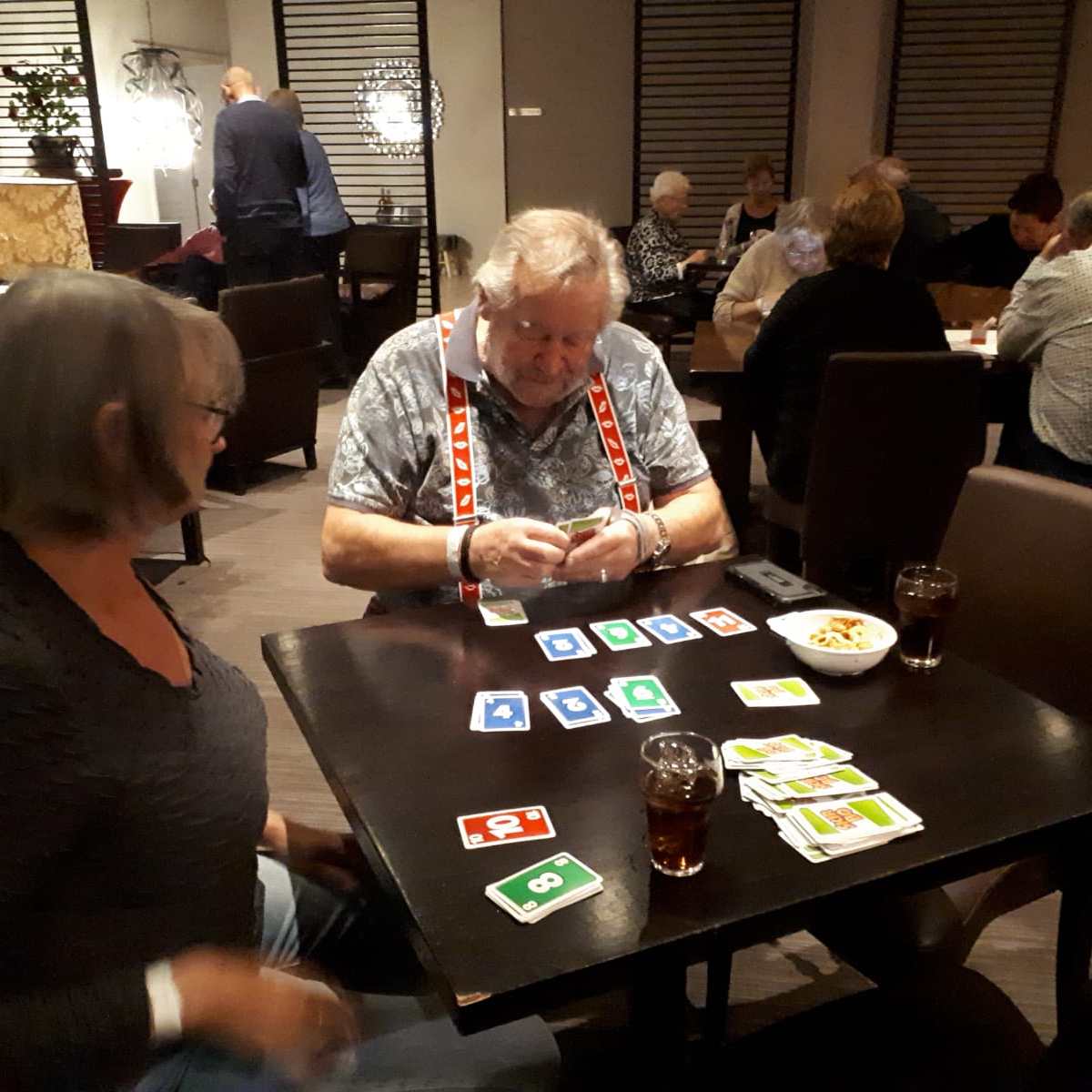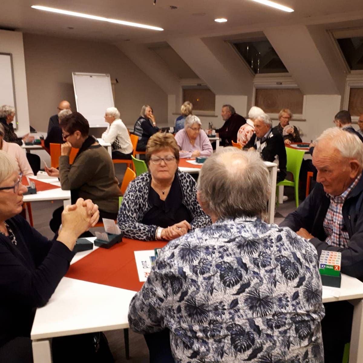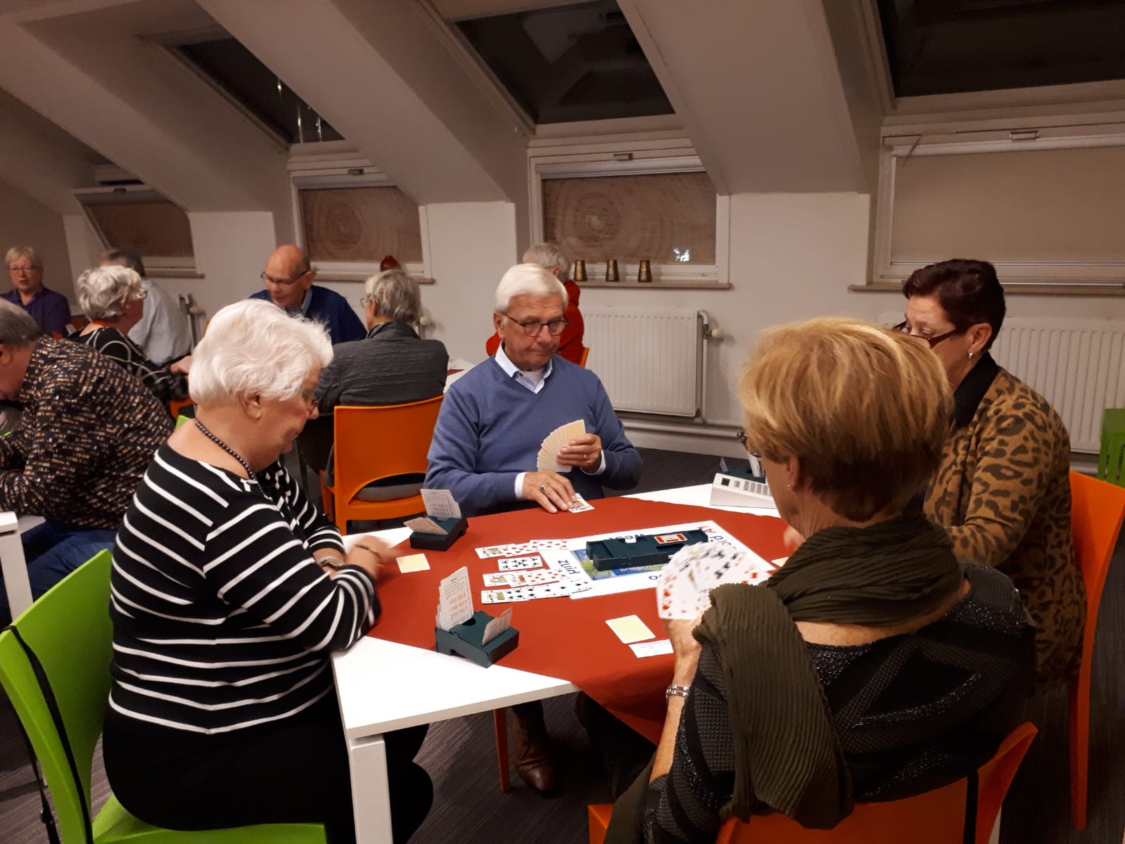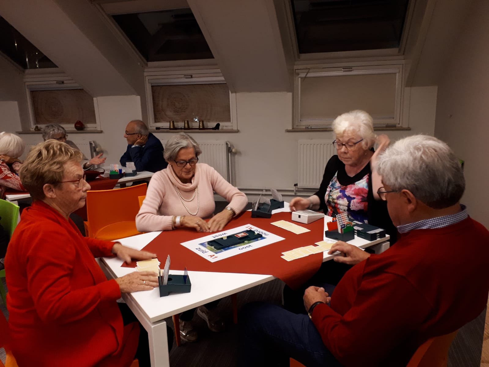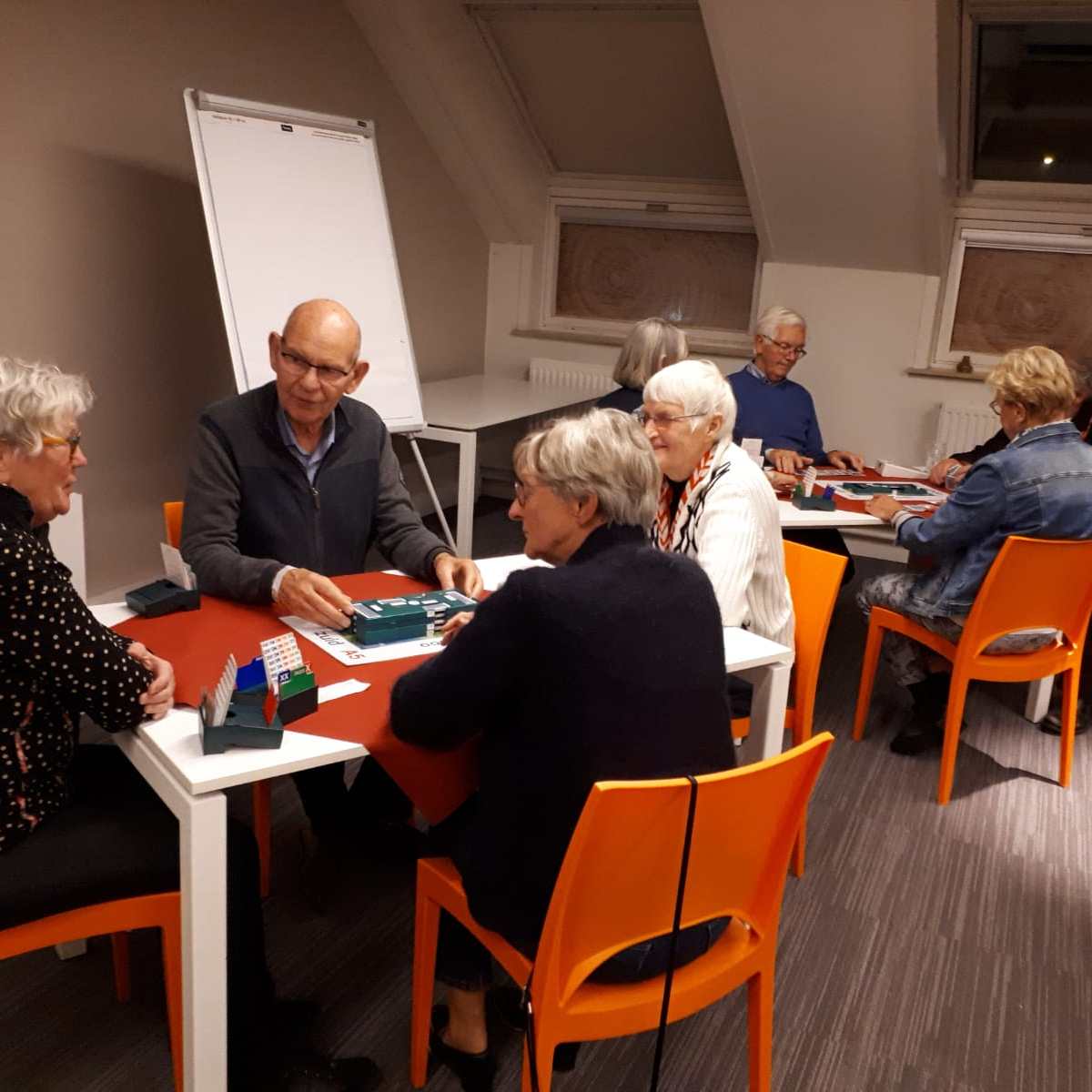Acht tafels staan keurig klaar om te beginnen aan de 1e competitieronde. Op de loopbriefjes wordt gekeken aan welke tafel als eerste het startschot is. We nemen plaats, wensen elkaar een prettige wedstrijd en beginnen aan een gezellige avond wat achteraf wordt bevestigd tijdens de nazit. Het koppel Annie en Tuus eindigt als eerste en krijgt de dagprijs uitgereikt. Van harte! Naar de uitslag.