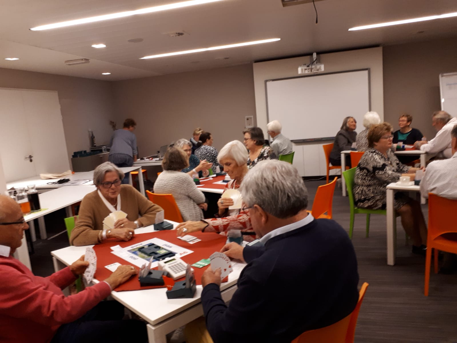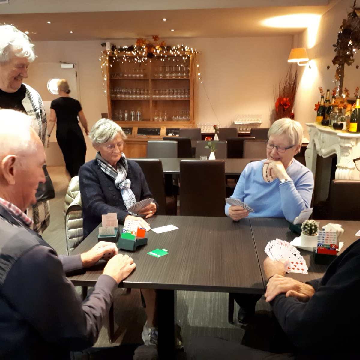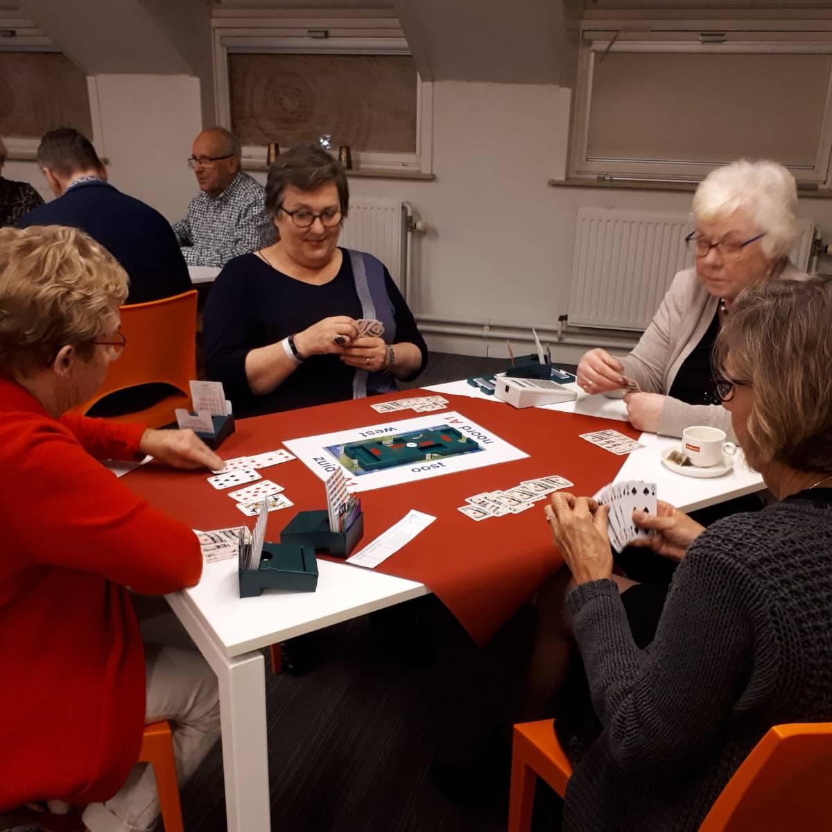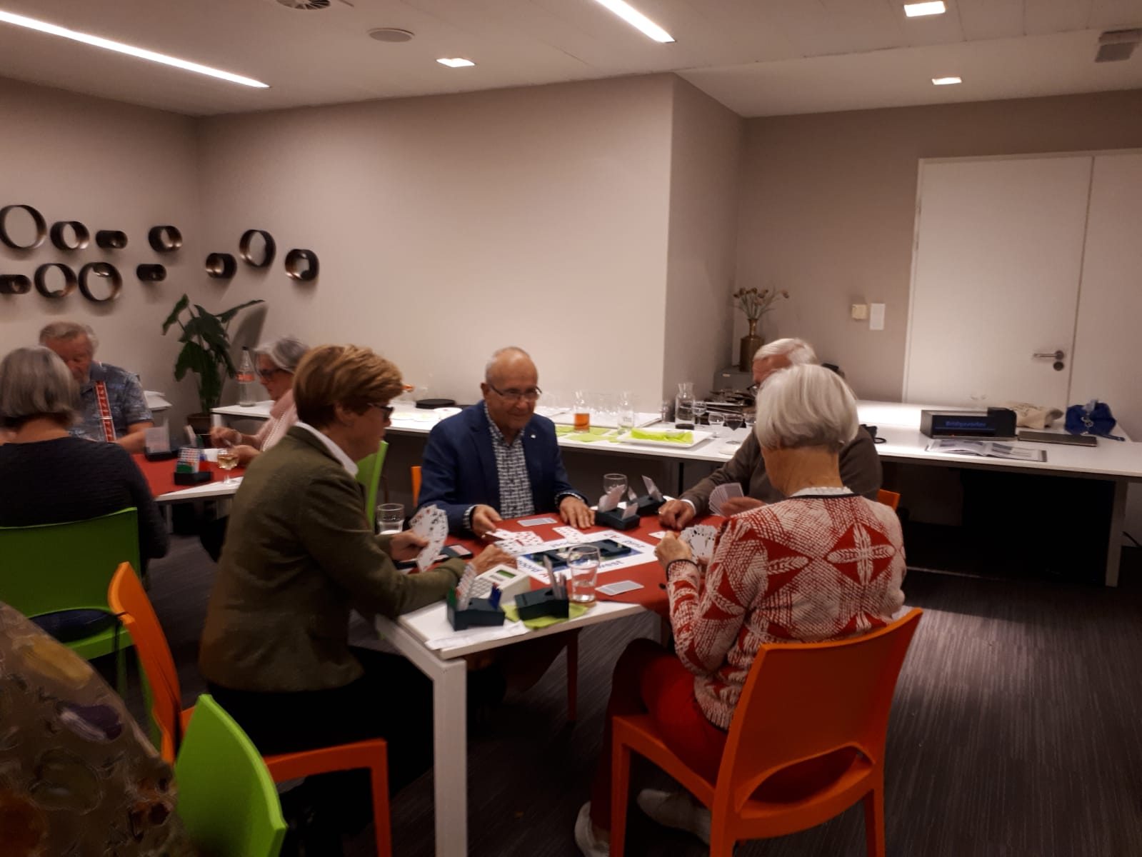 Acht tafels staan keurig klaar om te beginnen aan de 1e competitieronde. Op de loopbriefjes wordt gekeken aan welke tafel als eerste het startschot is. We nemen plaats, wensen elkaar een prettige wedstrijd en beginnen aan een gezellige avond wat achteraf wordt bevestigd tijdens de nazit. Het koppel Annie en Tuus eindigt als eerste en krijgt de dagprijs uitgereikt. Van harte! Naar de uitslag.