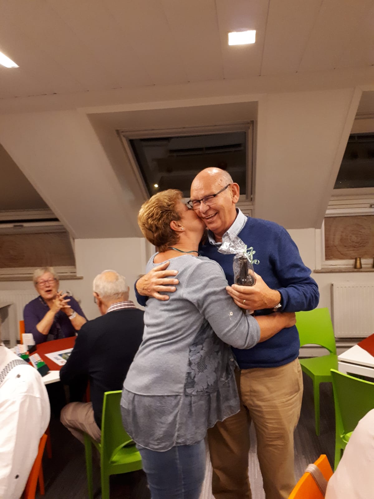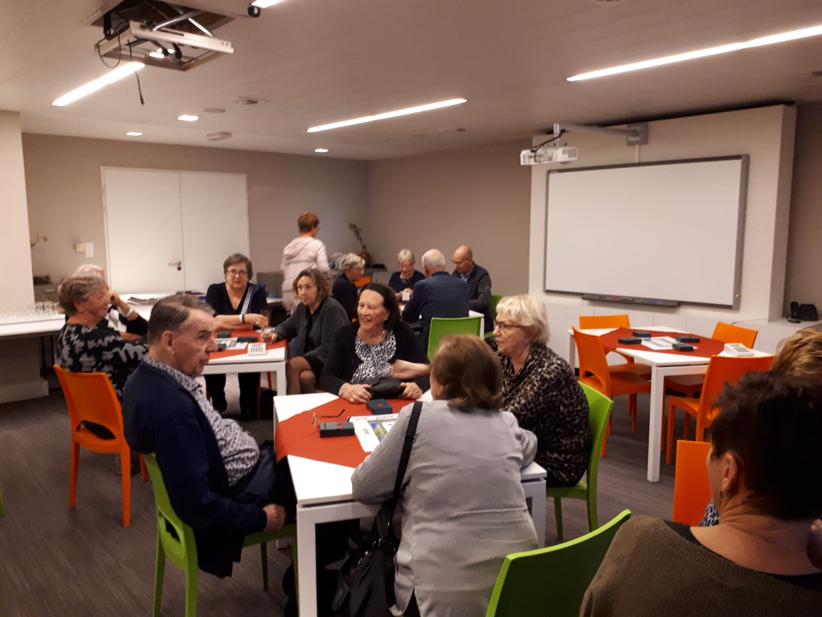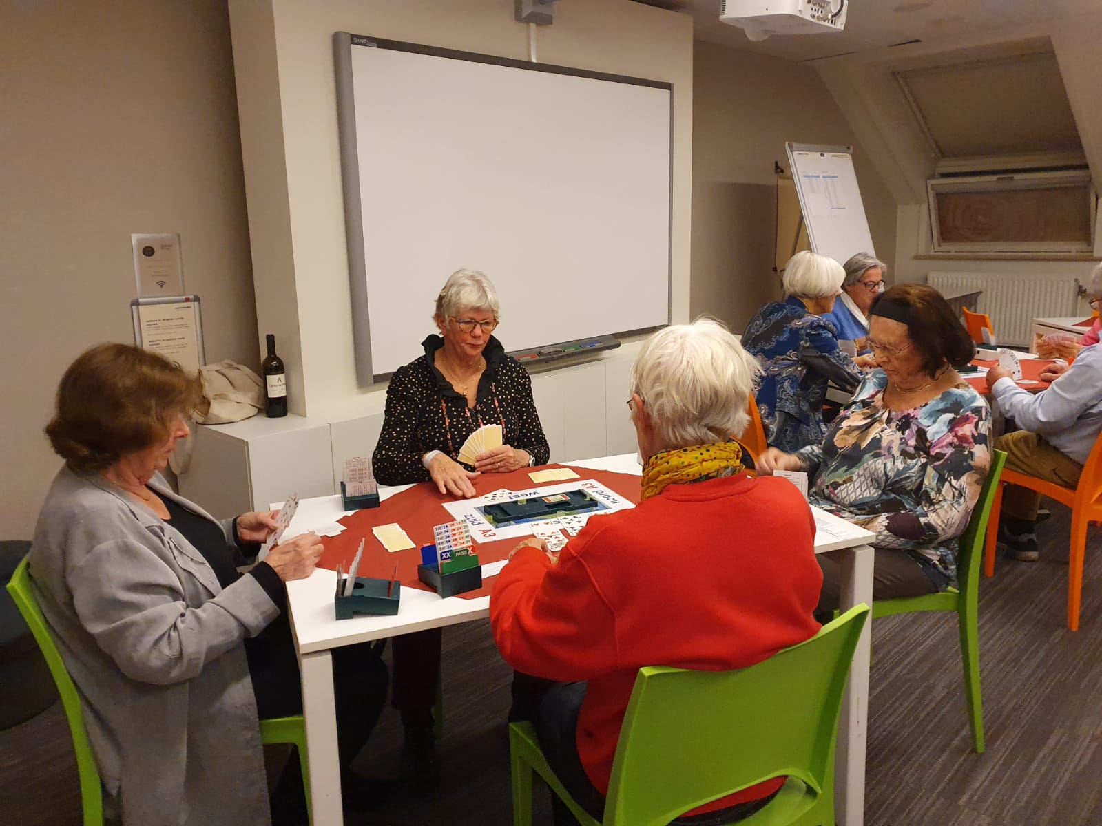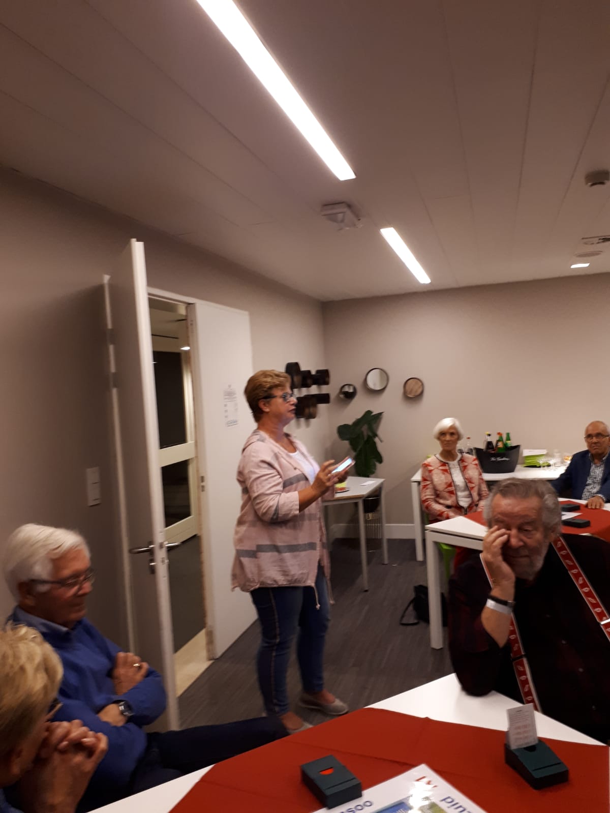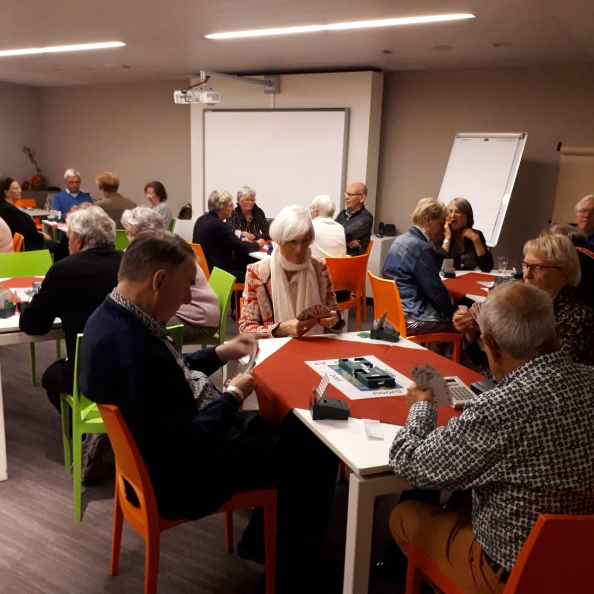 Acht tafels staan keurig klaar om te beginnen aan de 1e competitieronde. Op de loopbriefjes wordt gekeken aan welke tafel als eerste het startschot is. We nemen plaats, wensen elkaar een prettige wedstrijd en beginnen aan een gezellige avond wat achteraf wordt bevestigd tijdens de nazit. Het koppel Annie en Tuus eindigt als eerste en krijgt de dagprijs uitgereikt. Van harte! Naar de uitslag.