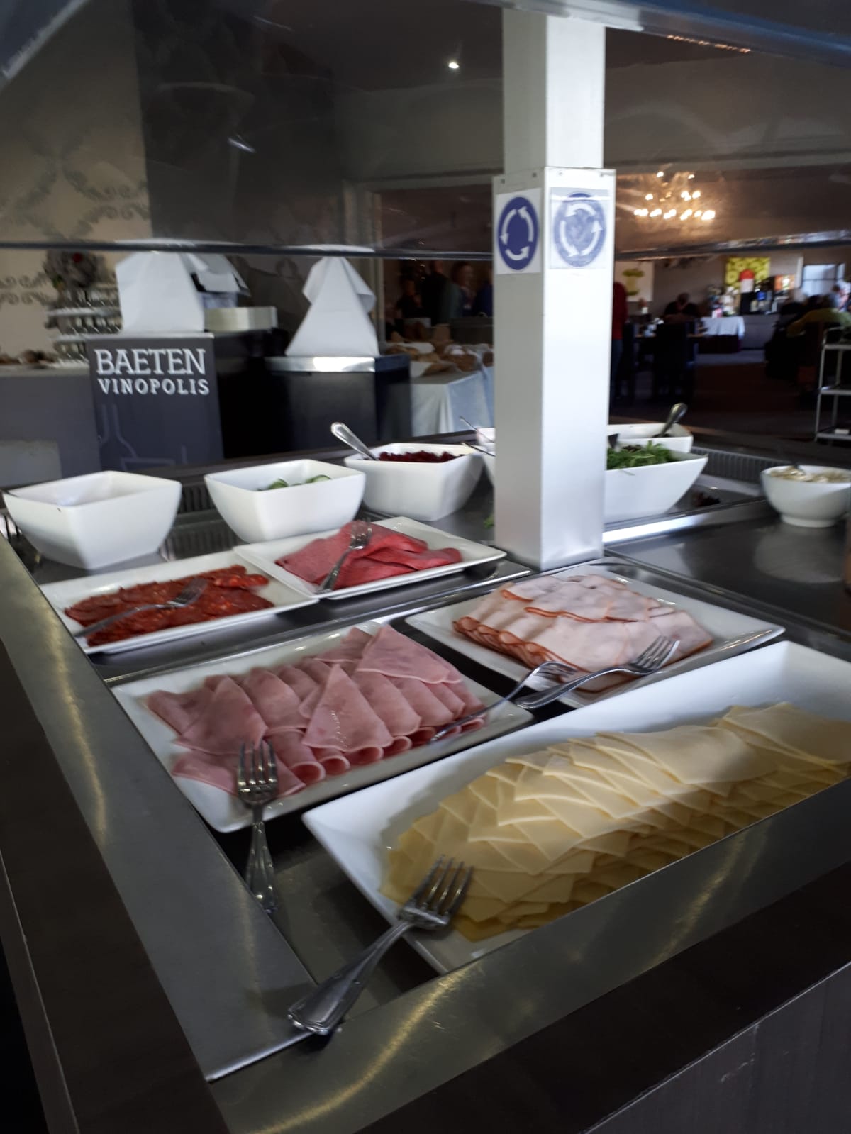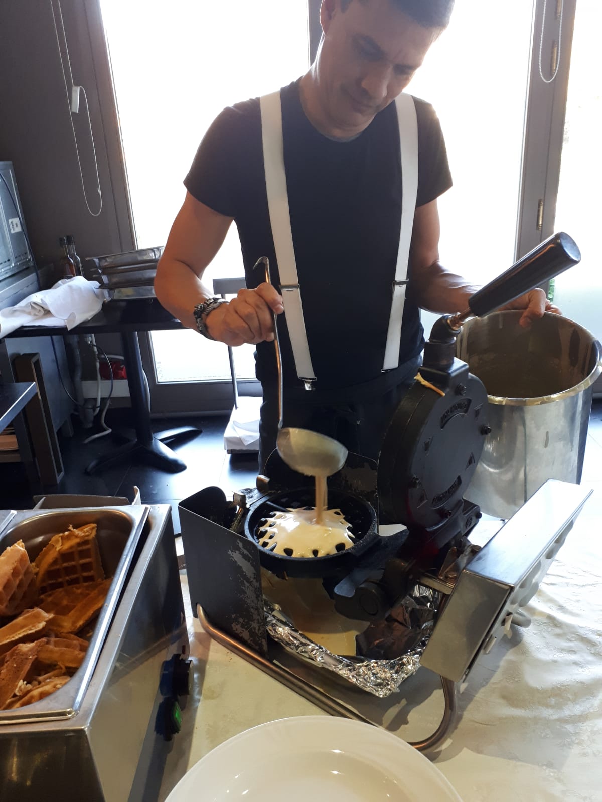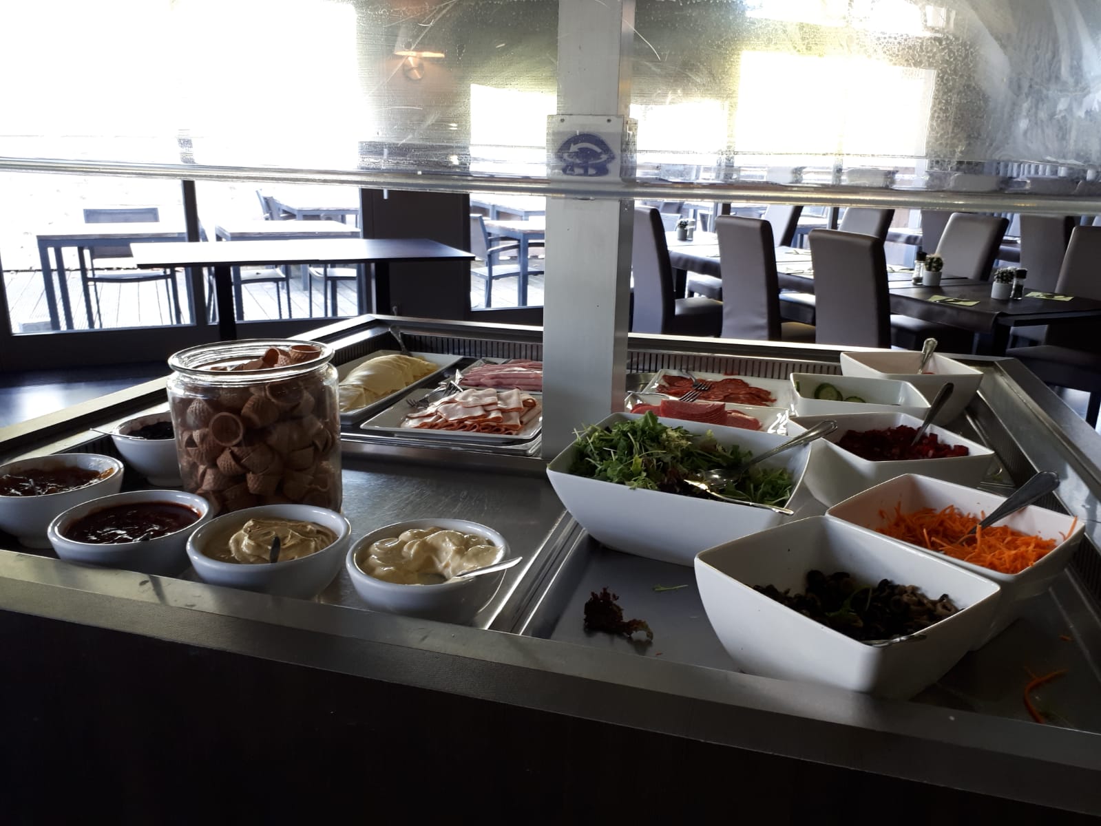 Het ontbijt bestaat uit vers gebakken wafels, flensjes, 3 soorten eieren, brie, tonijn, krabsalade en veel meer. Wat een heerlijkheden staan er klaar, na een nacht met temperaturen beneden nul.