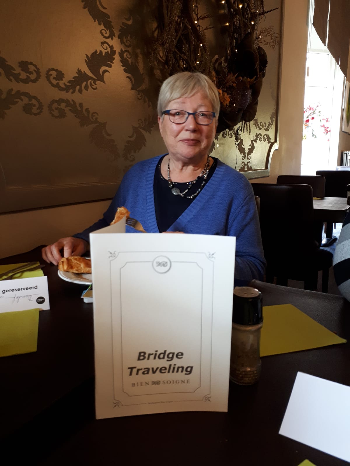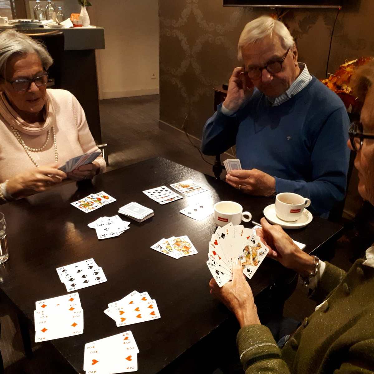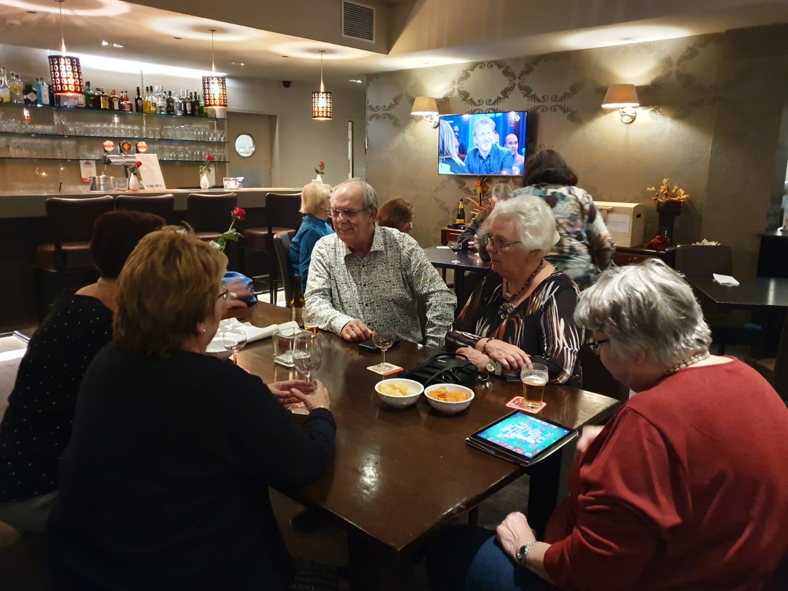 De winnaars van gisteren oefenen alvast voor vanavond, met toeschouwers natuurlijk. Ze zijn naar de Outlet in Maasmechelen geweest en hebben het kasteel Pietersheim bezocht. Het is gezellig in de lounge. Naast het bridgen worden ook andere spelletjes gespeeld en een breiwerkje afgemaakt. Het tasje van Kipling nodigt uit te kijken wat voor leuks er in zit.