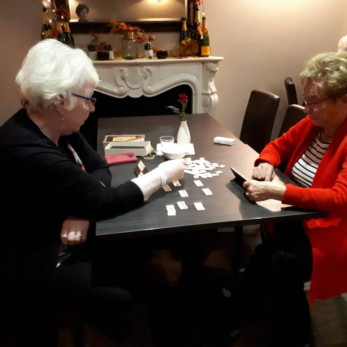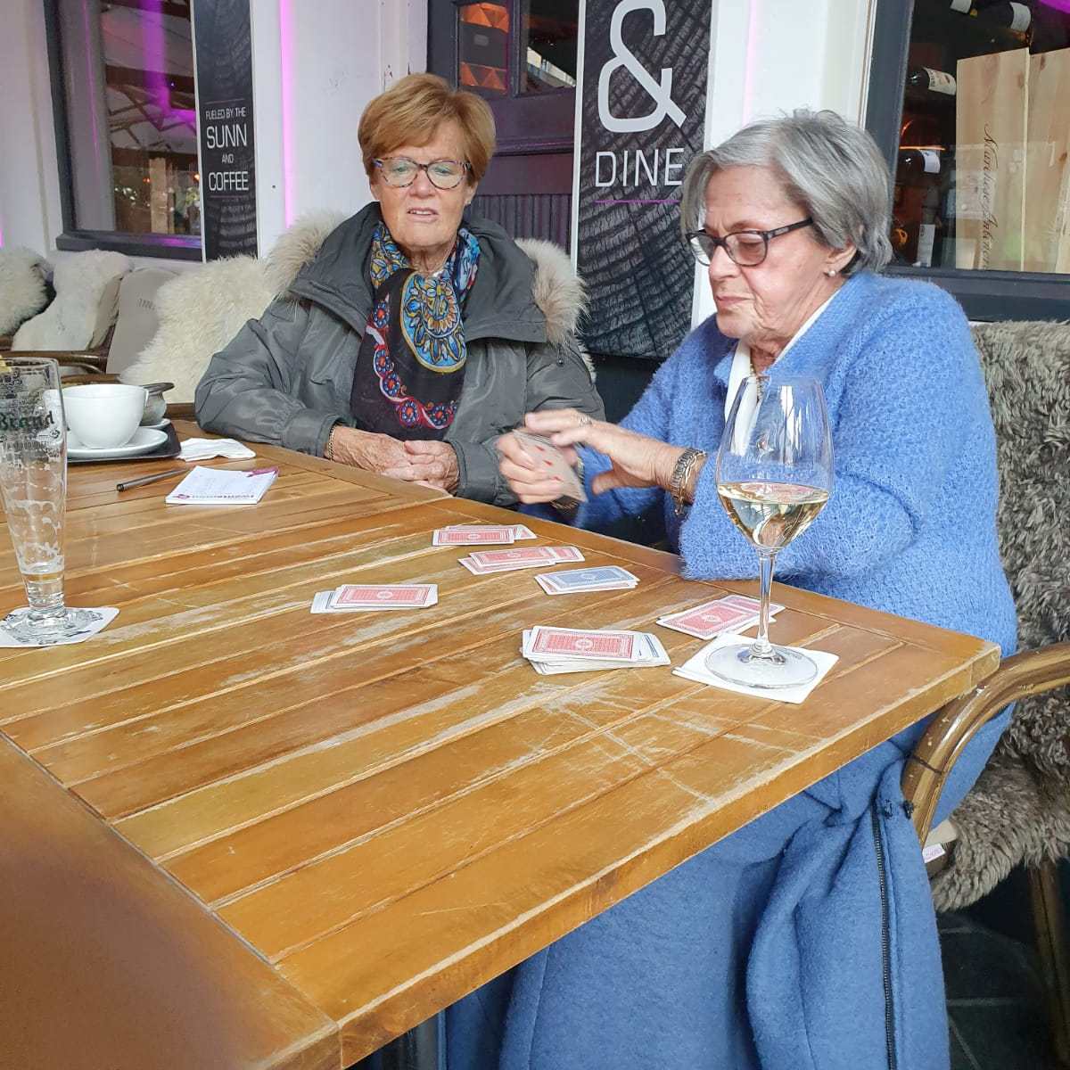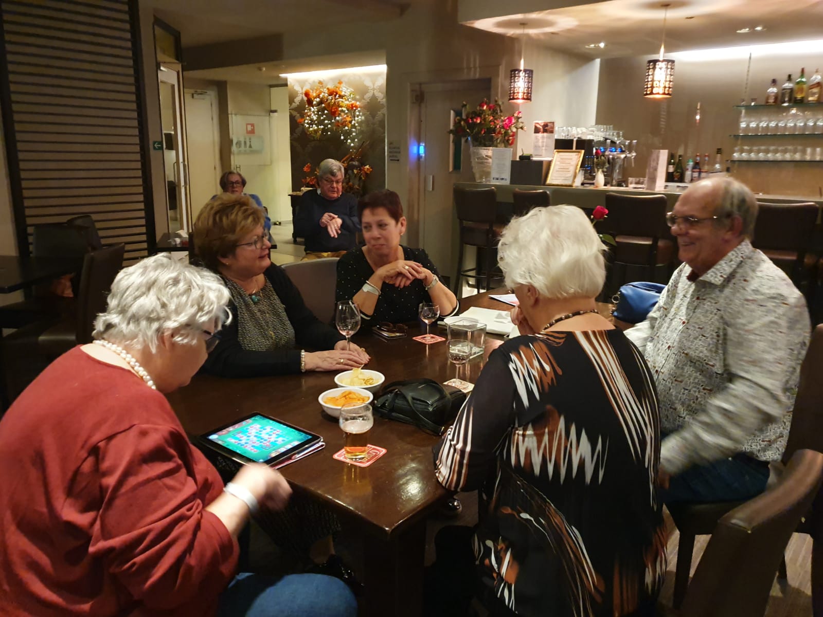De winnaars van gisteren oefenen alvast voor vanavond, met toeschouwers natuurlijk. Ze zijn naar de Outlet in Maasmechelen geweest en hebben het kasteel Pietersheim bezocht. Het is gezellig in de lounge. Naast het bridgen worden ook andere spelletjes gespeeld en een breiwerkje afgemaakt. Het tasje van Kipling nodigt uit te kijken wat voor leuks er in zit.