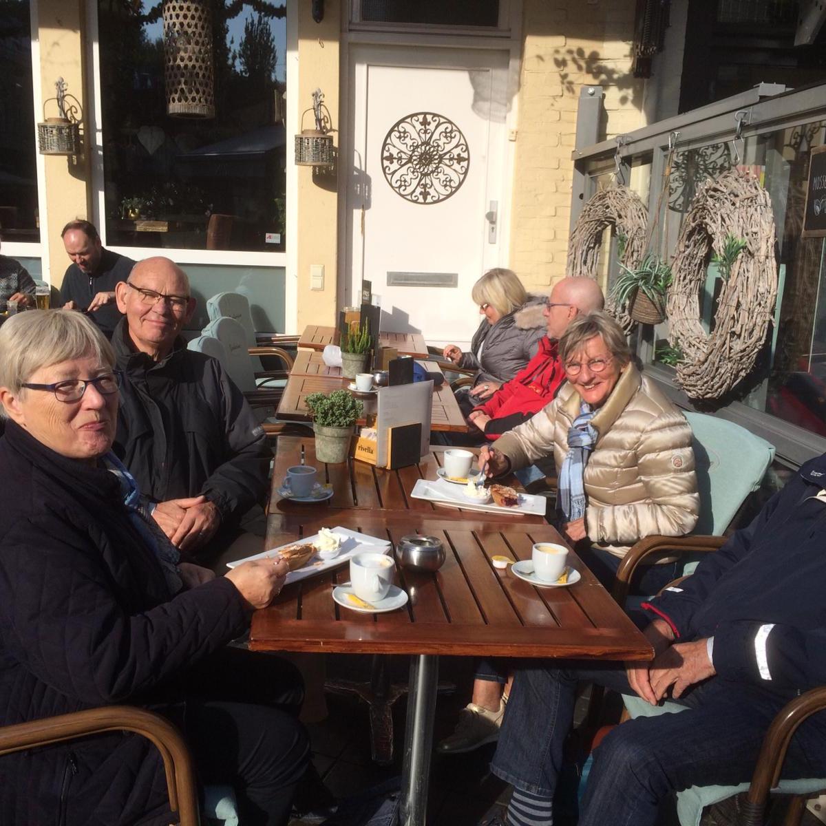 We gaan verder door het prachtige landschap naar Valkenburg via Gulpen-Wittem, bekend van de bierbrouwerij, de mosterd en het klooster. Valkenburg is bekend om de mergelgrotten, de vele huisjes die van mergelsteen zijn gemaakt maar ook van de kerstsfeer, het bier en de leuke winkelstraatjes. Wij struinen door Valkenburg, drinken koffie met gebak en tussendoor legt een aantal nog even een kaartje.
