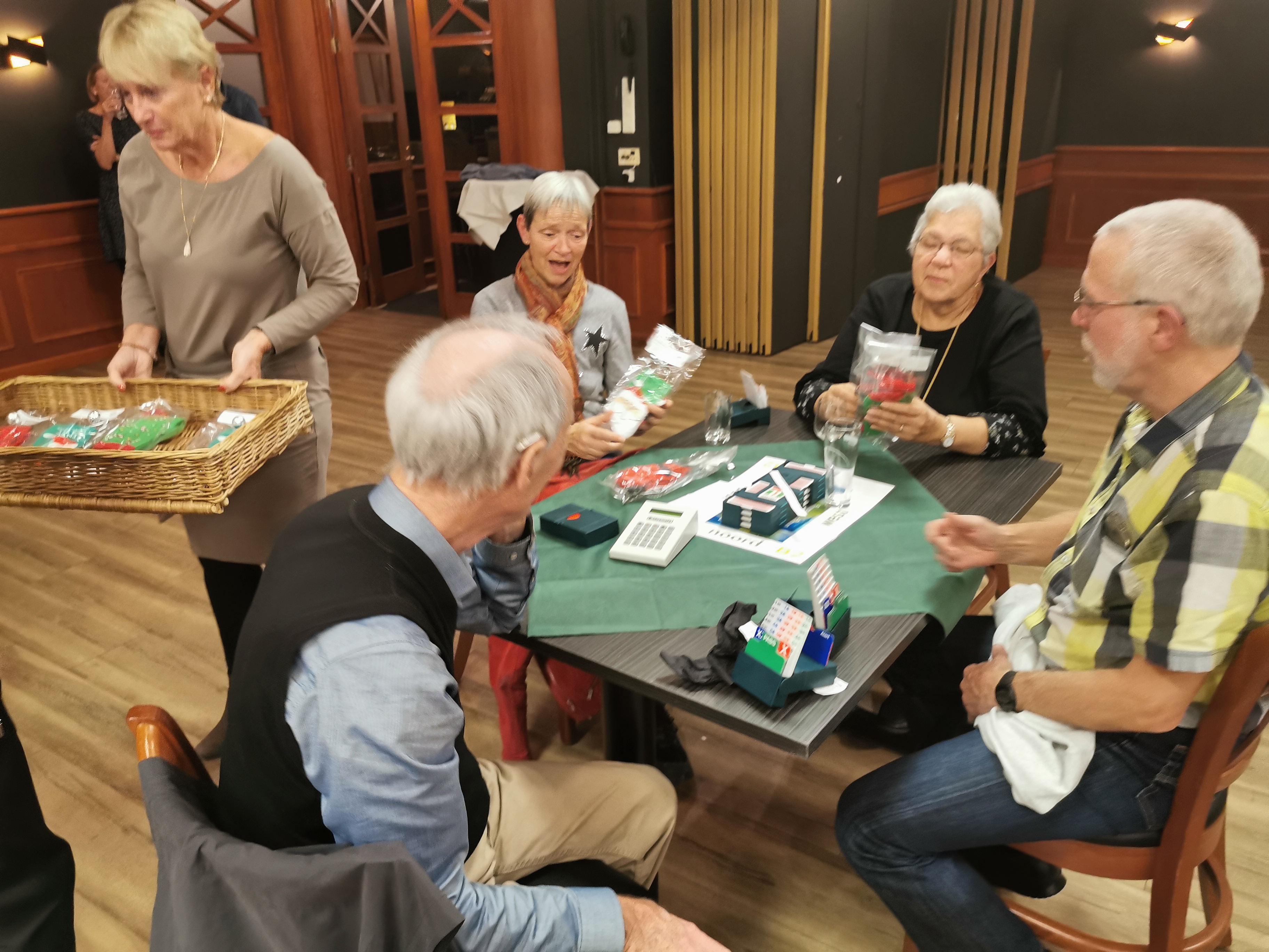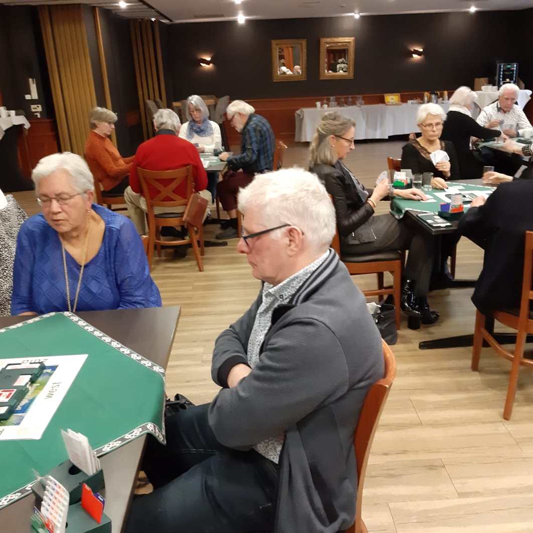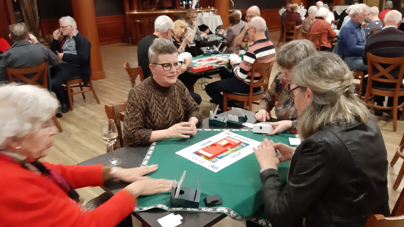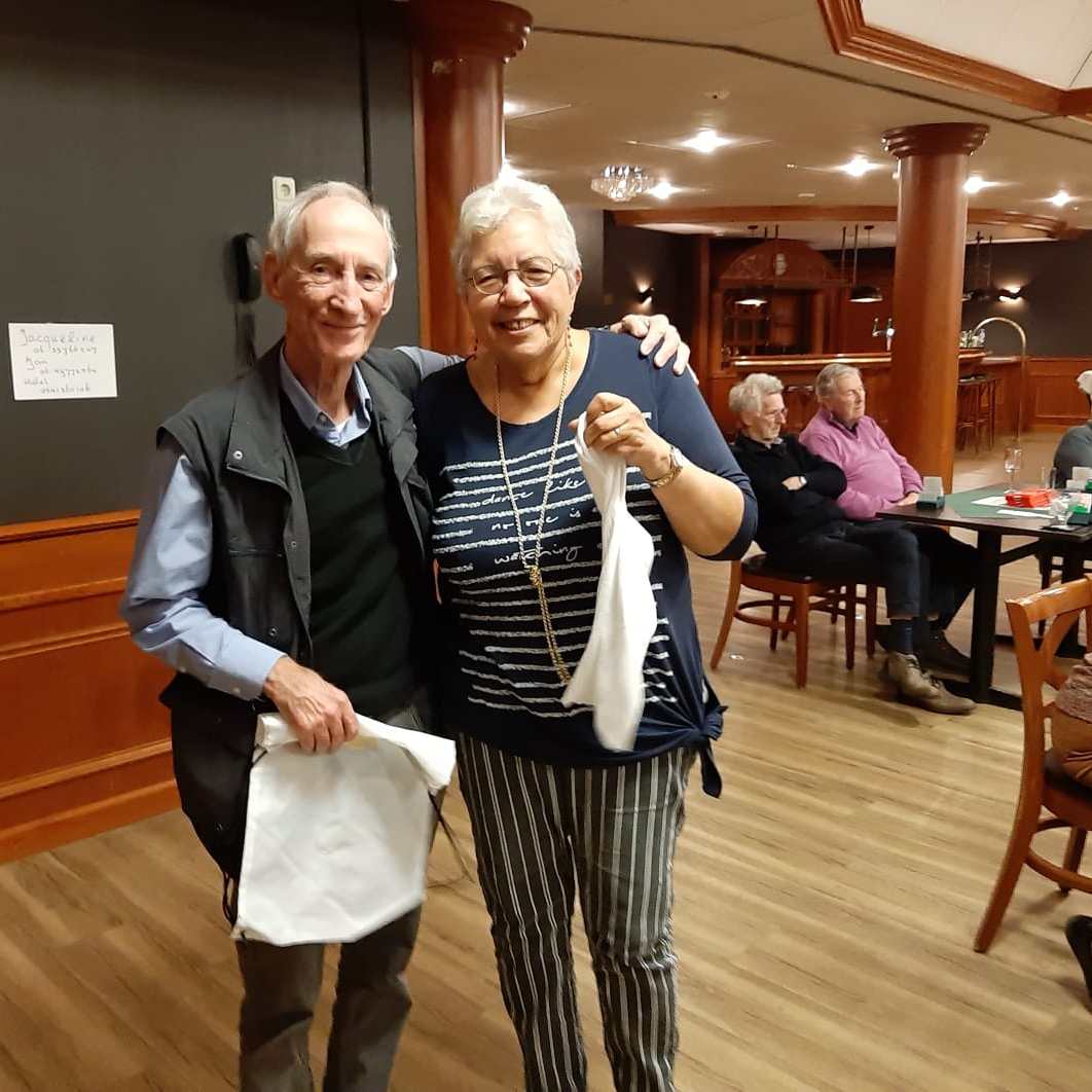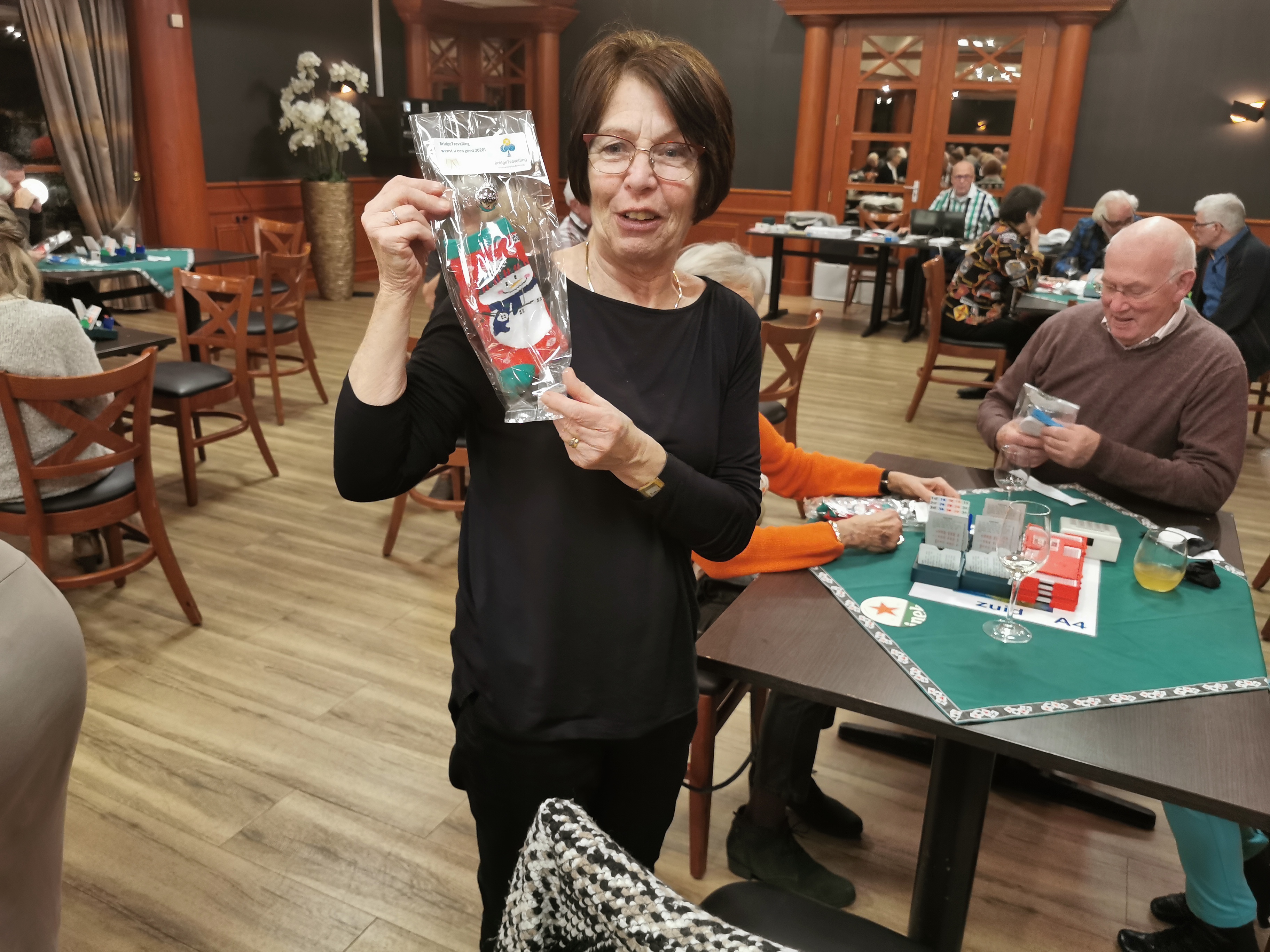 Van het restaurant schuiven we gezellig door naar de bridgezaal die overigens heel ruim, geruisarm en goed verlicht is. Na eerst koffie/thee en het loopbriefje te hebben gepakt starten we met de tweede ronde. De avond verloopt soepel maar bovenal gezellig. Tegen het einde krijgt iedereen een presentje uitgereikt; een paar heerlijke wintersokken.