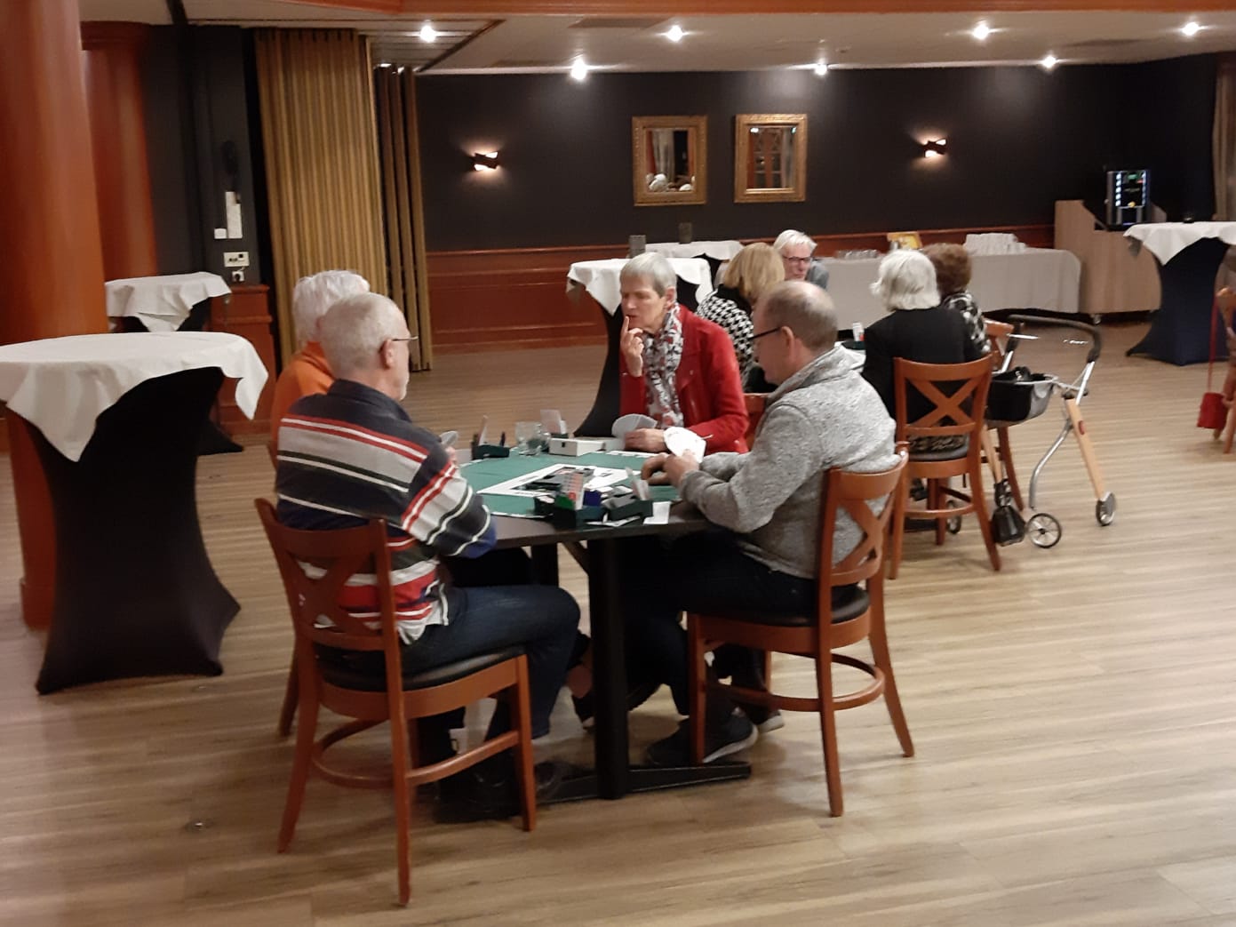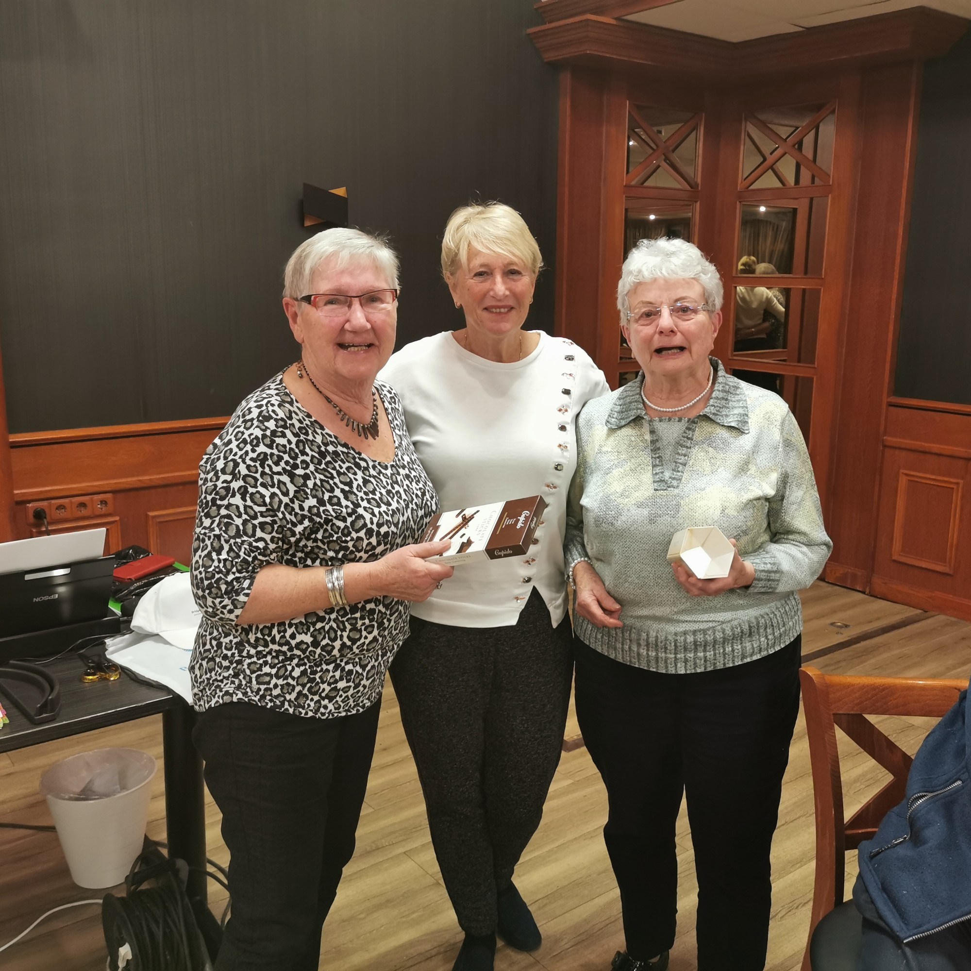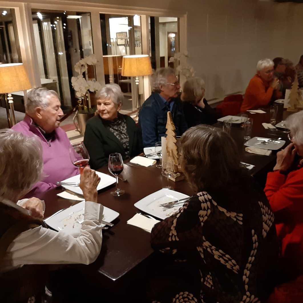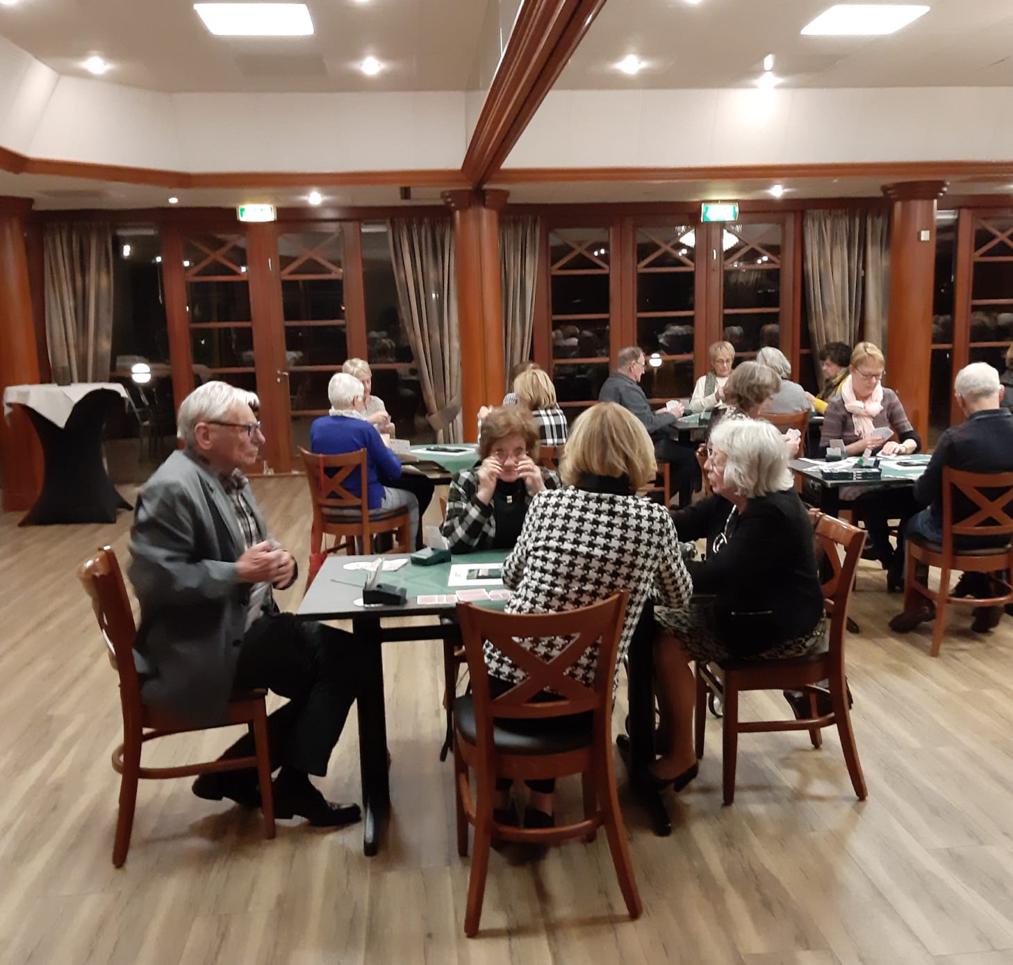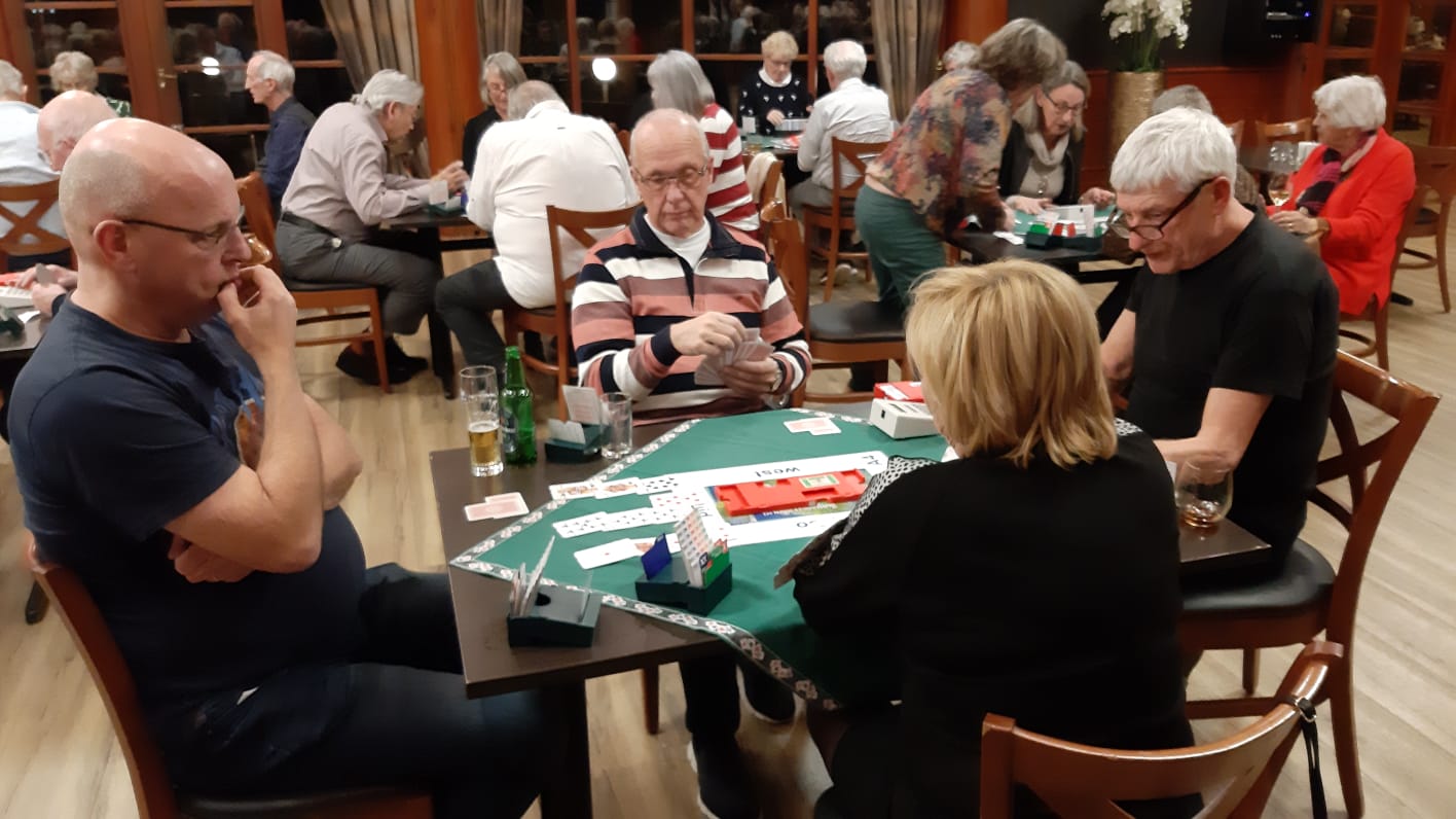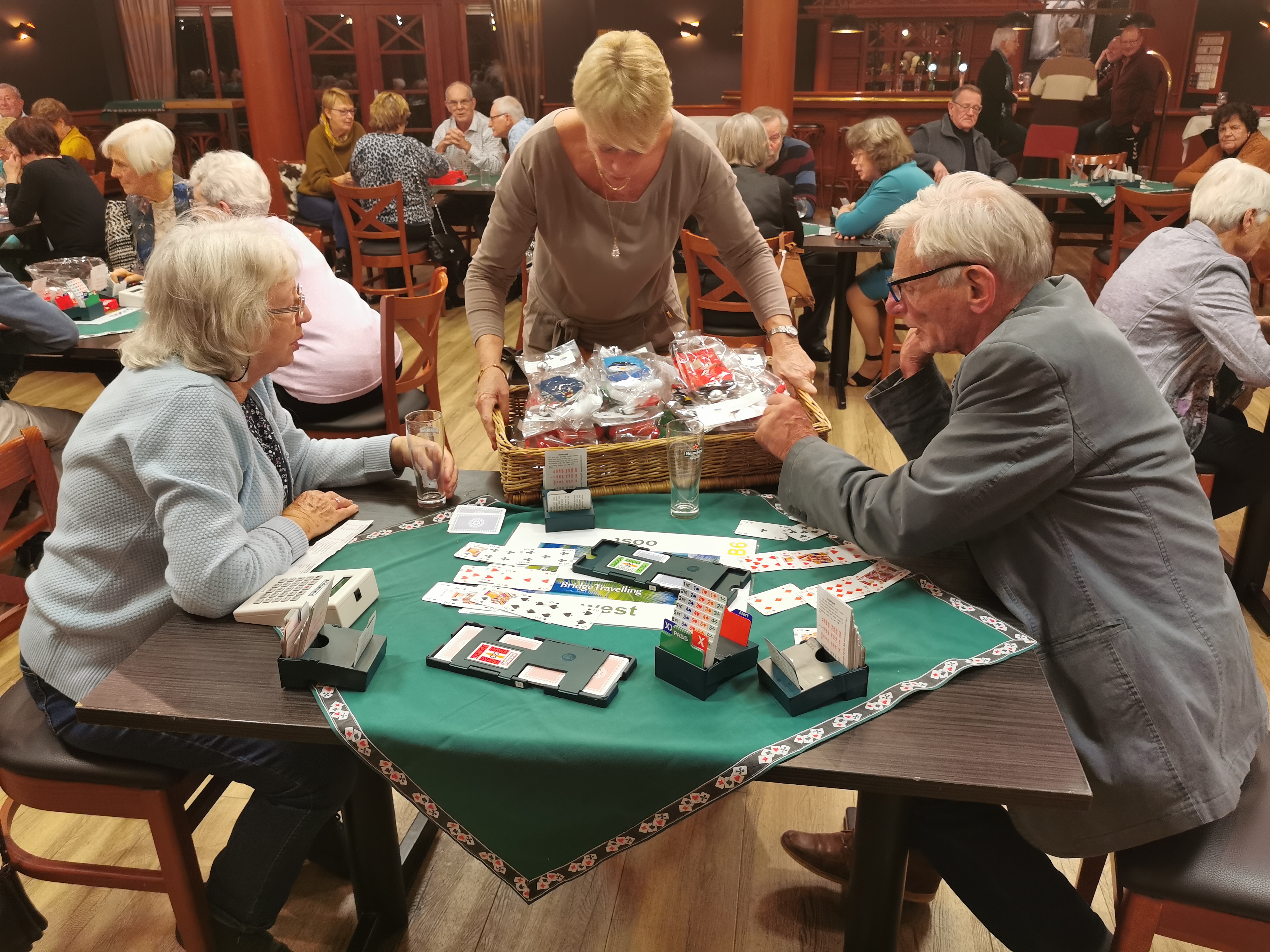 Van het restaurant schuiven we gezellig door naar de bridgezaal die overigens heel ruim, geruisarm en goed verlicht is. Na eerst koffie/thee en het loopbriefje te hebben gepakt starten we met de tweede ronde. De avond verloopt soepel maar bovenal gezellig. Tegen het einde krijgt iedereen een presentje uitgereikt; een paar heerlijke wintersokken.