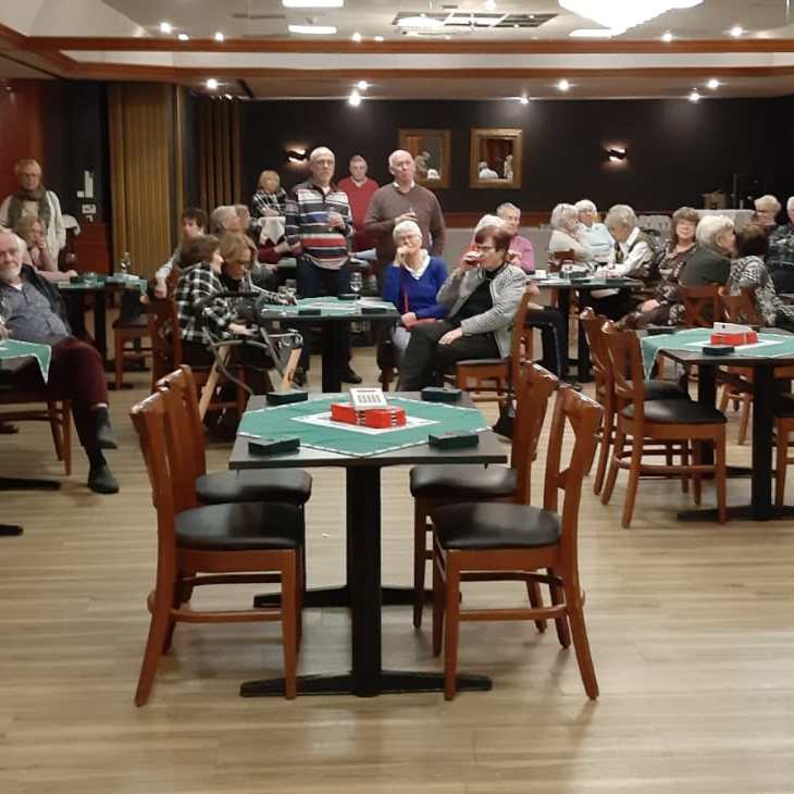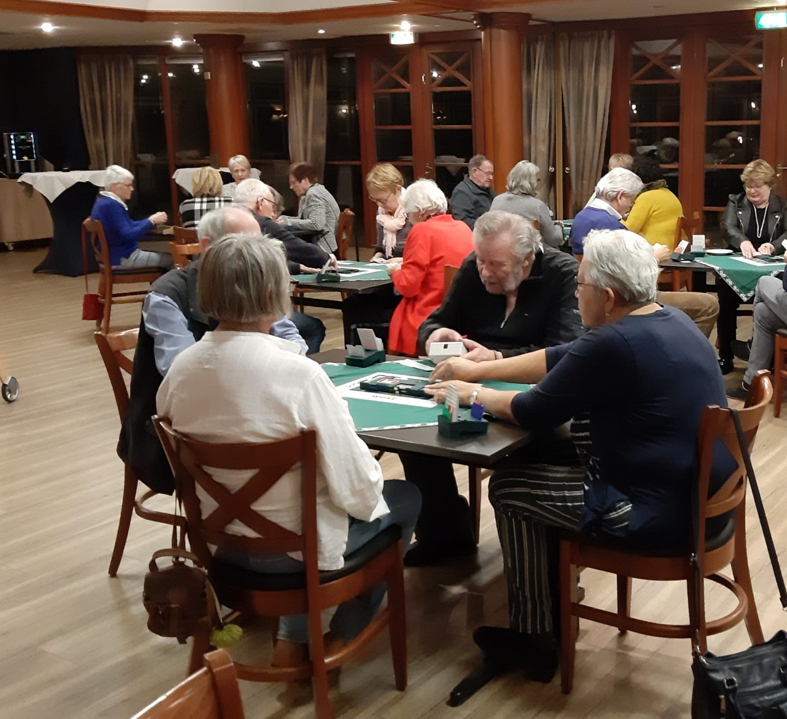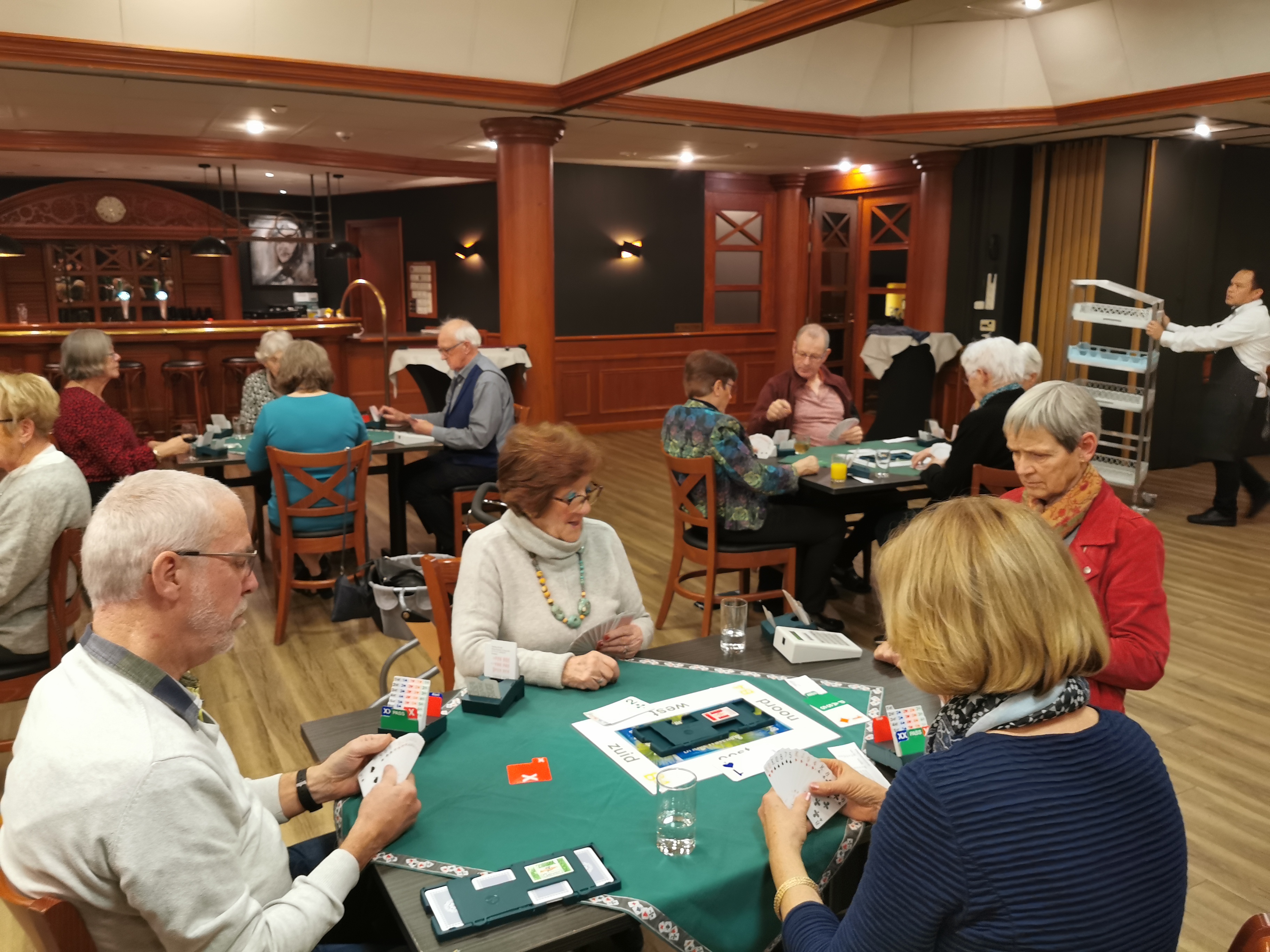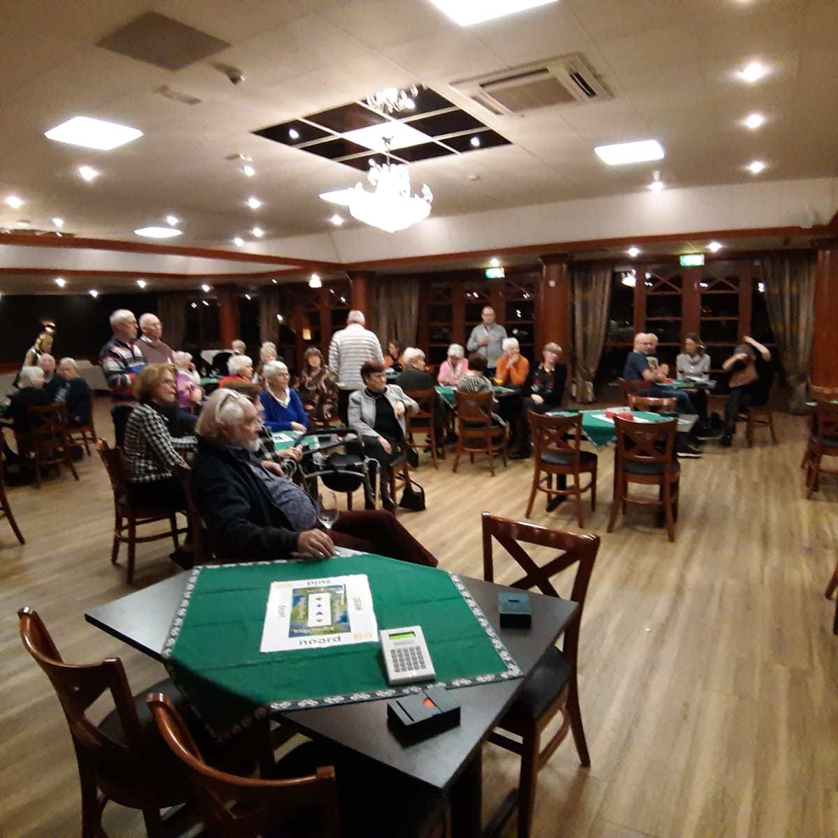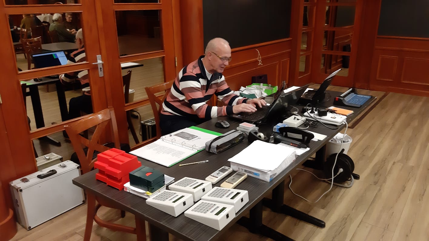 Rond 19.45 uur is iedereen in de bridgezaal aanwezig. Het is een grote groep met ruim 60 gasten, dus mijn stembanden moeten erg hun best doen om alles voor iedereen verstaanbaar te maken. De kleine problemen met de koffiemachine worden opgelost en rond 20.00 uur beginnen we met de eerste 24 spelletjes bridge. Hapjes worden rondgedeeld en de bar in de zaal blijft geopend. Rond 23.30 uur kunnen we de eindstand van de eerste avond bekendmaken.