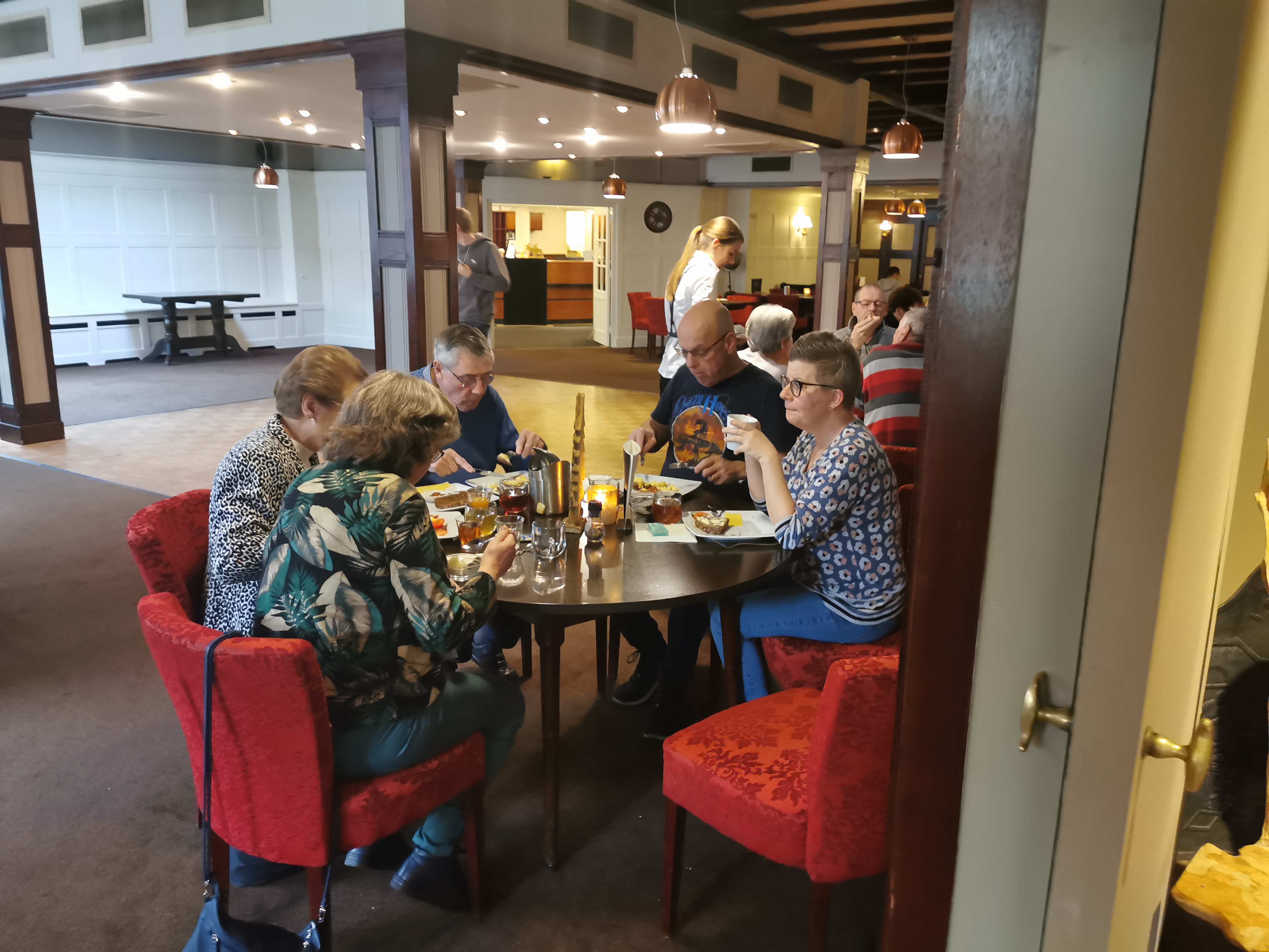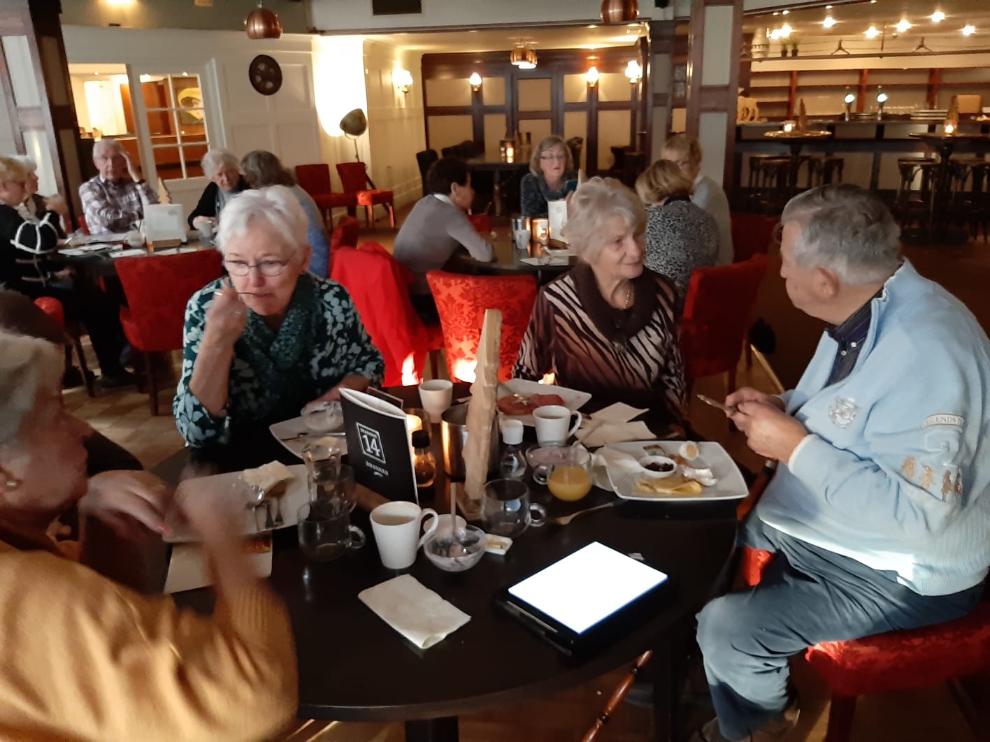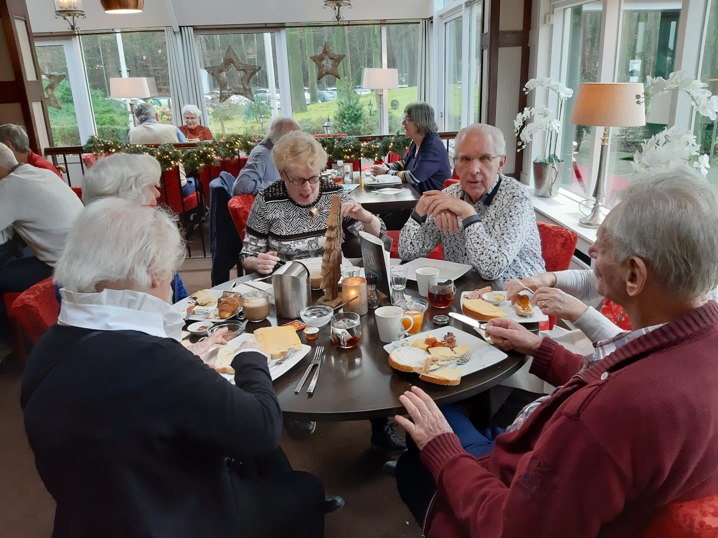We zien gasten vertrekken met de fiets en met de benenwagen. Het is koud maar gelukkig schijnt de zon volop, dat maakt weer veel goed. Enkelen gaan naar Zwolle voor een bezoek aan het museum en we zien veel gasten die binnen blijven, de lunch gebruiken in het hotel om vervolgens om 14.00 uur naar de bridgezaal te gaan voor de derde ronde.