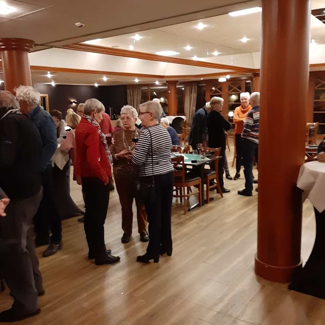 Om 17.30 uur zijn alle gasten in de bridgeruimte om te proosten op een heerlijke vakantie. De glazen zijn gevuld en bekenden groeten elkaar uitbundig. Ook de nieuwe gasten worden hartelijk ontvangen en na de huishoudelijke mededelingen en een extra glaasje gaan we naar het diner. Prachtige ronde tafels zijn gedekt en het eten smaakt verrukkelijk.