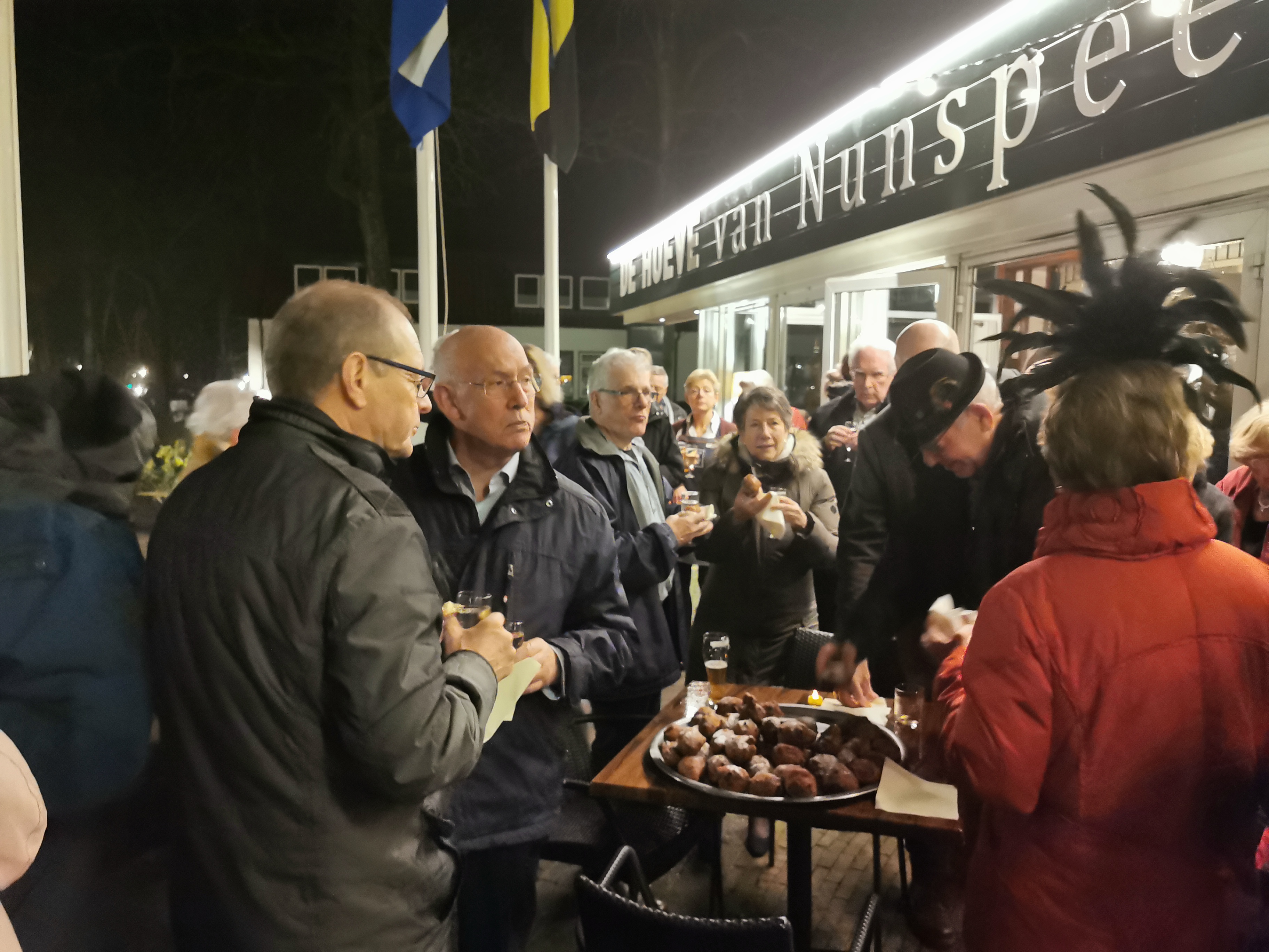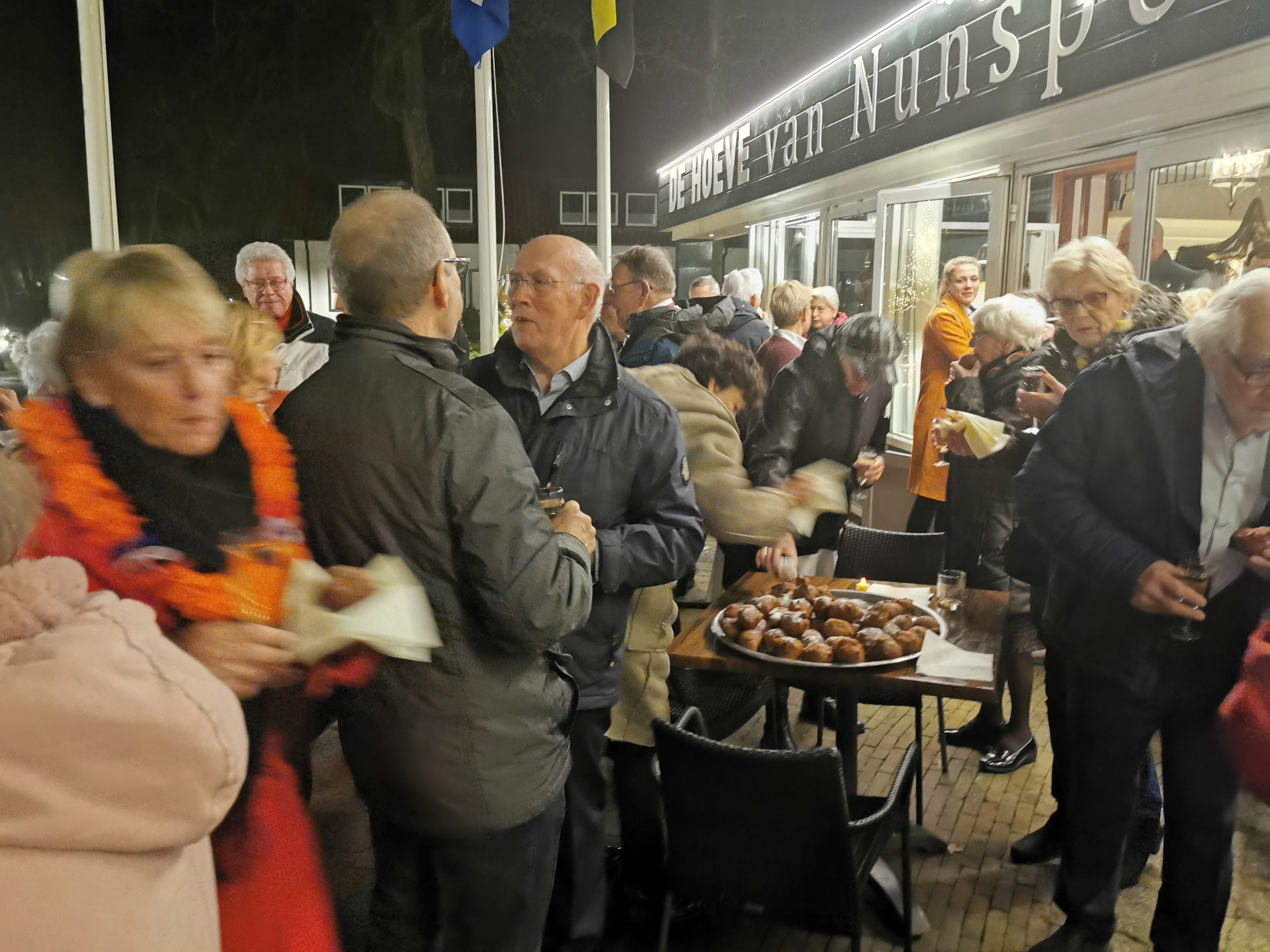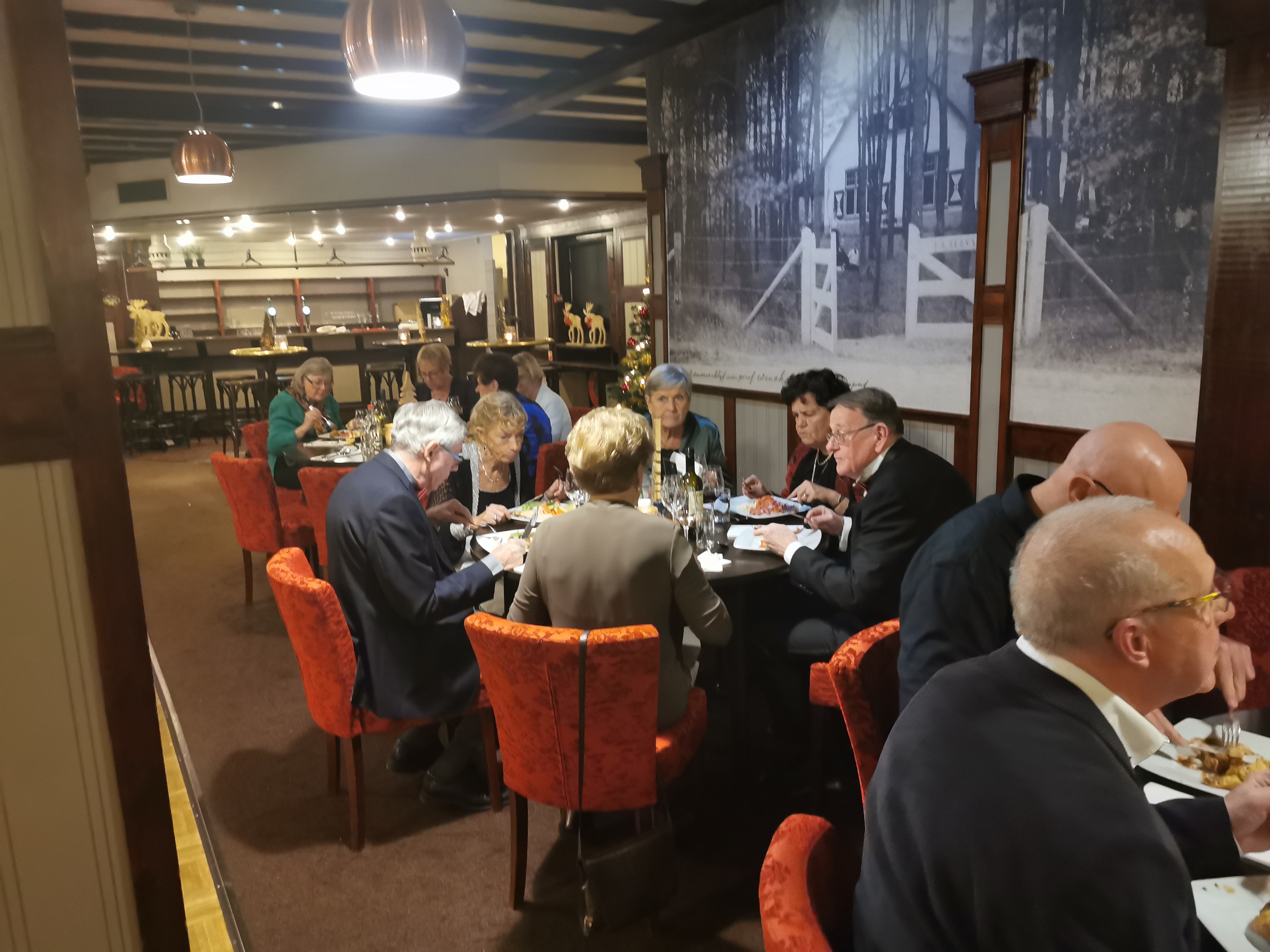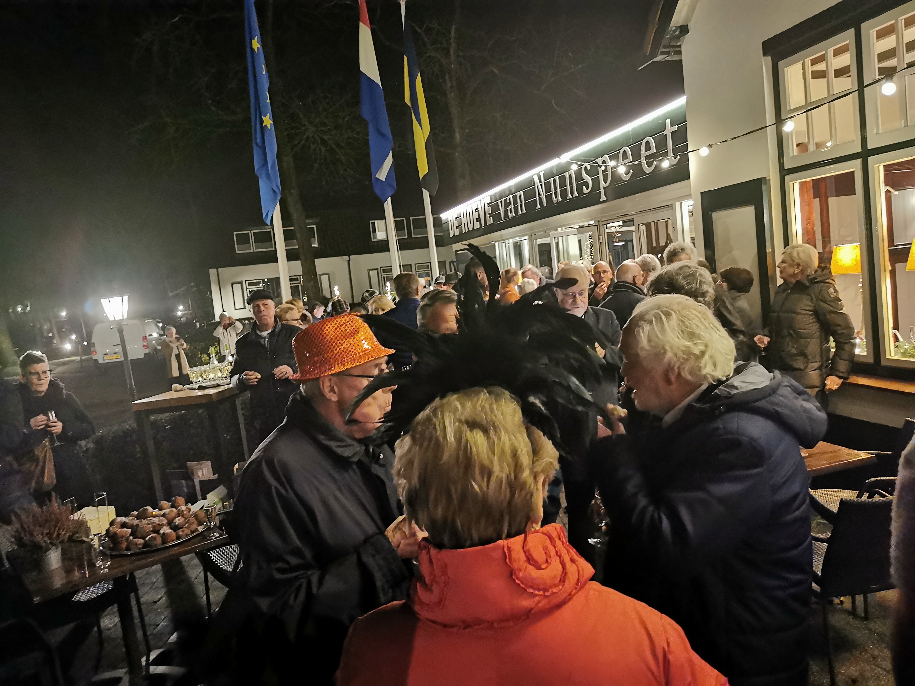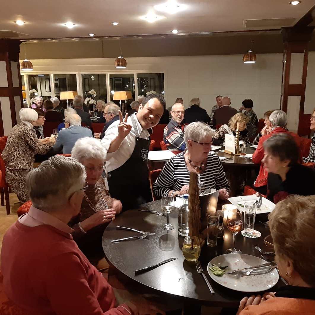 Om 19.00 uur zit iedereen met feestelijke kleding aan tafel en kan het feest beginnen. Het voorgerecht van ossenstaartbouillon met brood wordt aan tafel geserveerd, waarna iedereen tafel voor tafel gebruik kan maken van het uitgebreide buffet. Ab, onze muziekman voor vanavond, heeft al zijn spullen al klaargezet en eet gezellig met ons een hapje mee. Daarna start de muziek en na het dessert komen de eerste gasten al op de dansvloer.