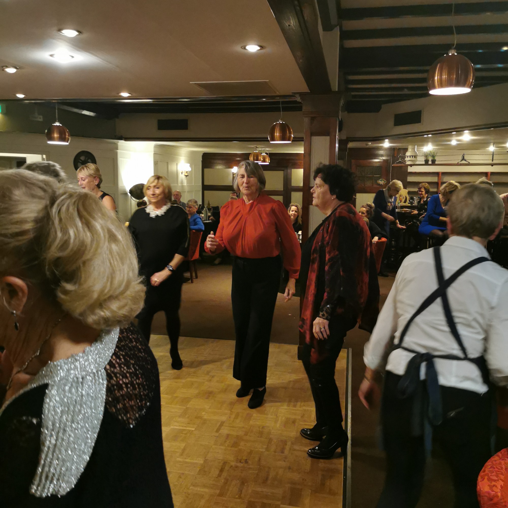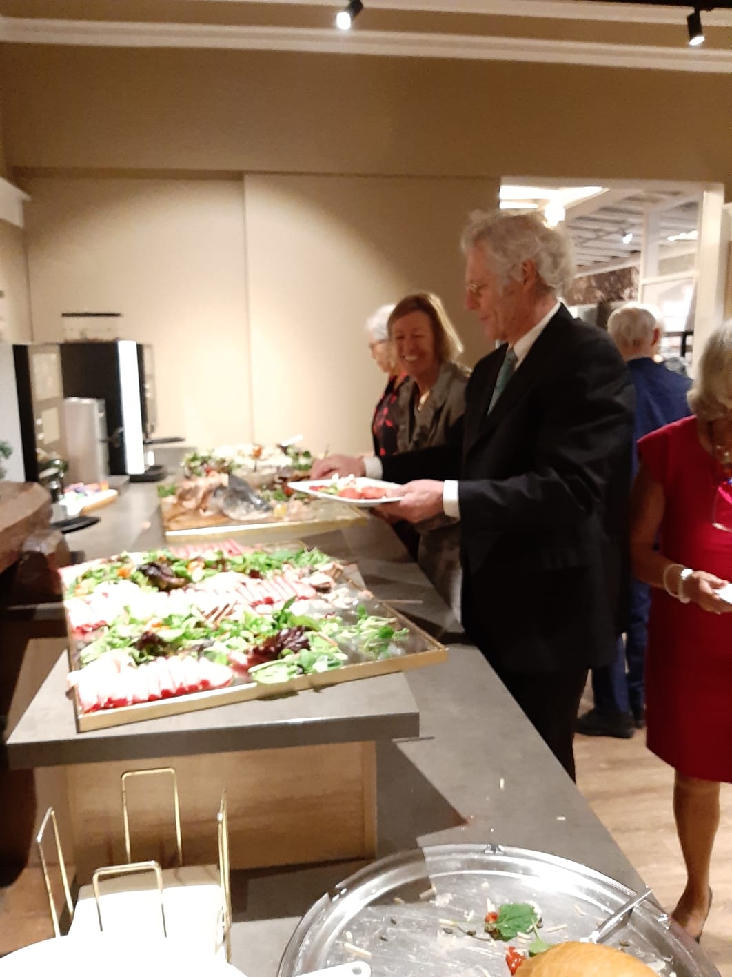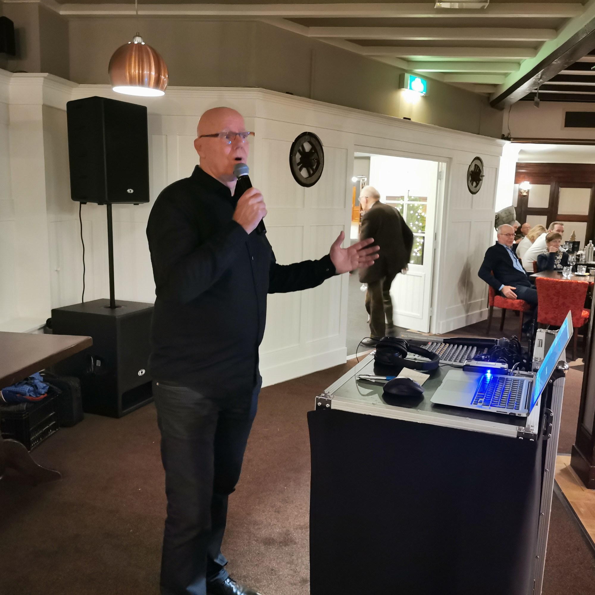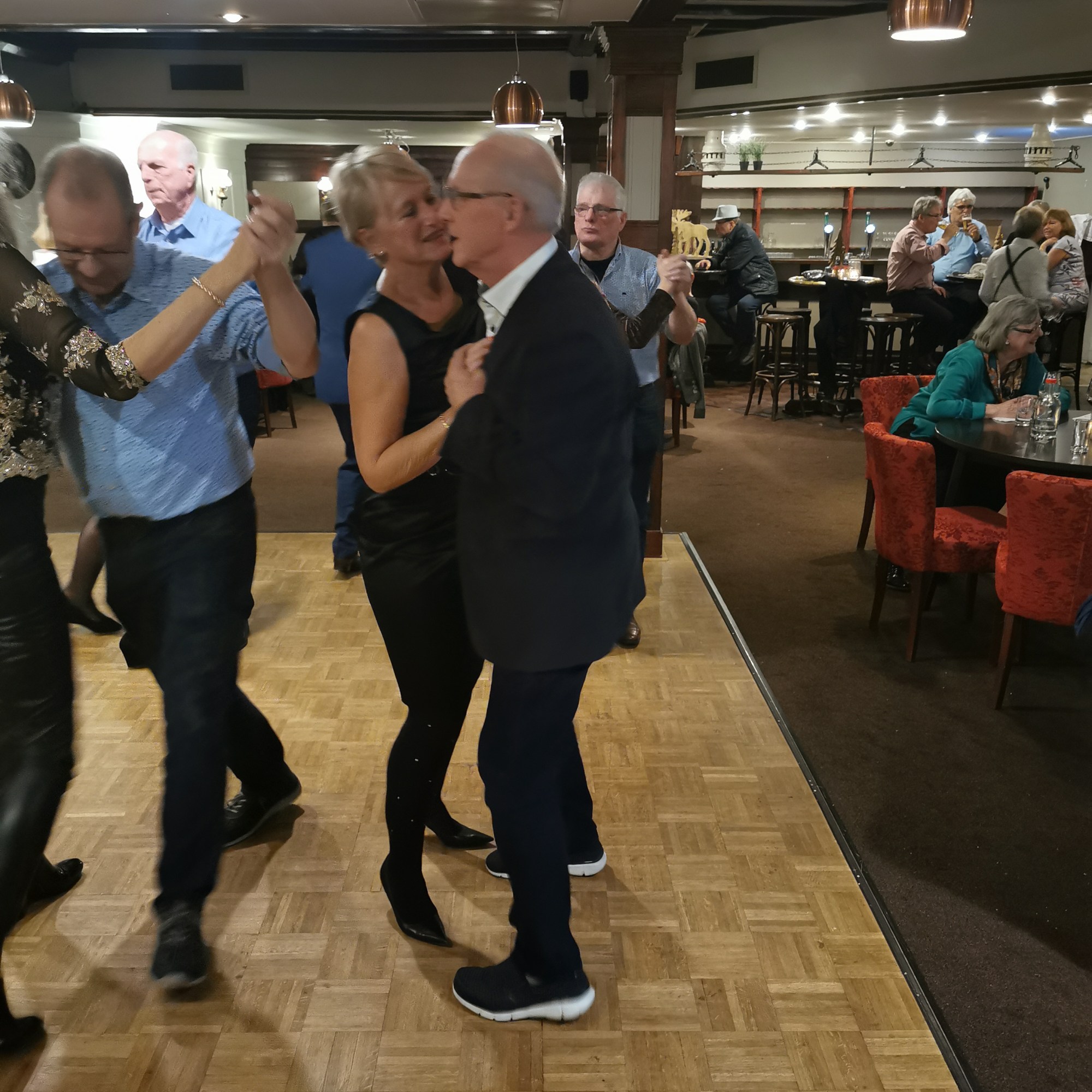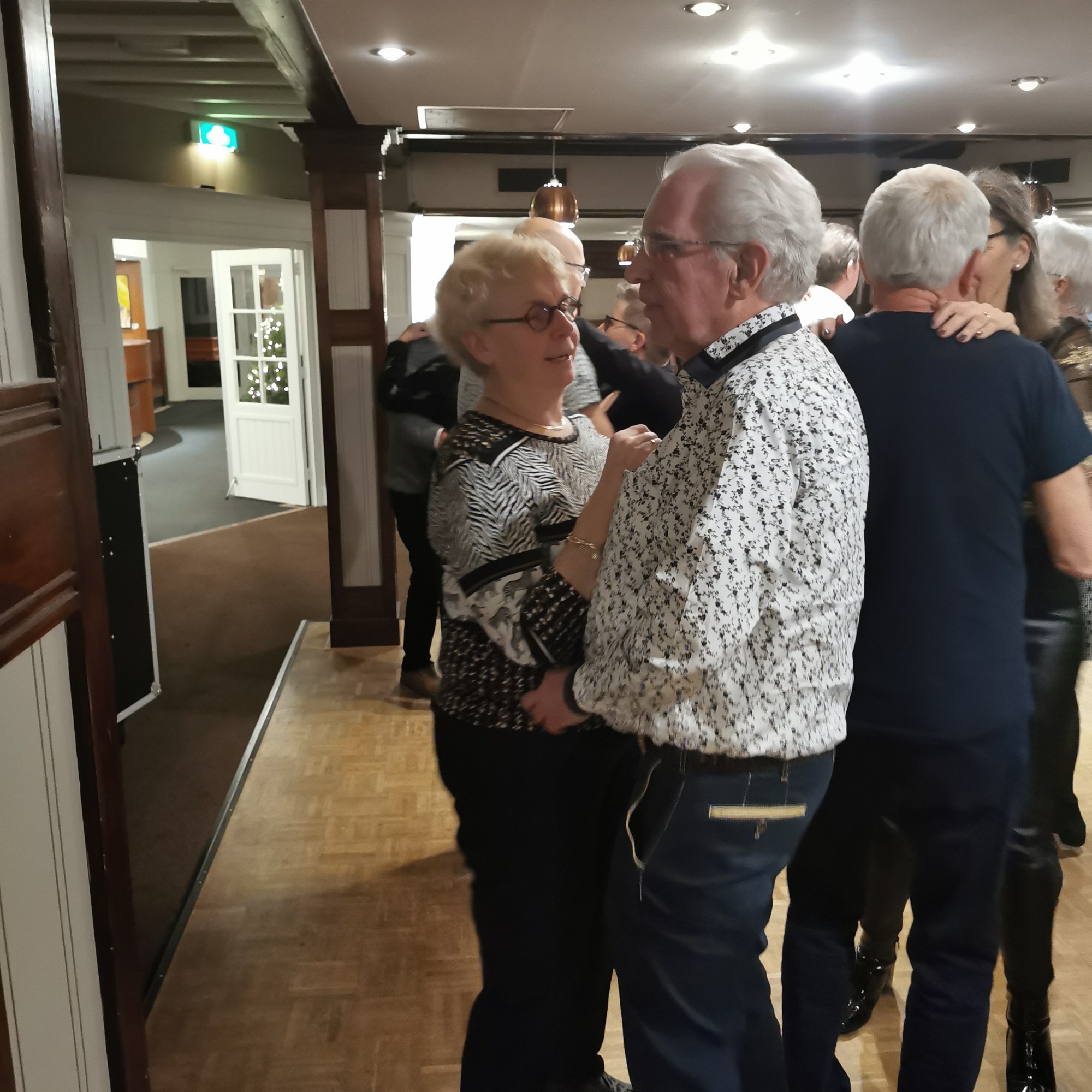Om 19.00 uur zit iedereen met feestelijke kleding aan tafel en kan het feest beginnen. Het voorgerecht van ossenstaartbouillon met brood wordt aan tafel geserveerd, waarna iedereen tafel voor tafel gebruik kan maken van het uitgebreide buffet. Ab, onze muziekman voor vanavond, heeft al zijn spullen al klaargezet en eet gezellig met ons een hapje mee. Daarna start de muziek en na het dessert komen de eerste gasten al op de dansvloer.