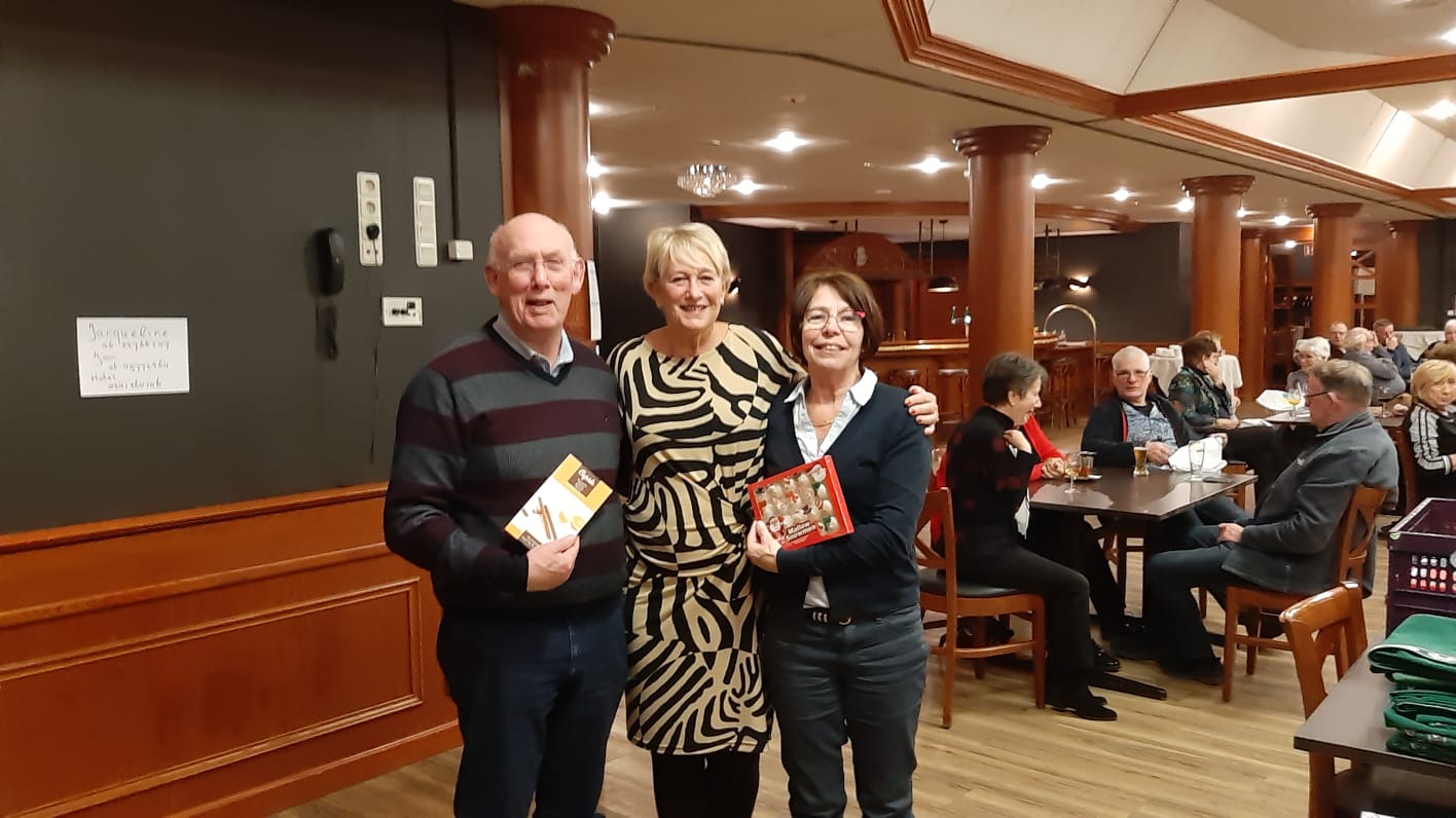 Het paar dat het dichts boven de 42% scoorde heeft weer een kleinigheidje gekregen, dit keer waren dit Klasina en Marianne. De winnaars in de A-lijn zijn Henk van Bree en Piet van Herten geworden met maar liefs 68,45 %. De winnaars in de B lijn zijn Anna Wilschut met haar partner met 63,99 %.